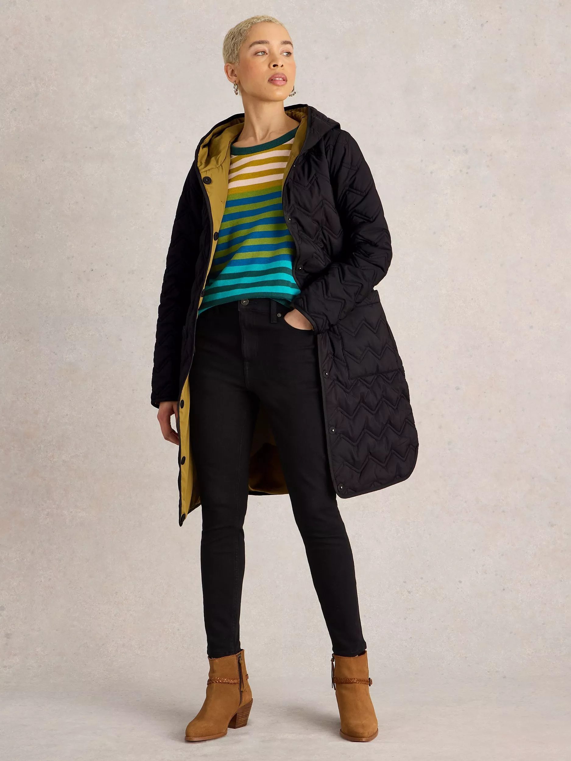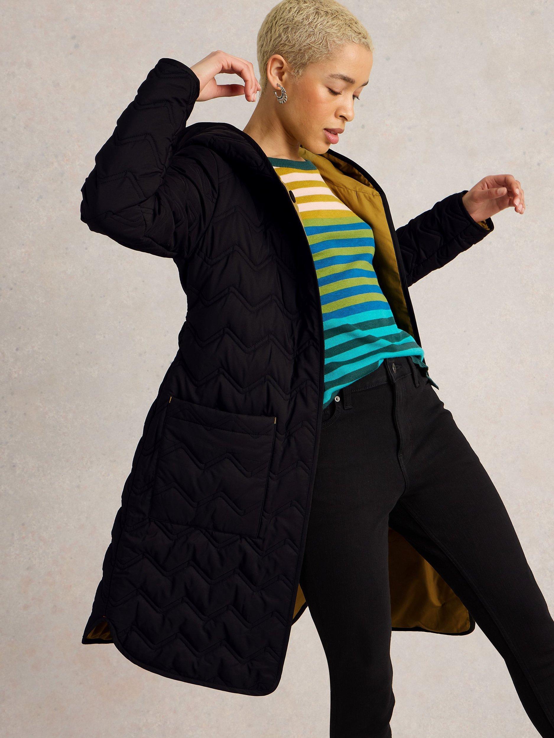 Quilted for cosy layering on days that require protection from the elements, this coat from White Stuff comes in a longer length.
