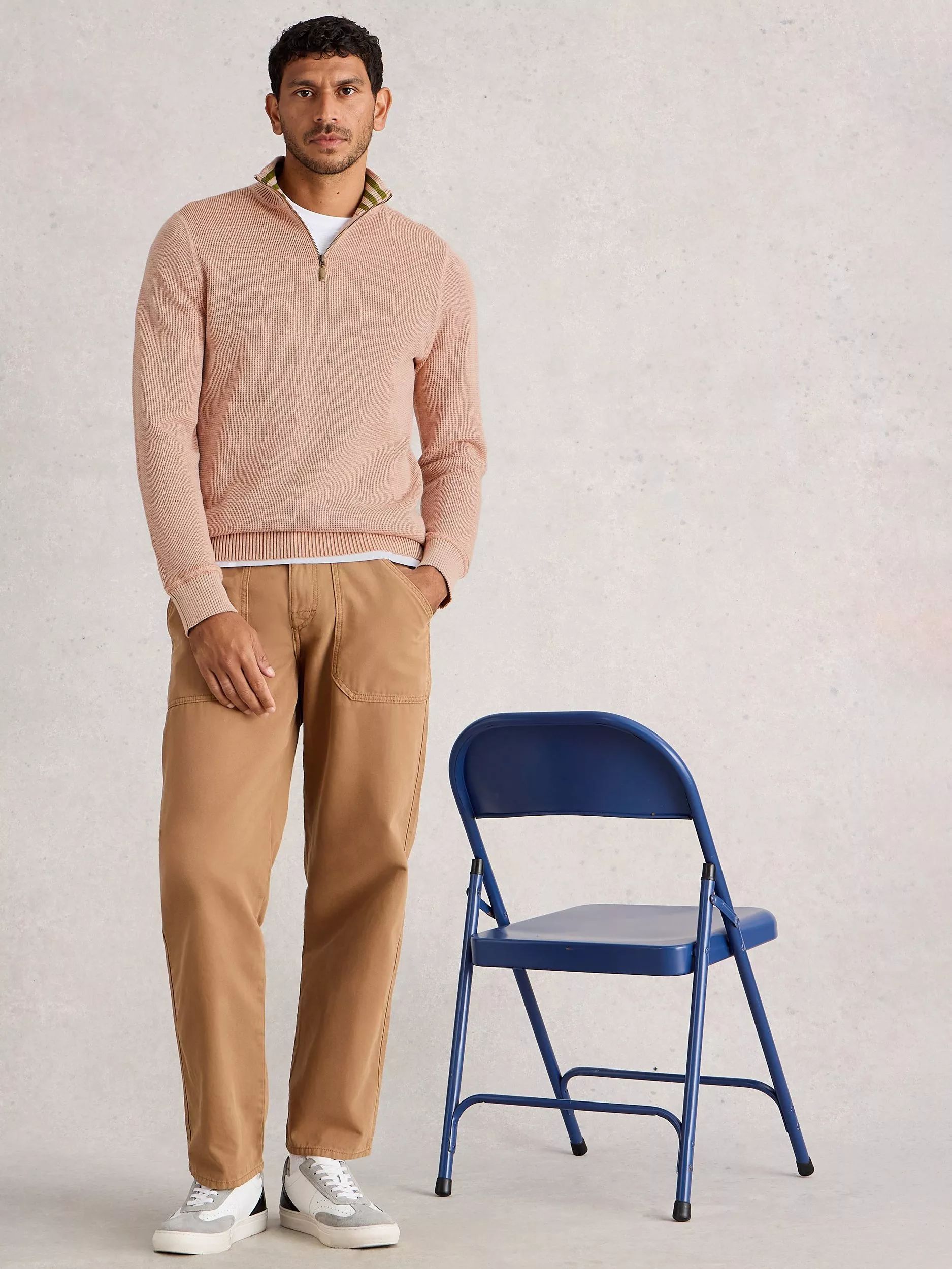 A comfy funnel-neck knit in a statement teal shade featuring zip detailing and long sleeves.