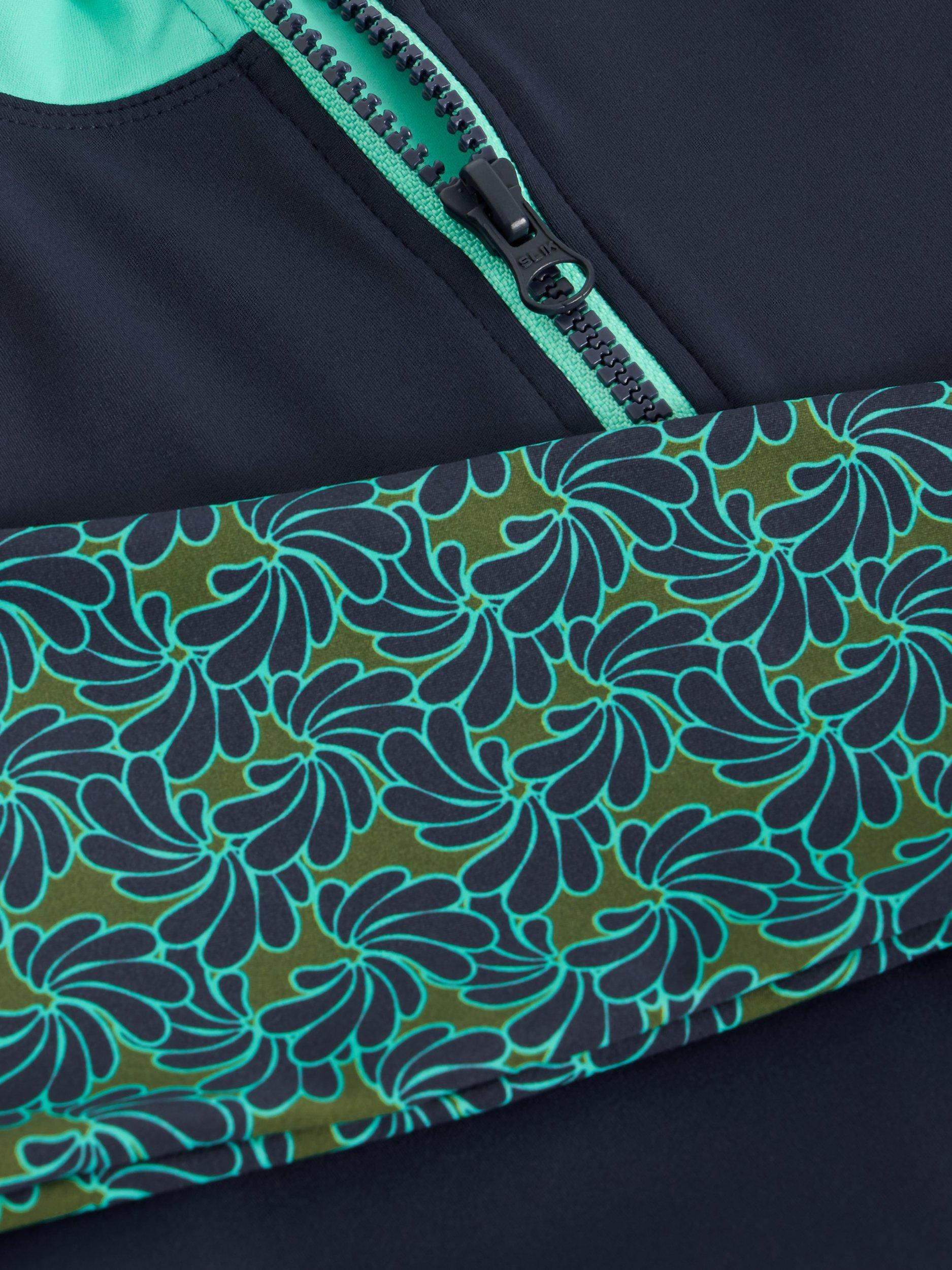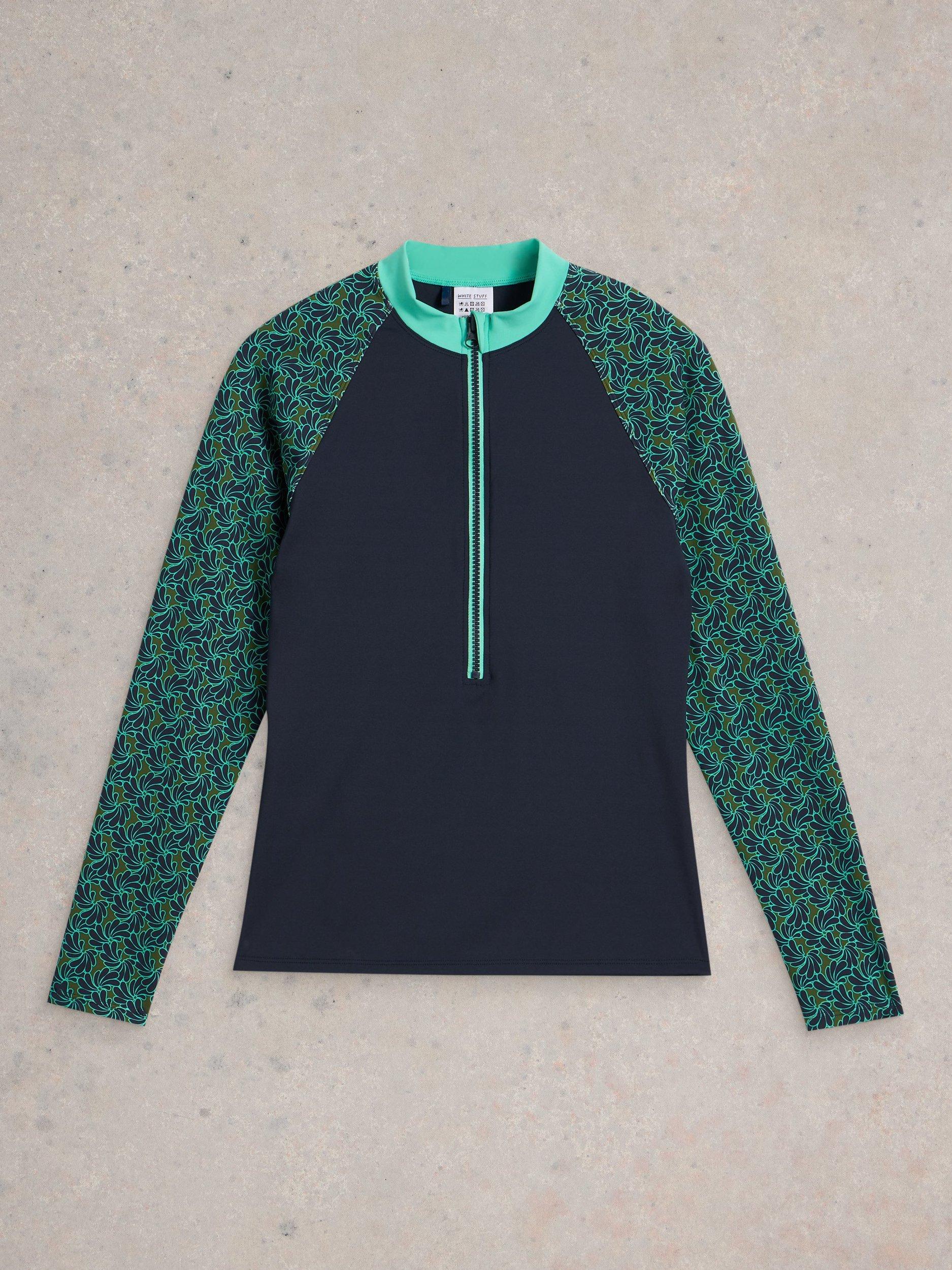 A long-sleeved zip-up swim vest in recycled nylon material.