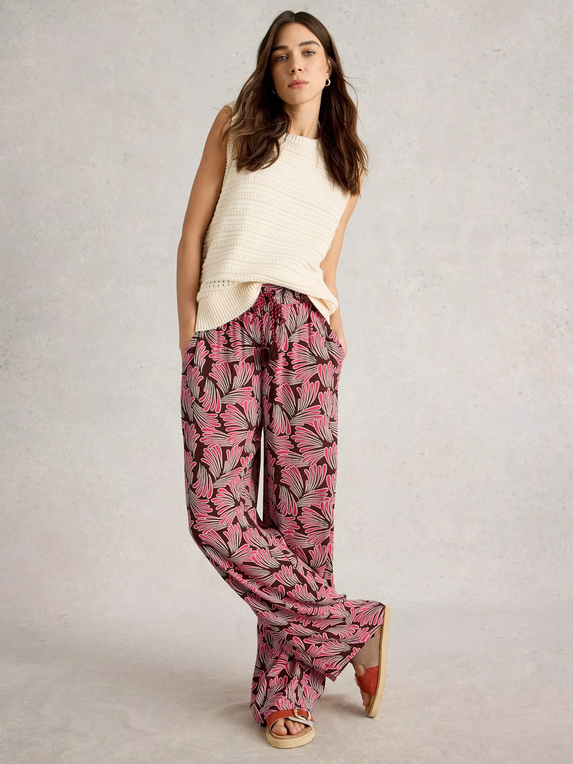 A pair of wide leg trouser in crinkle textured fabric with elasticated waist and drawstring and two side pockets.
