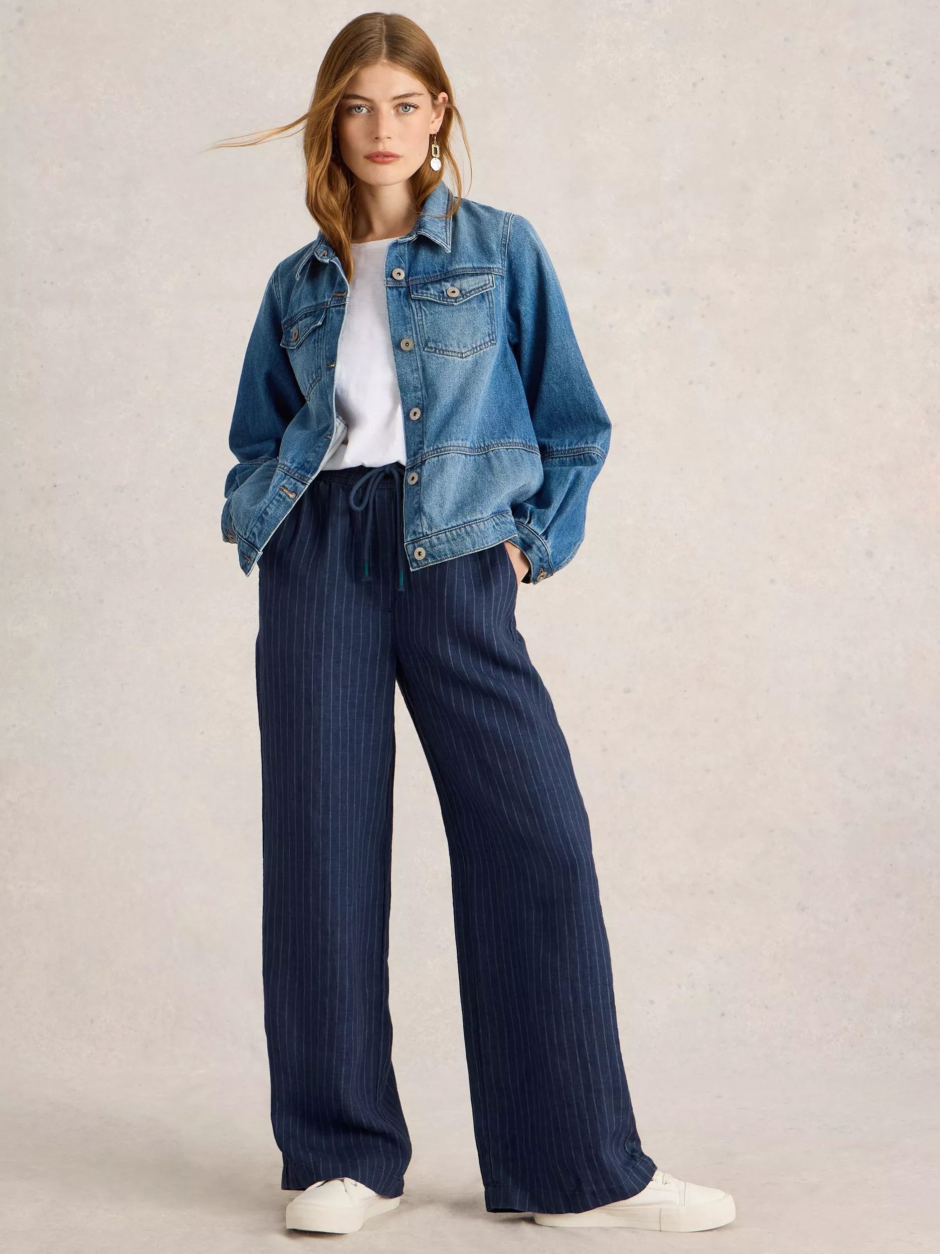 White StuffBelle Stripe Pure Linen Trousers, Navy/Multi