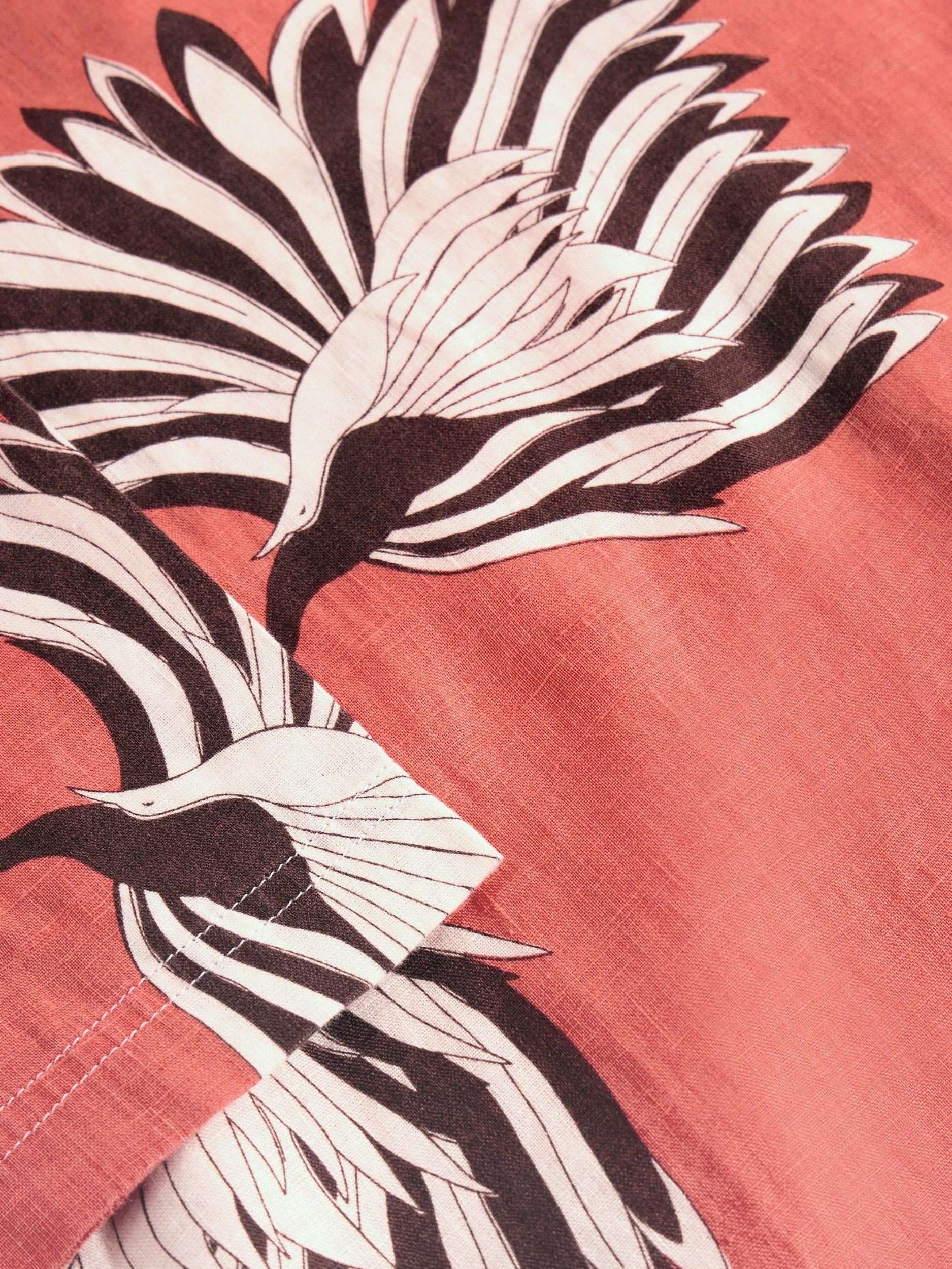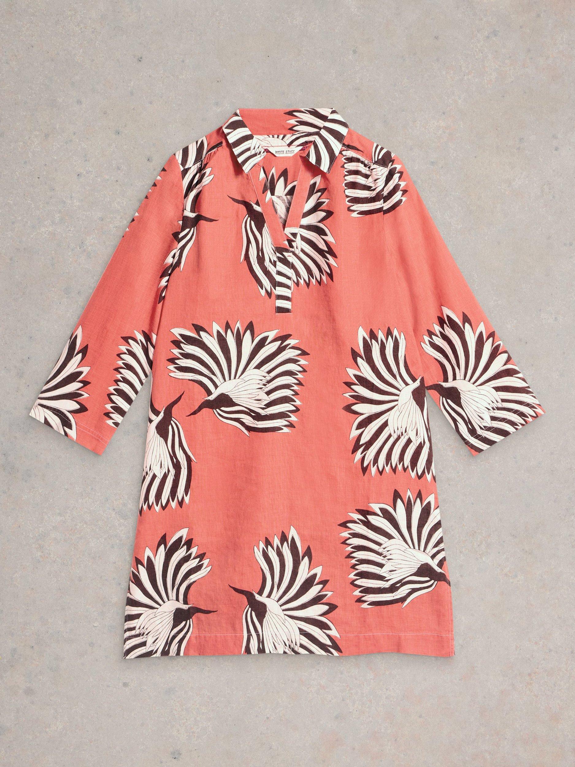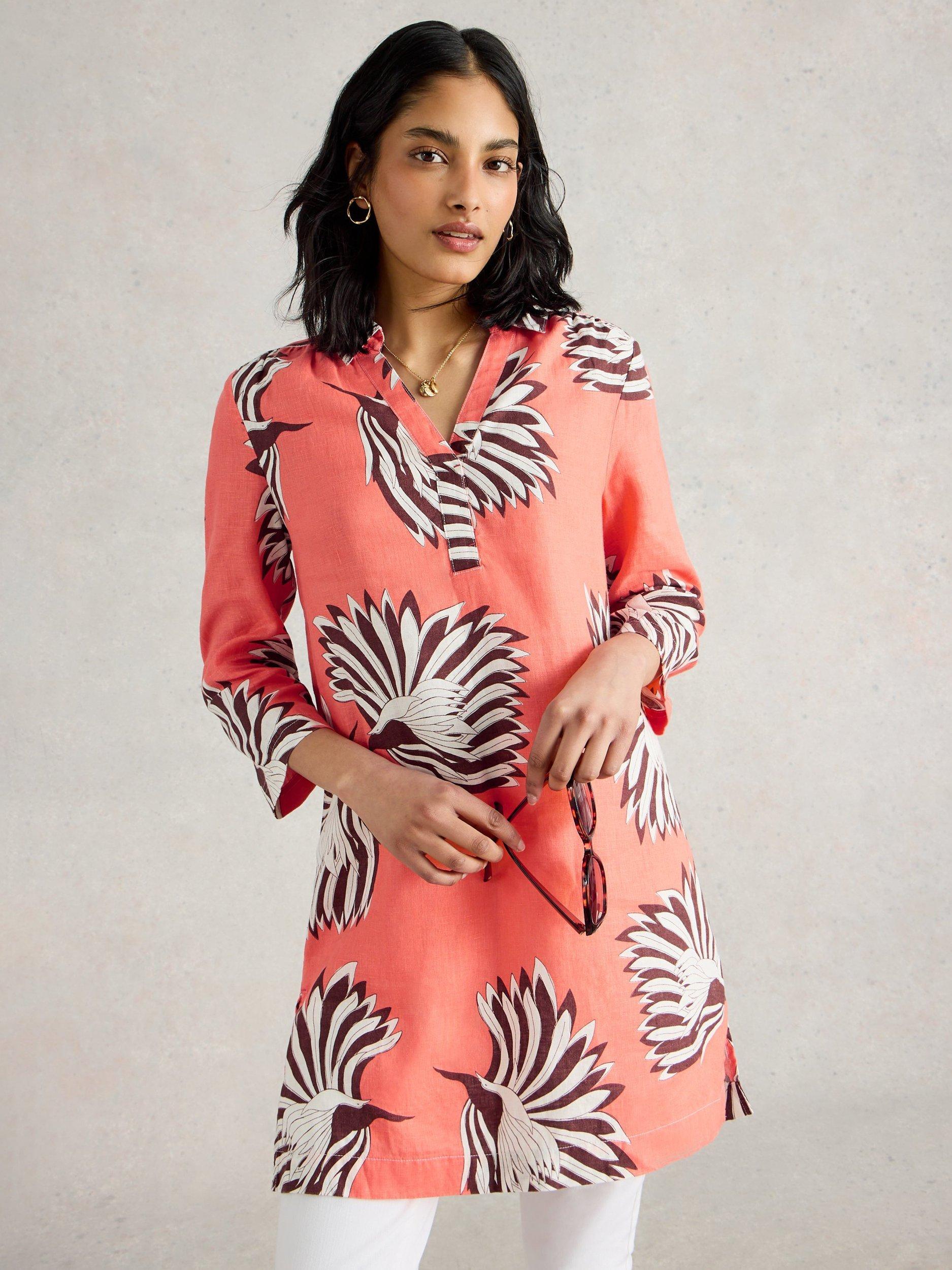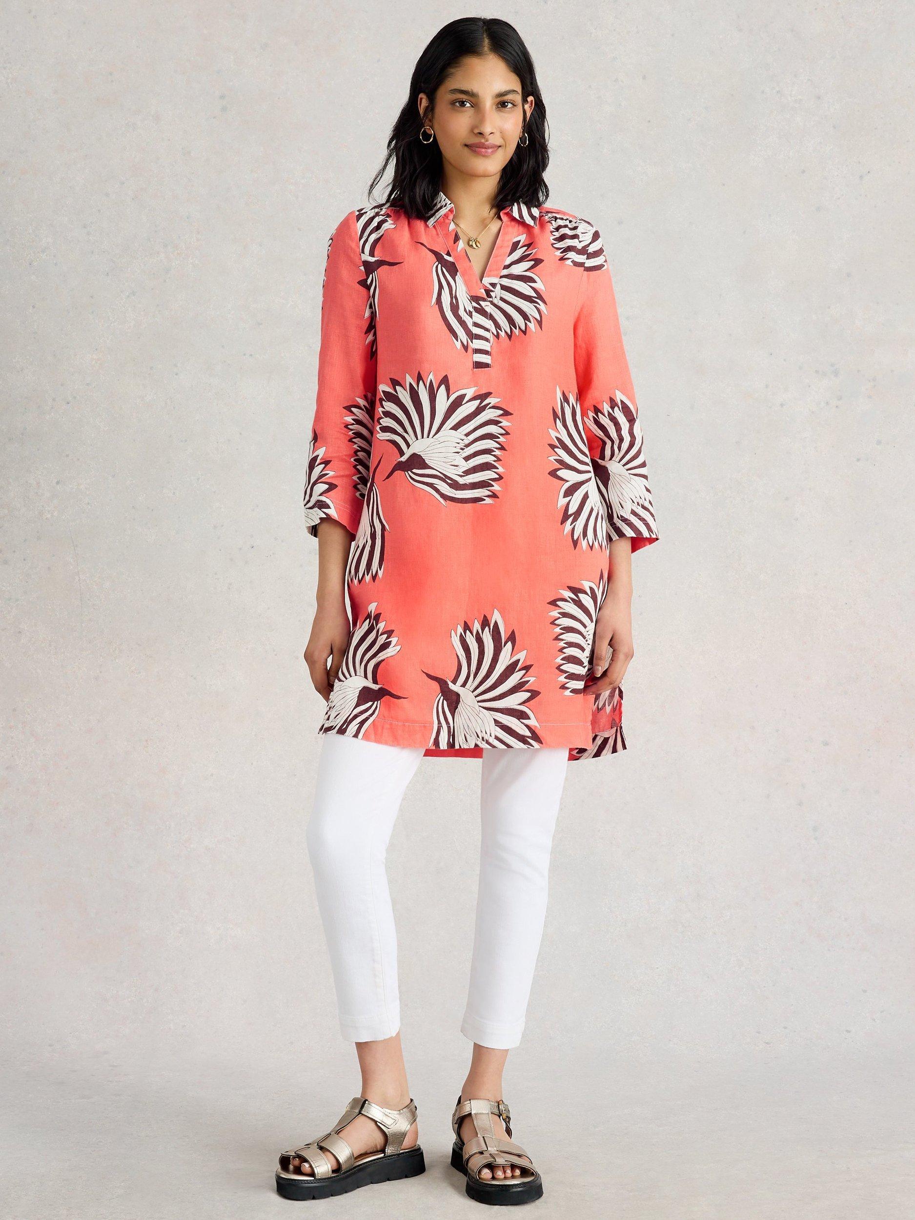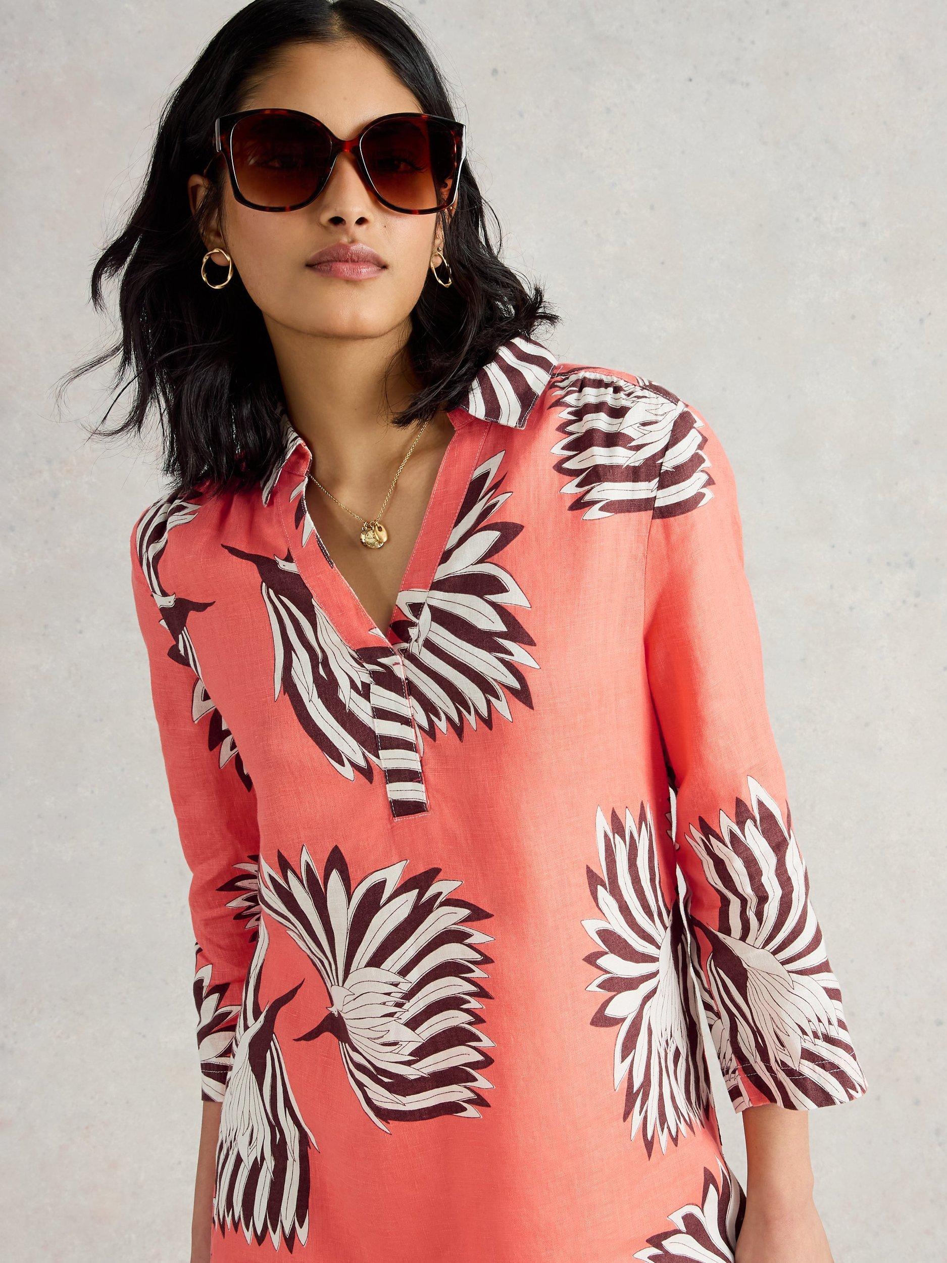 A breezy, printed linen tunic. With a smart collar and three-quarter length sleeves.