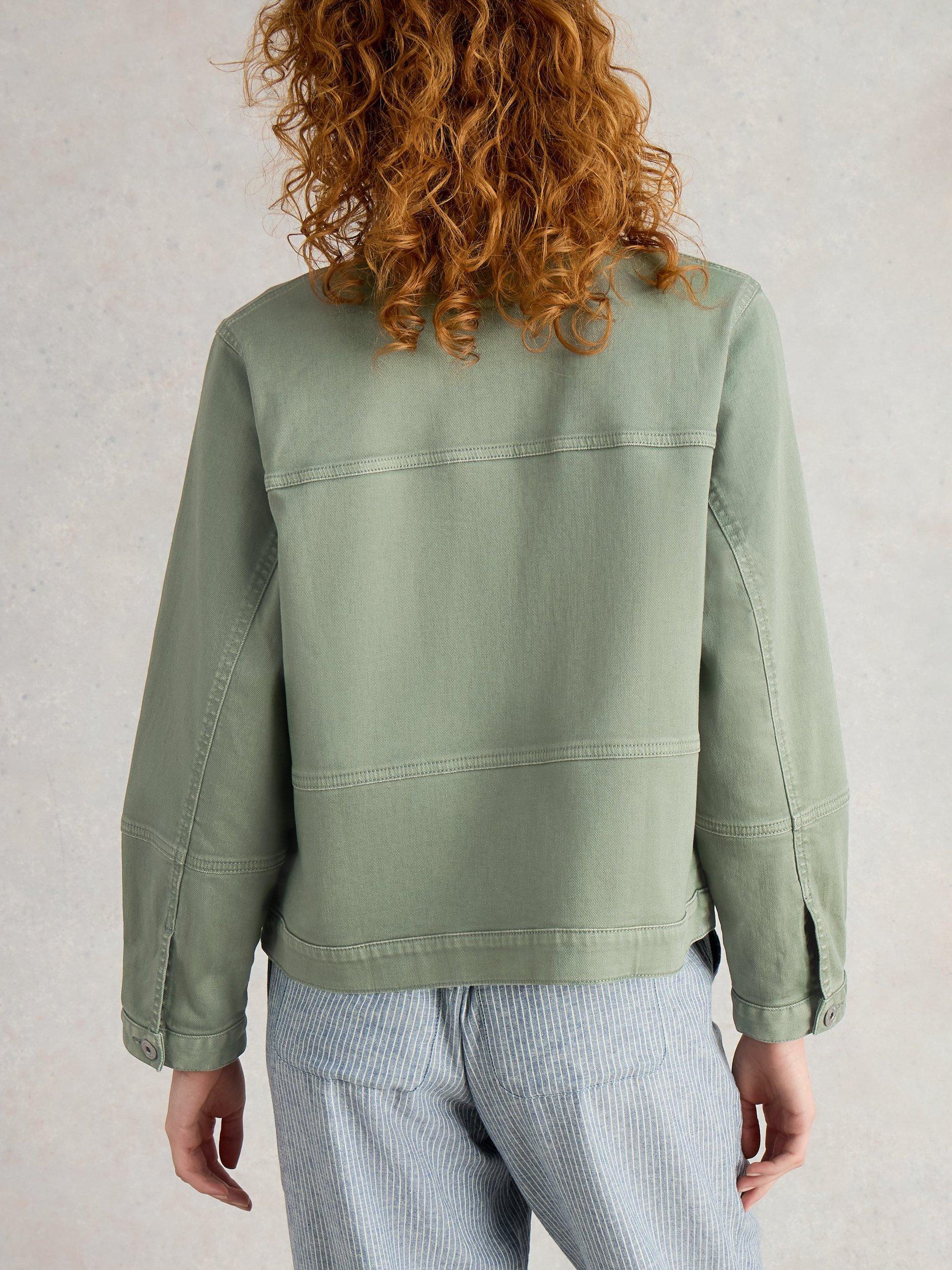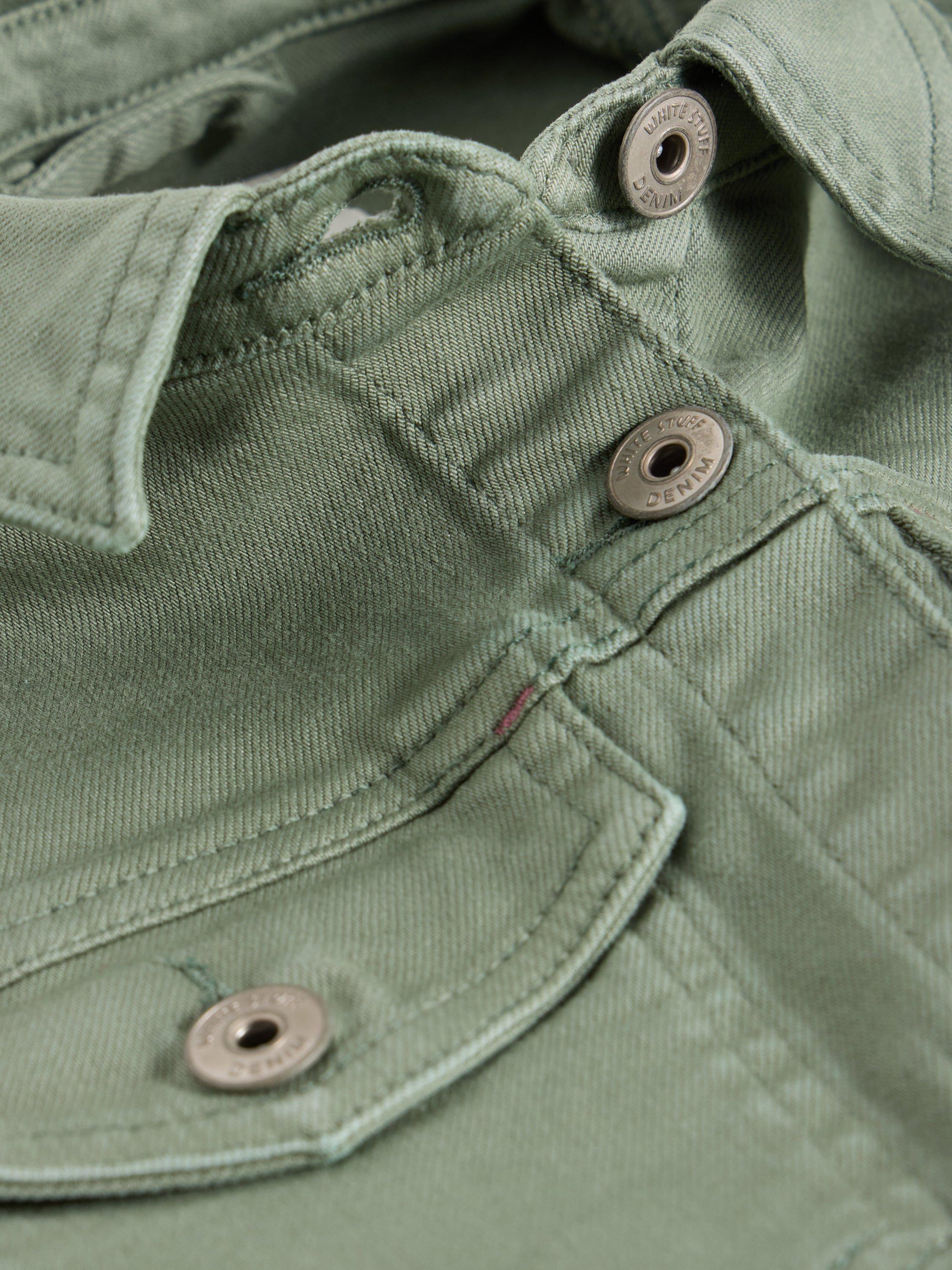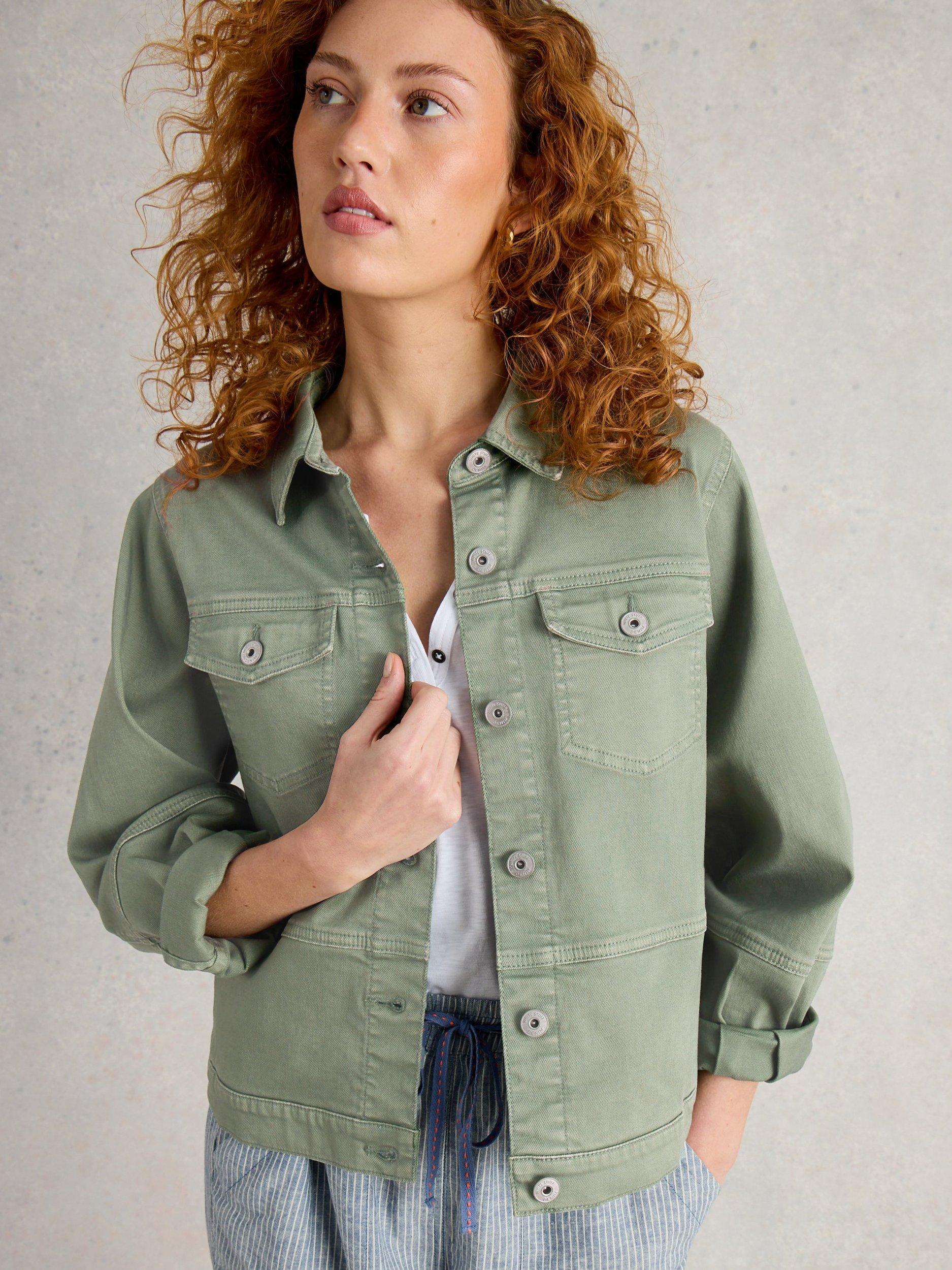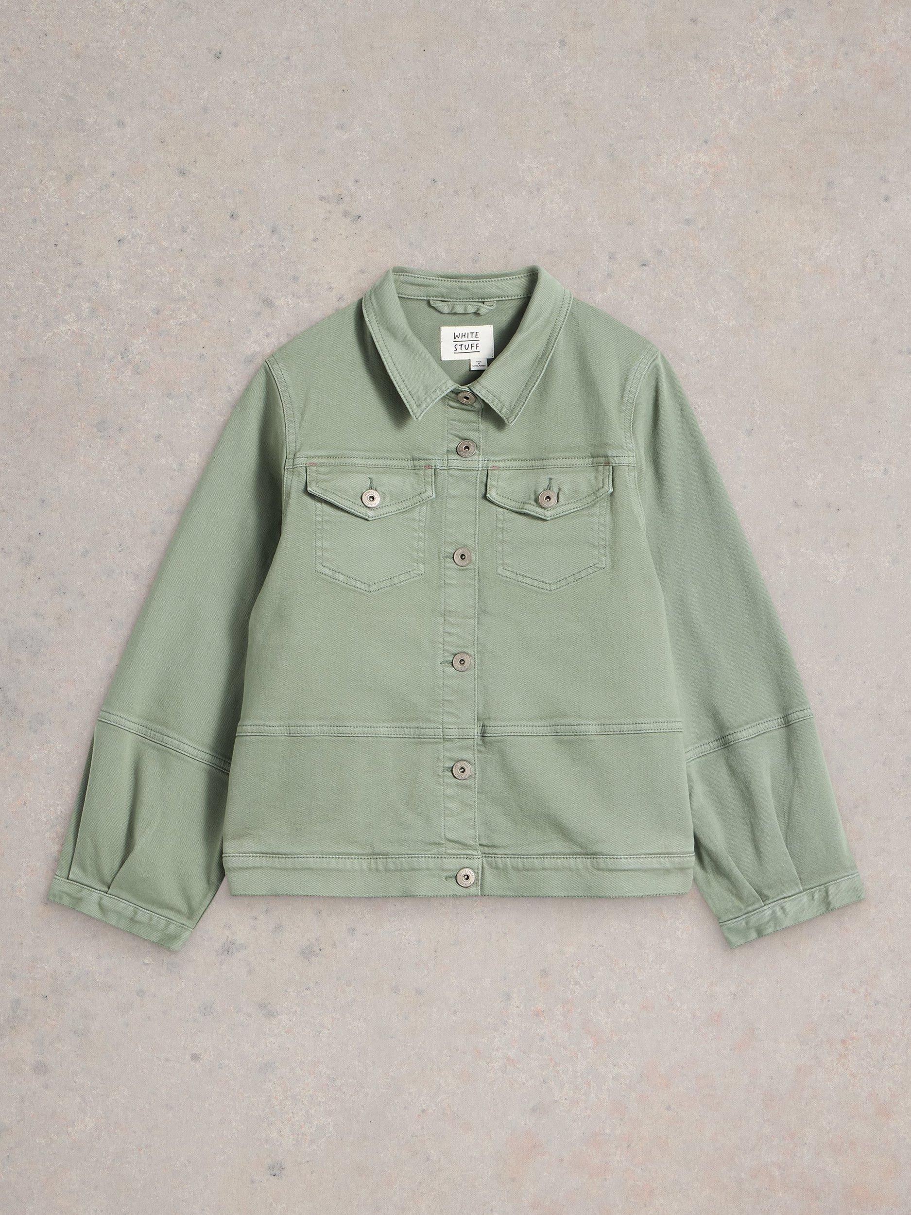 Long-sleeved denim jacket with a button-down front placket and two buttoned chest pockets.