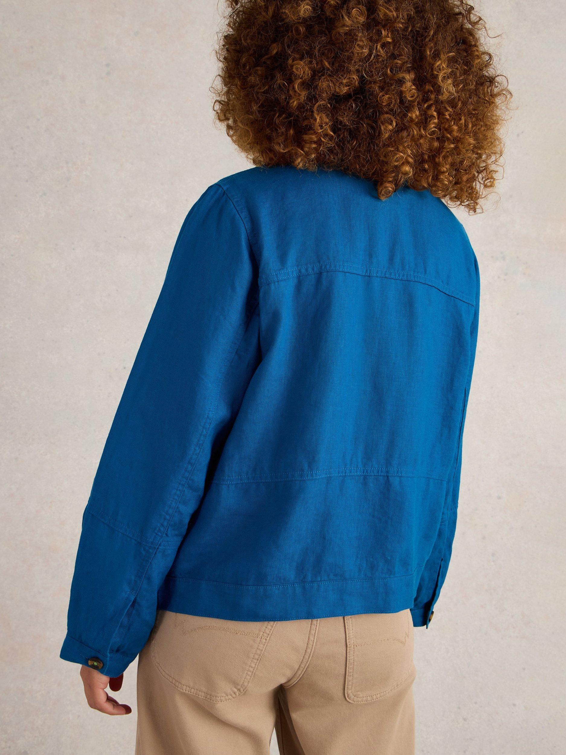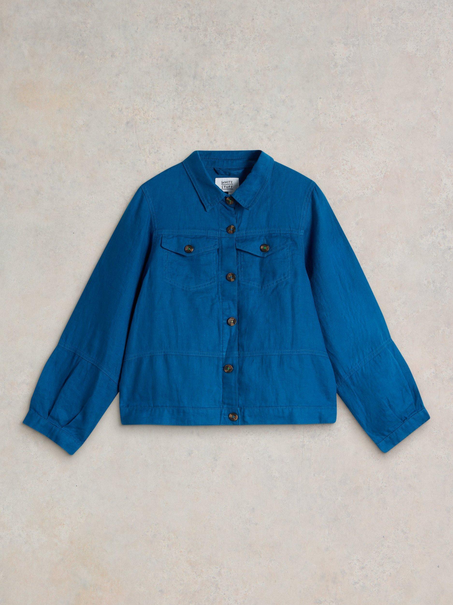 A long sleeve linen jacket with button down front placket and front pockets.