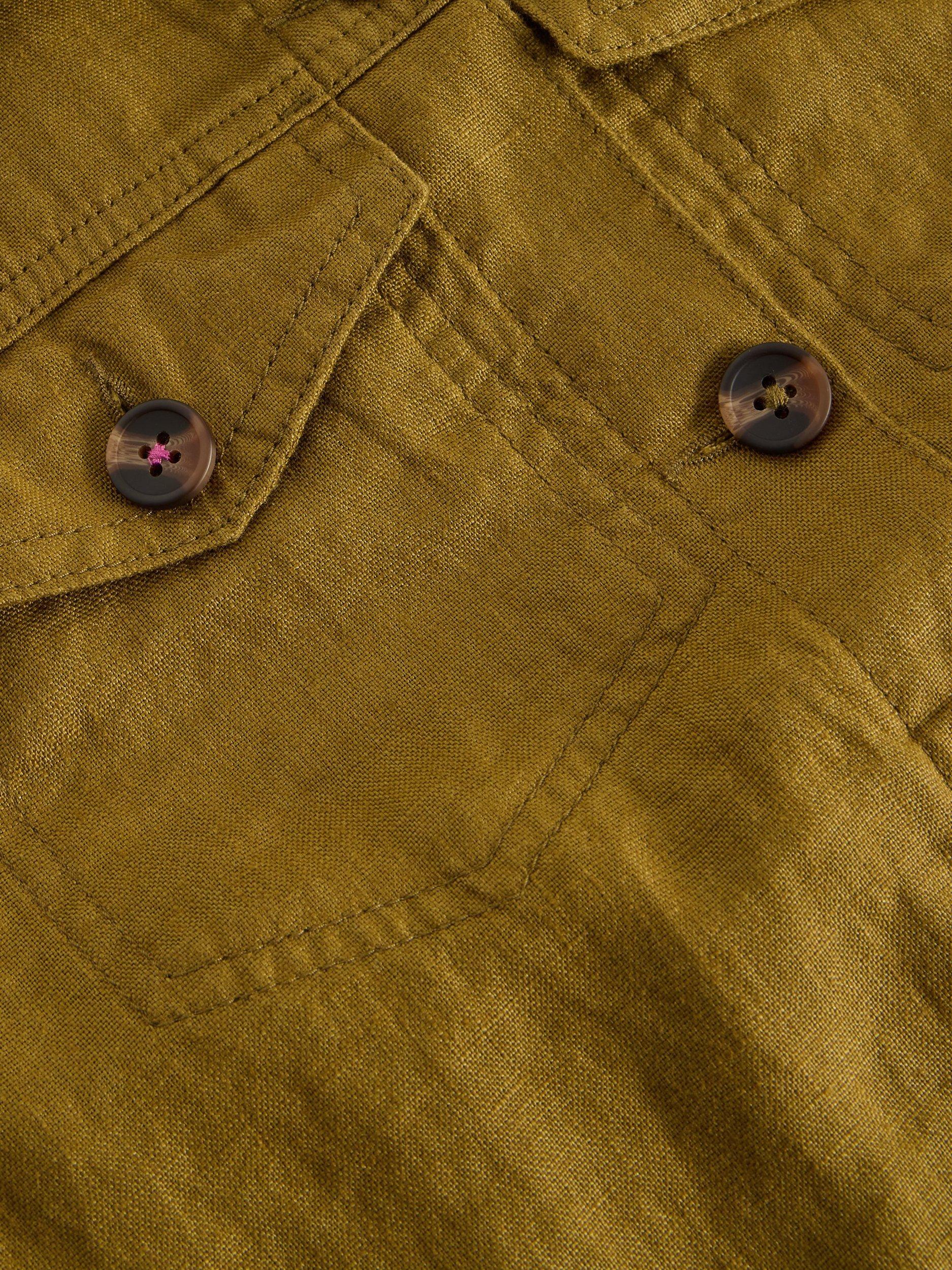 A long sleeve linen jacket with button down front placket and front pockets.