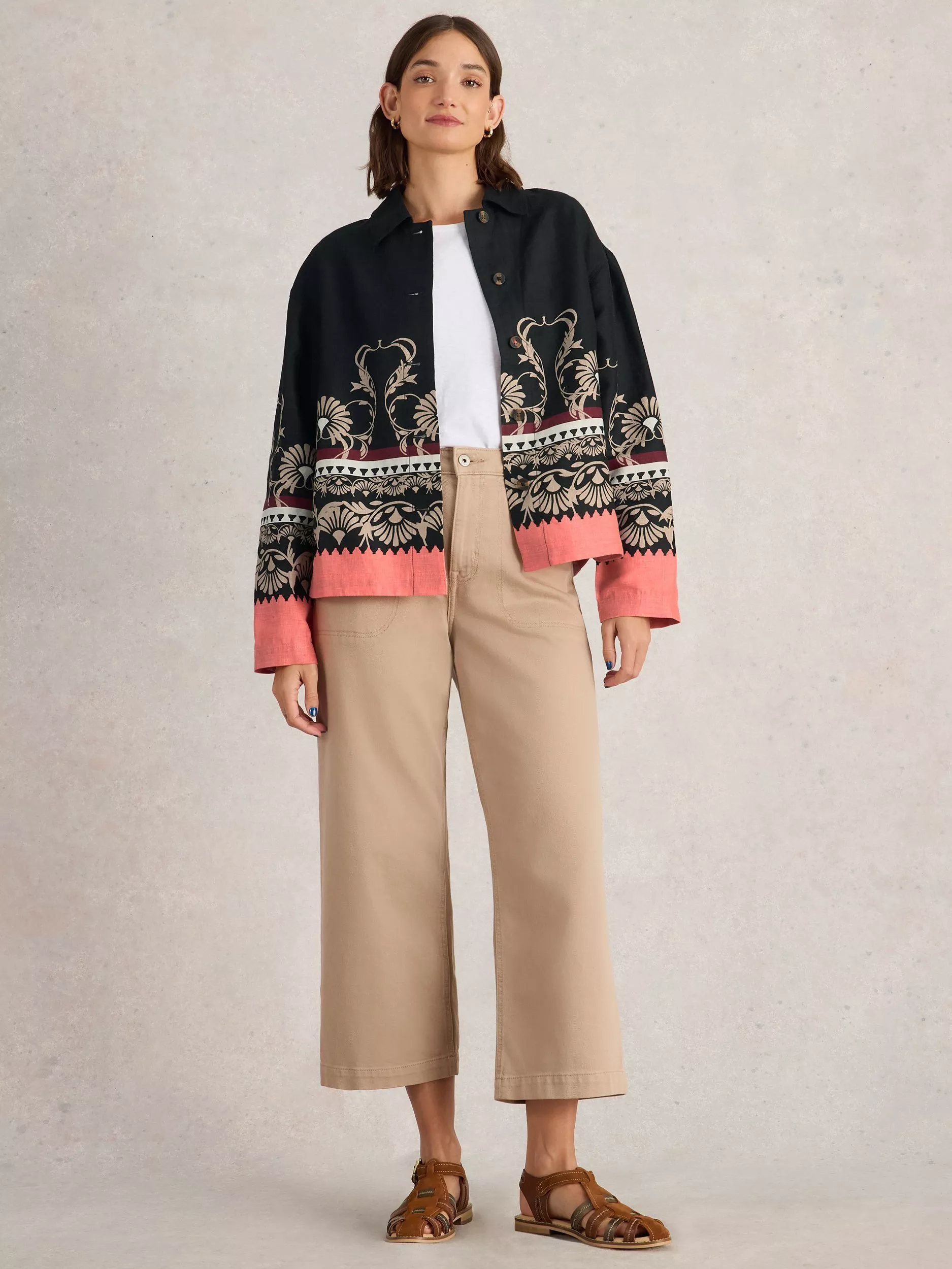 A long-sleeved linen jacket with button-down front placket and front pockets.