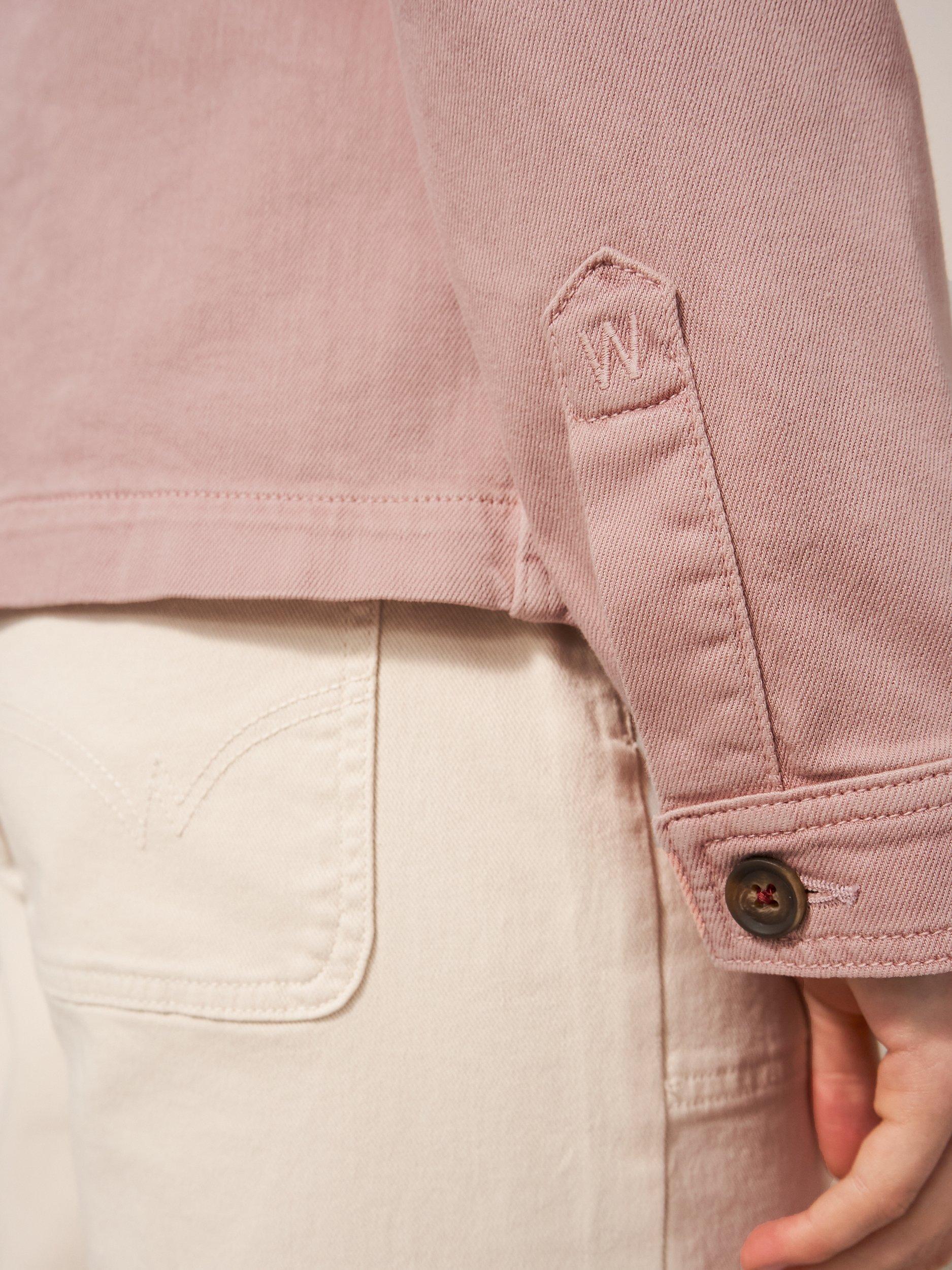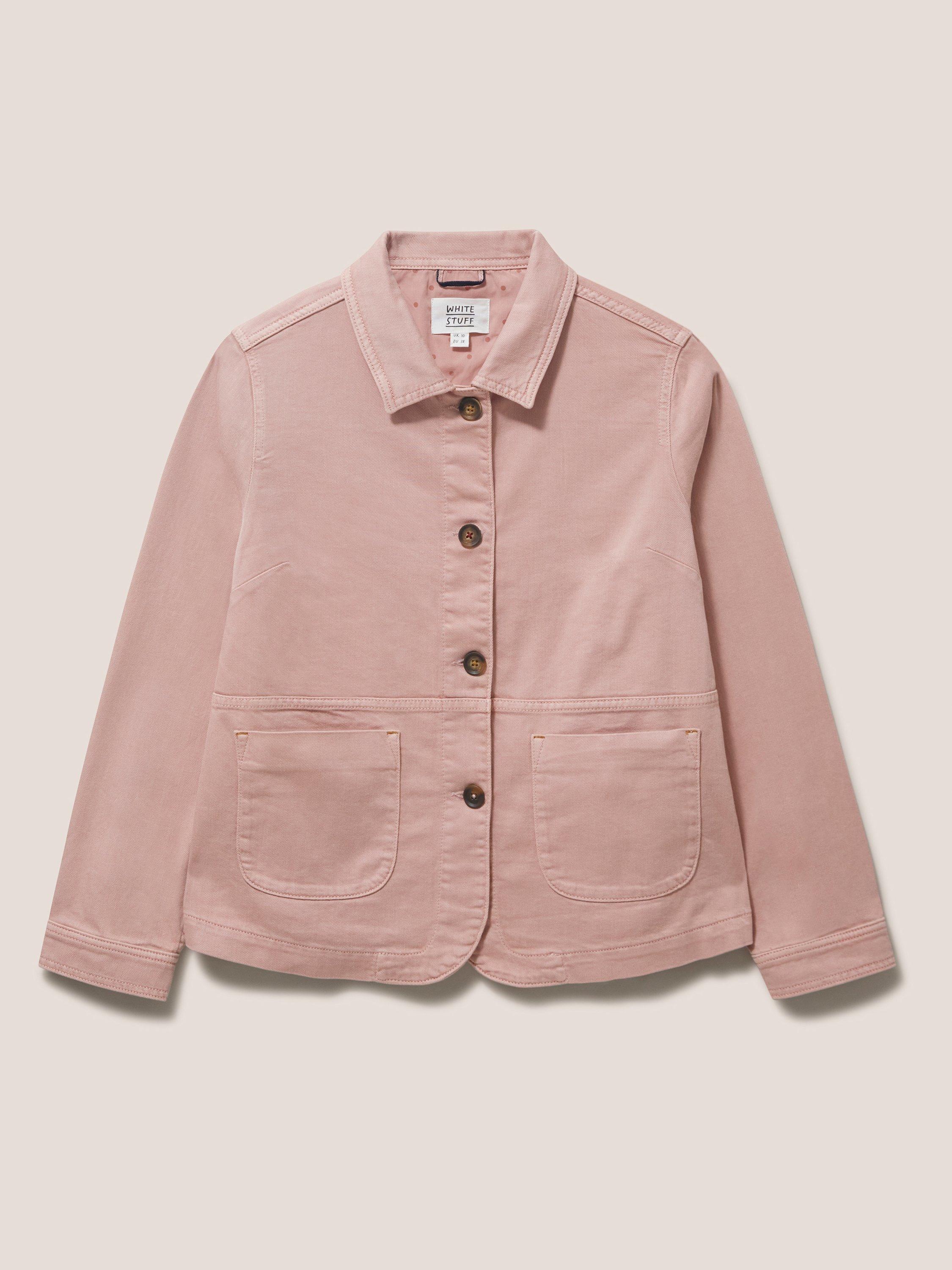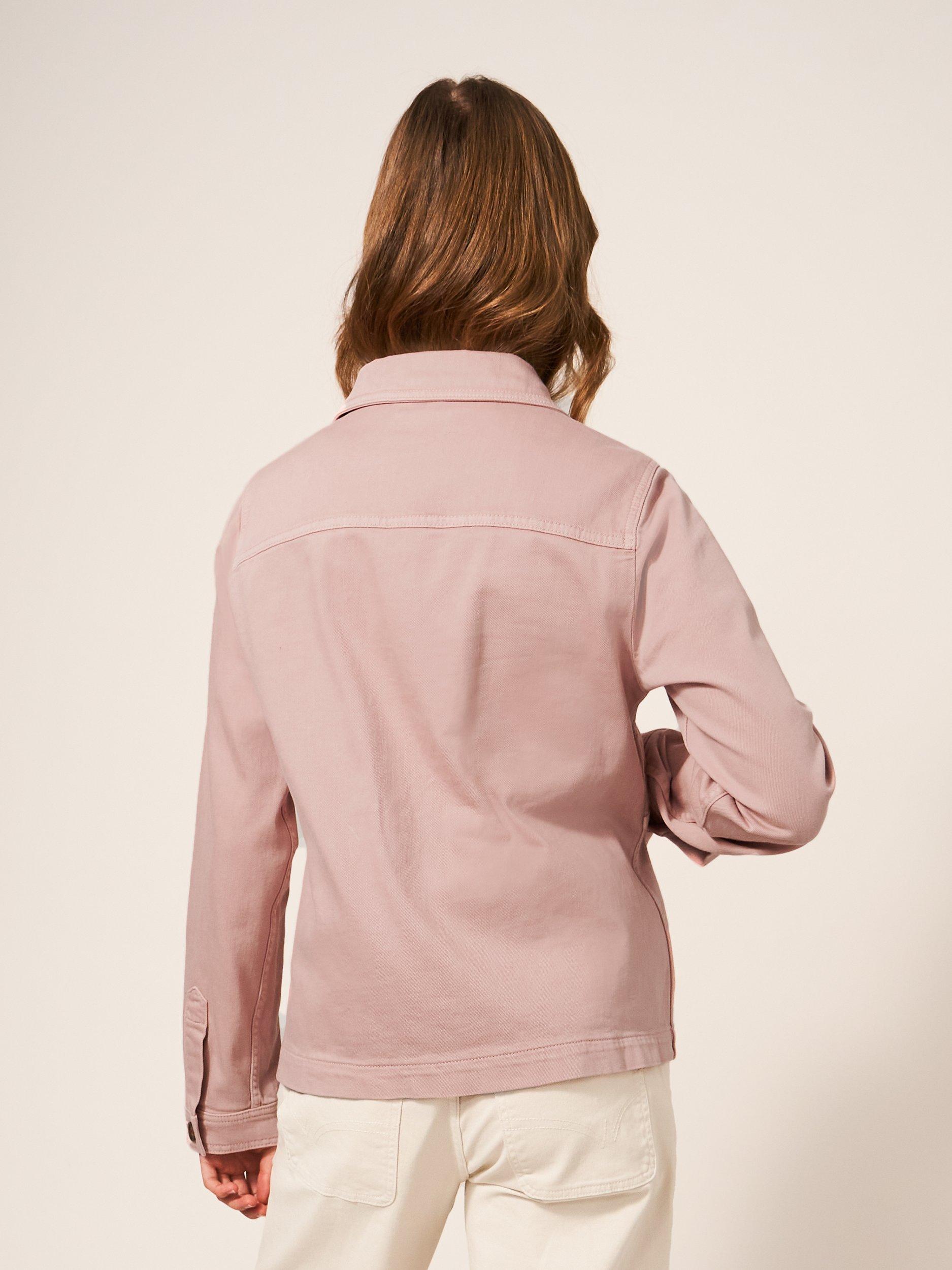 A long sleeve denim jacket with collar and front pockets.