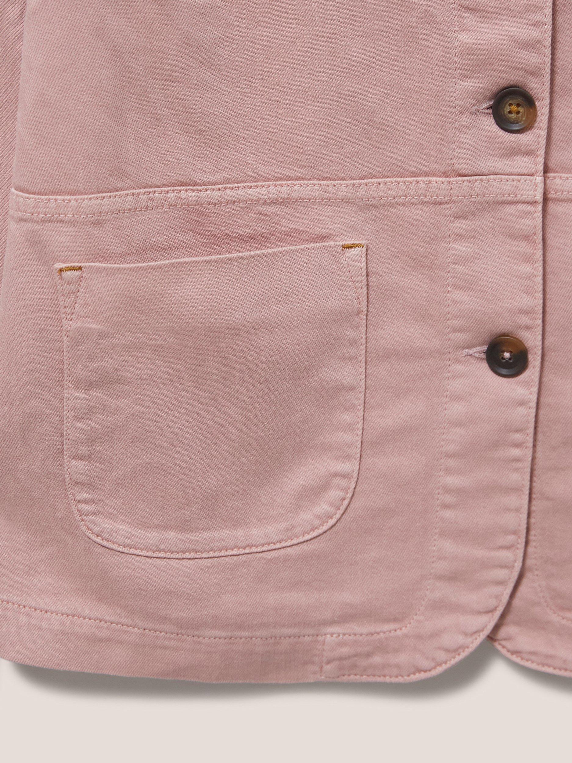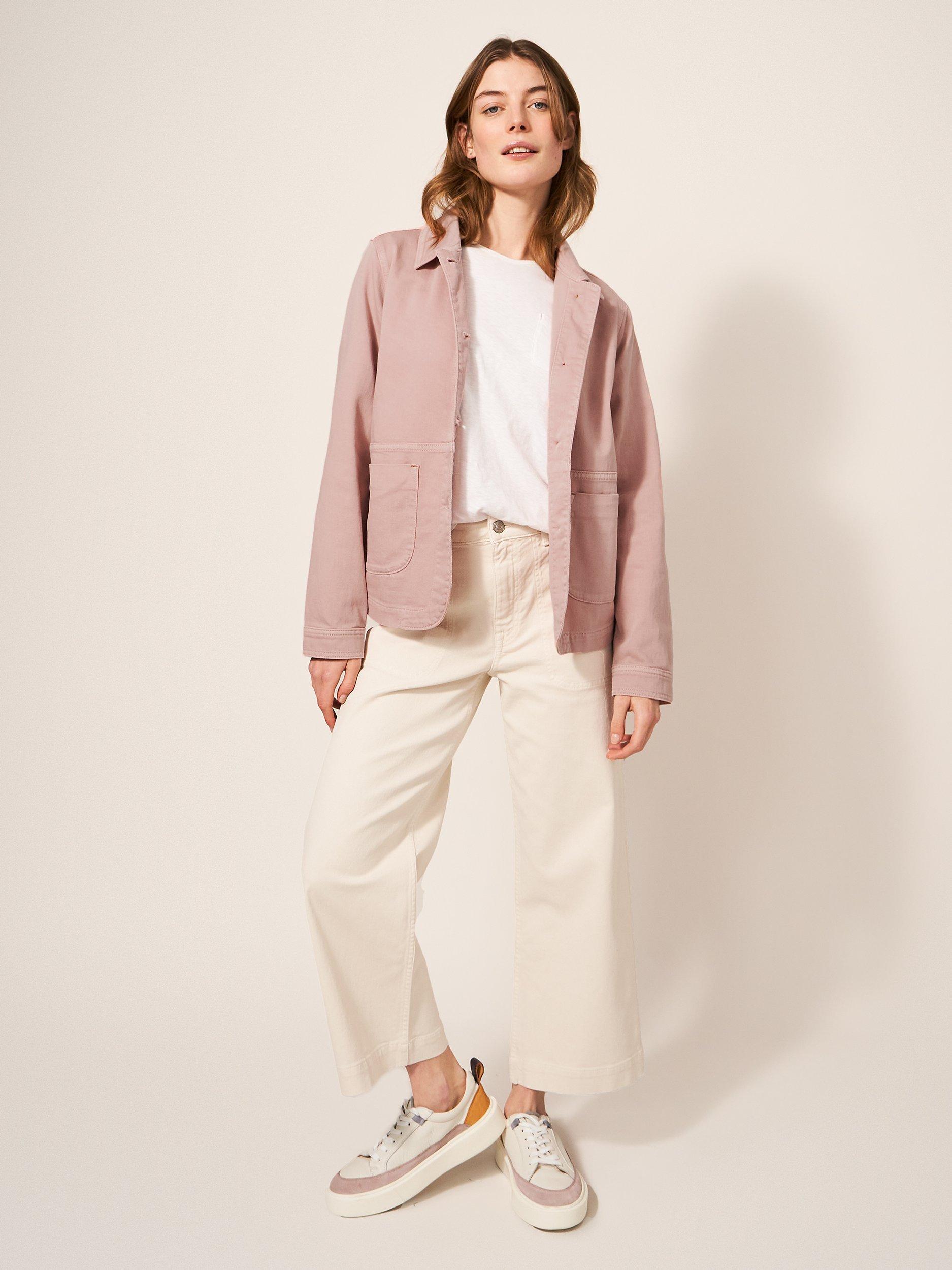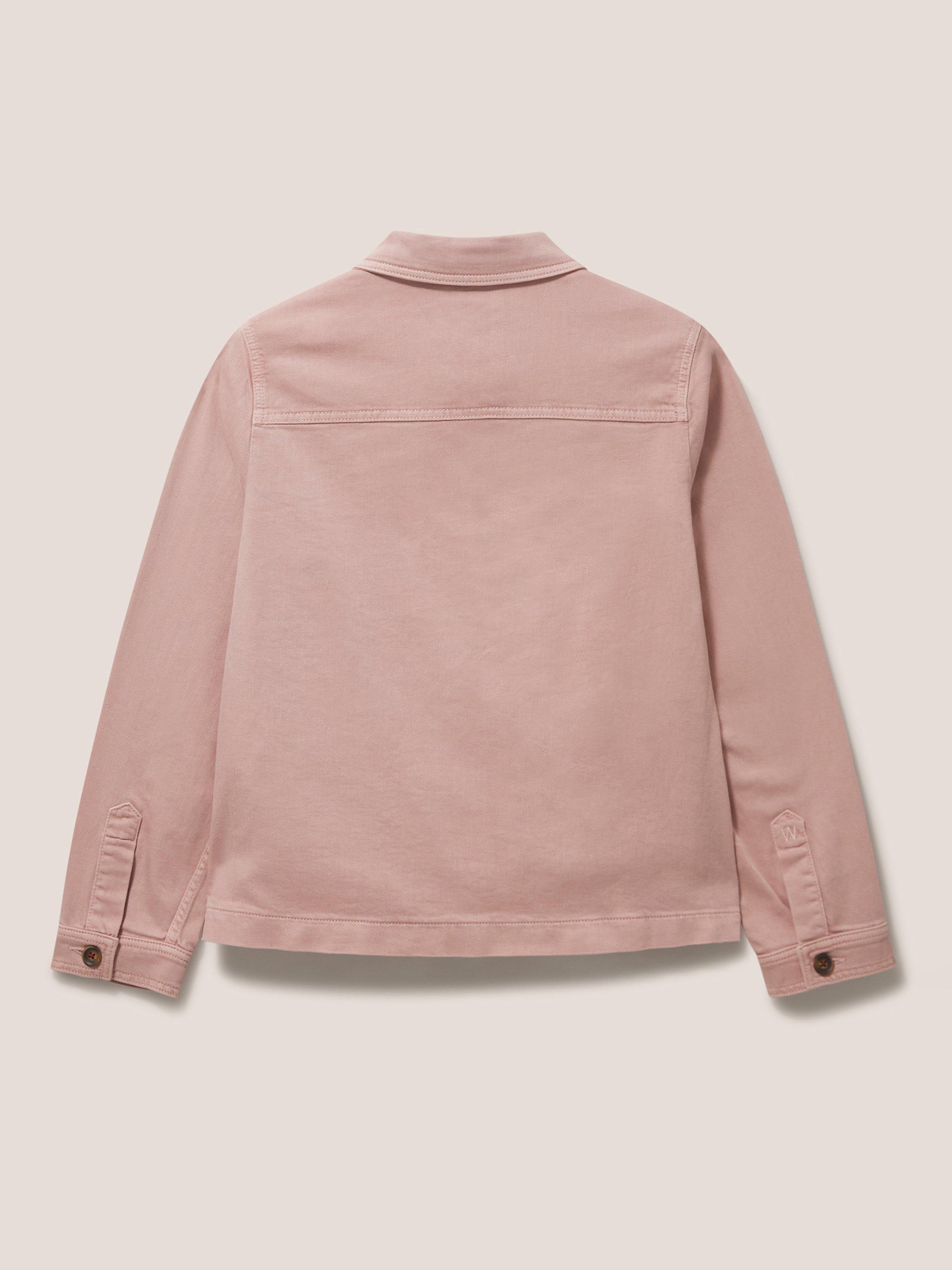 A long sleeve denim jacket with collar and front pockets.
