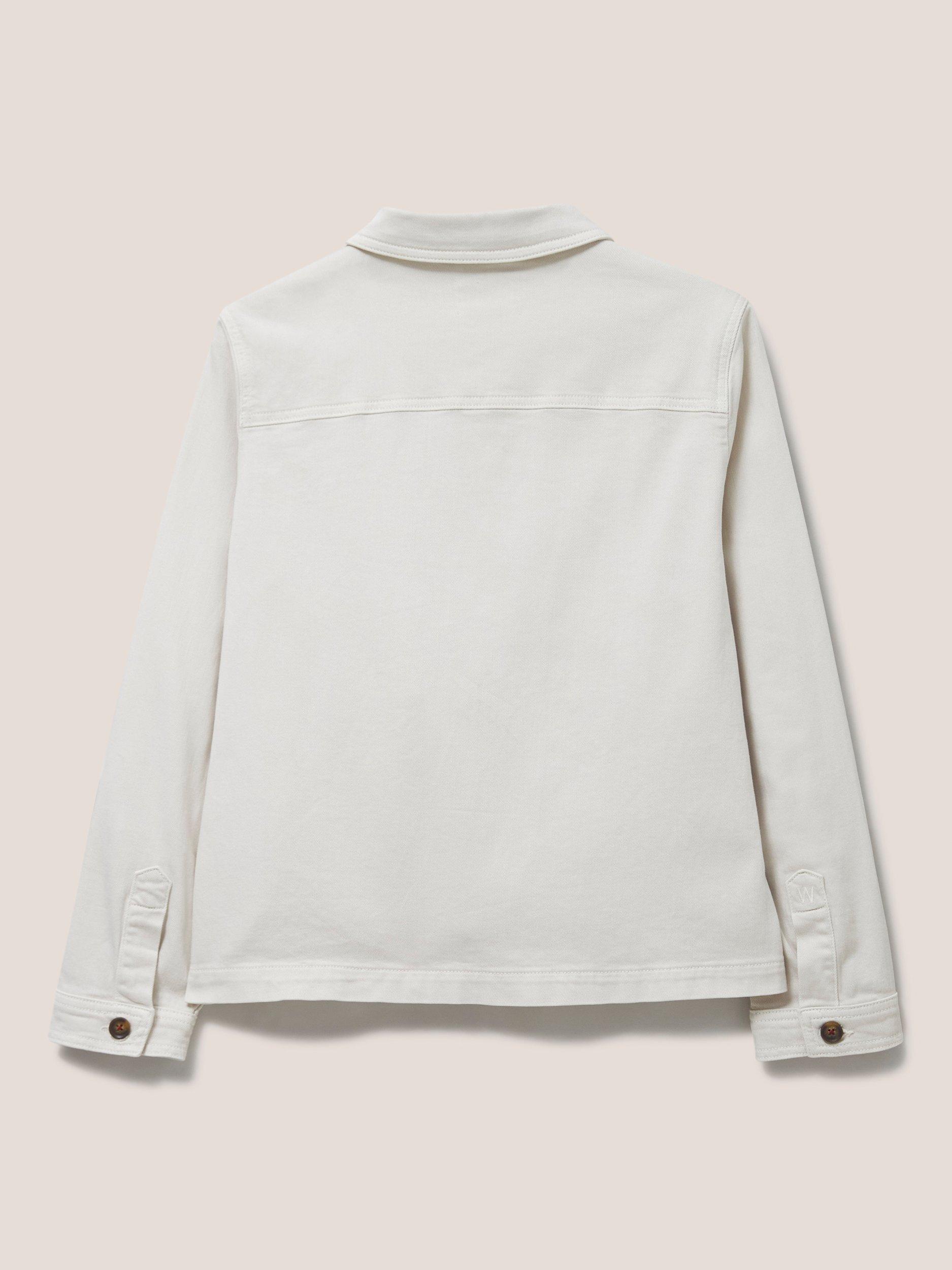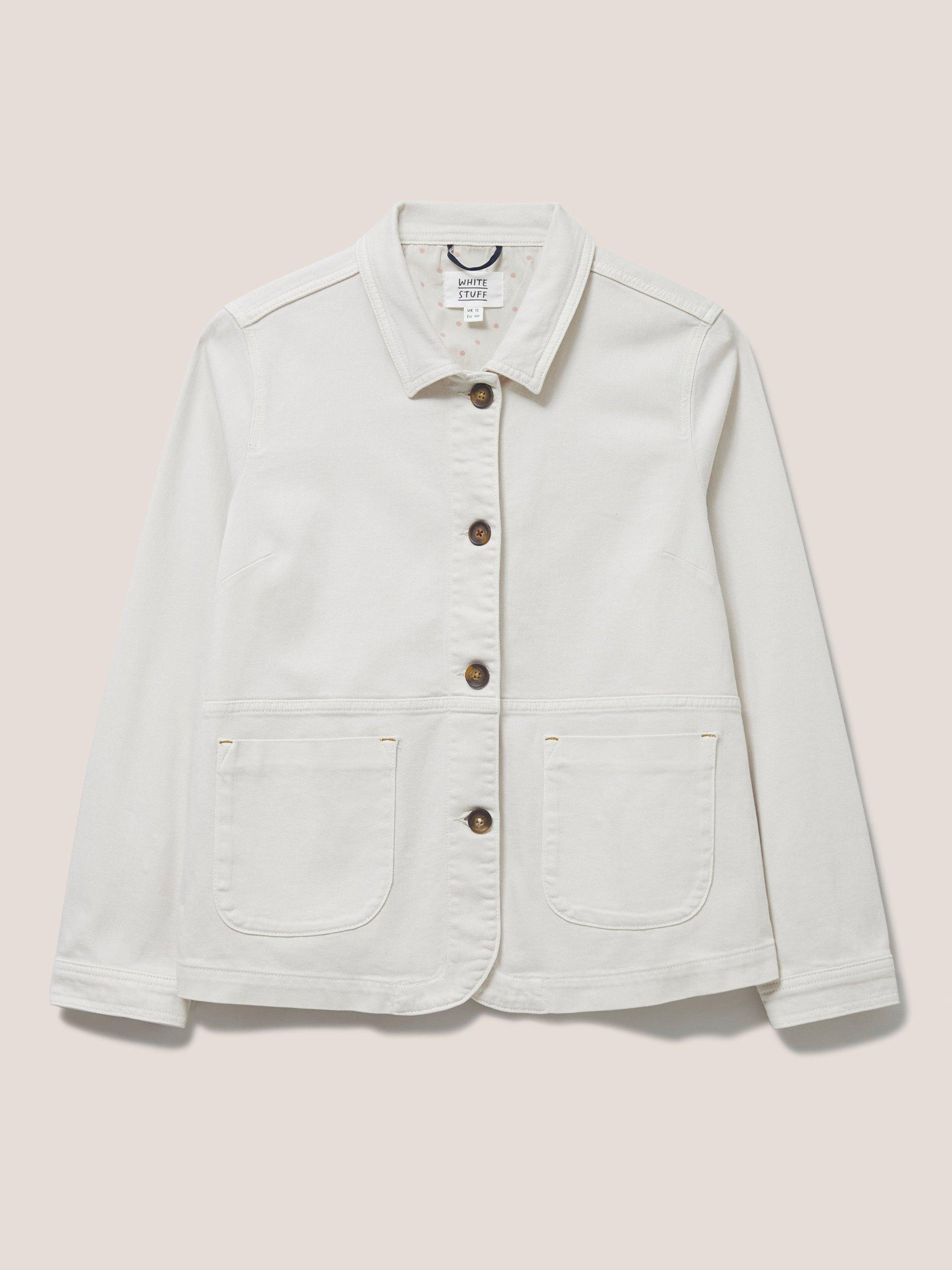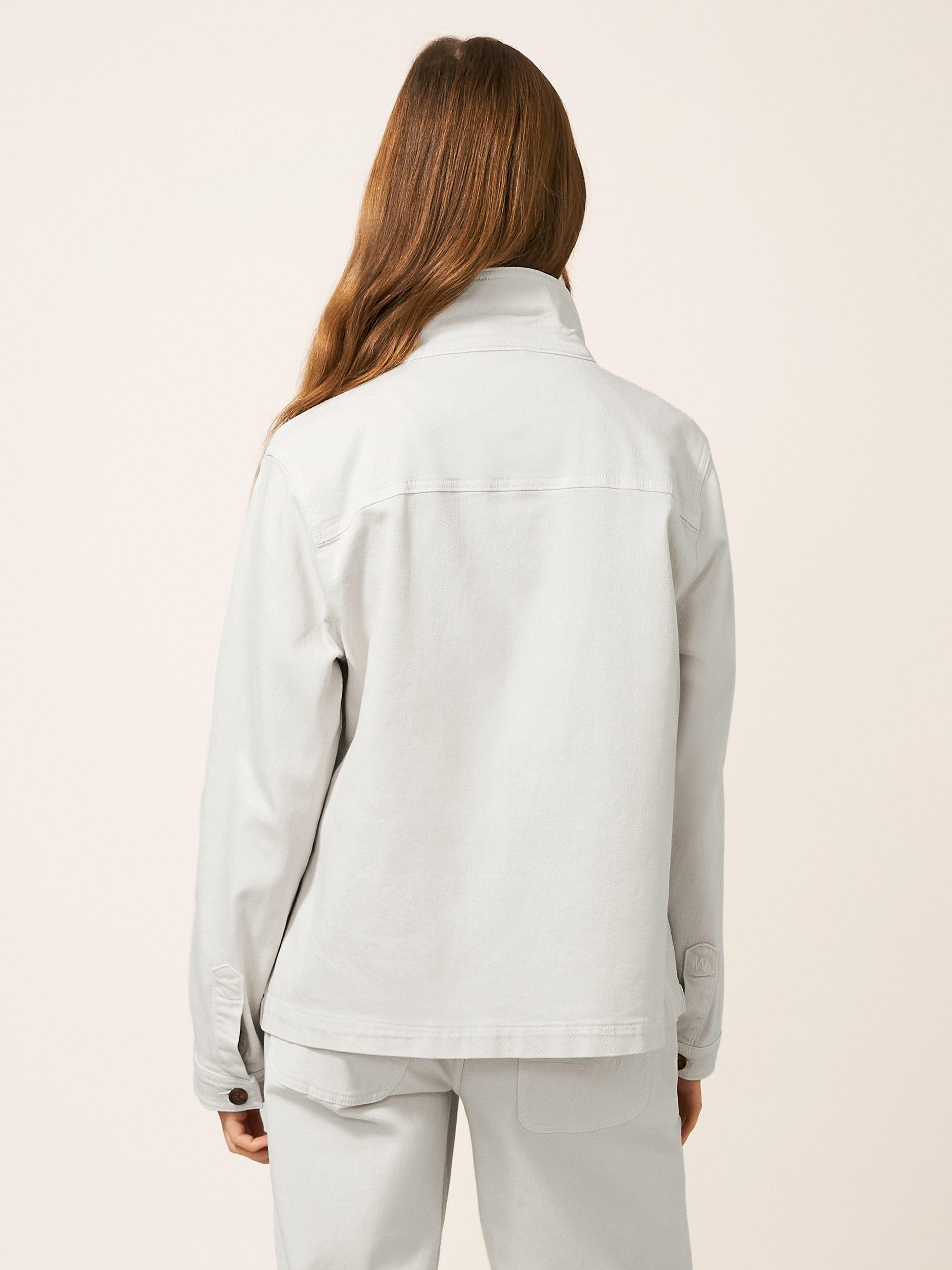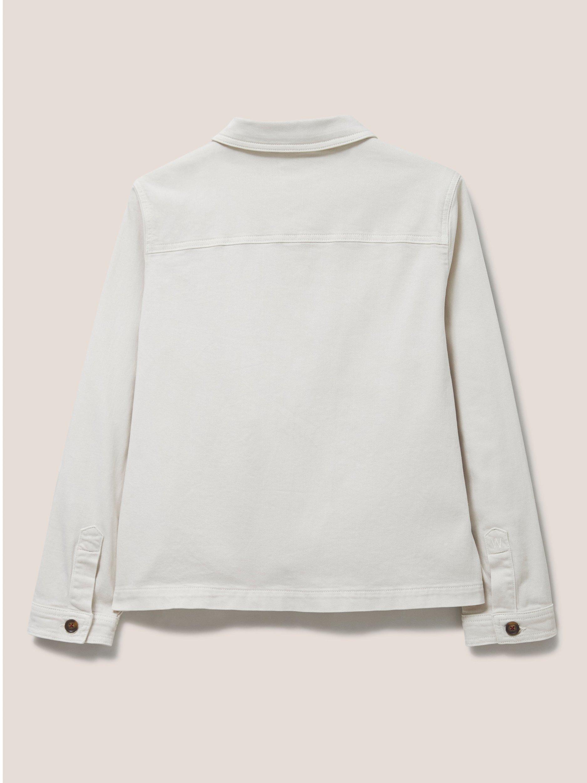 A long sleeve denim jacket with collar and front pockets.