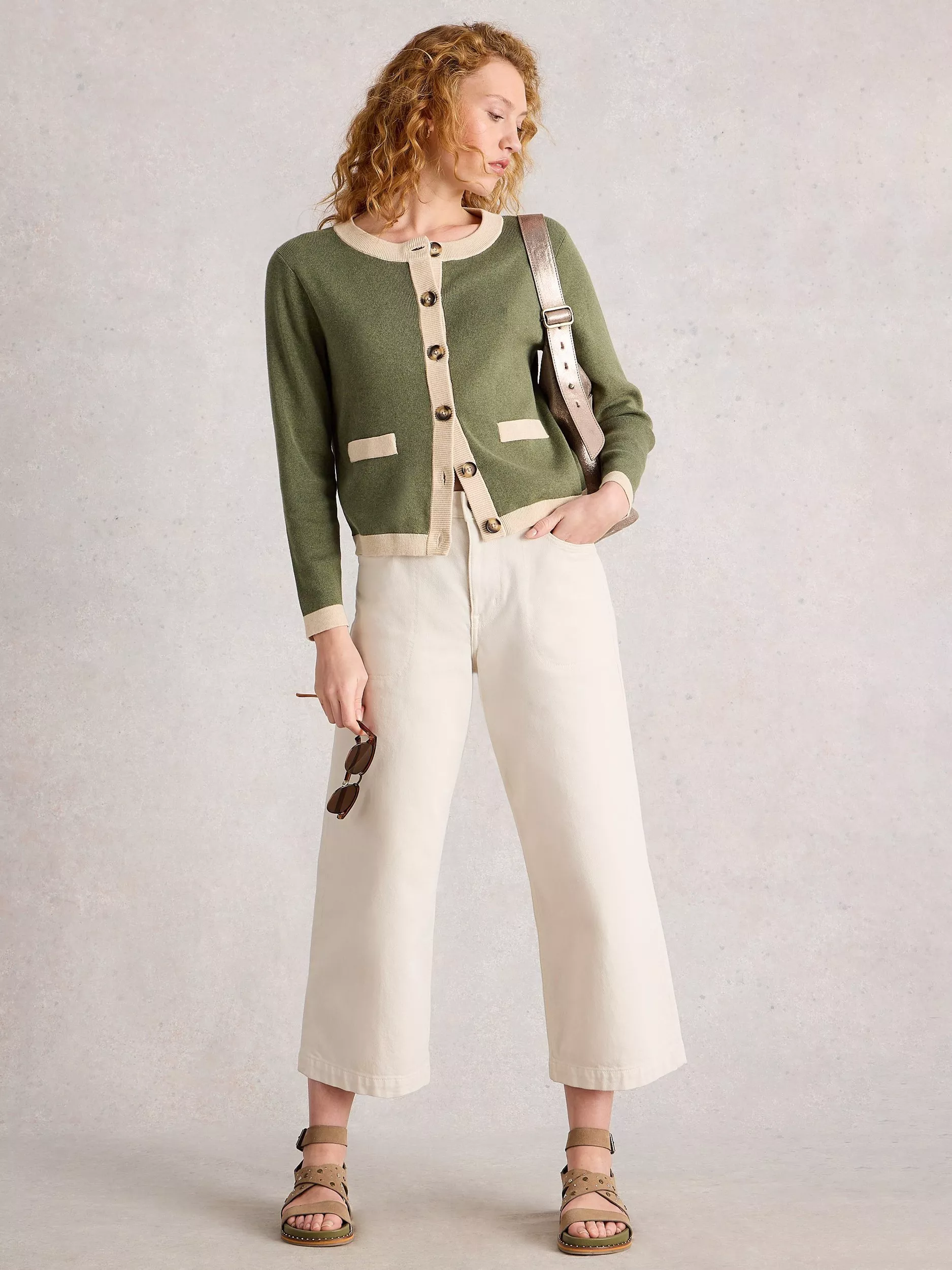 White StuffCharlotte Contrast Trim Cardigan, Khaki/Multi