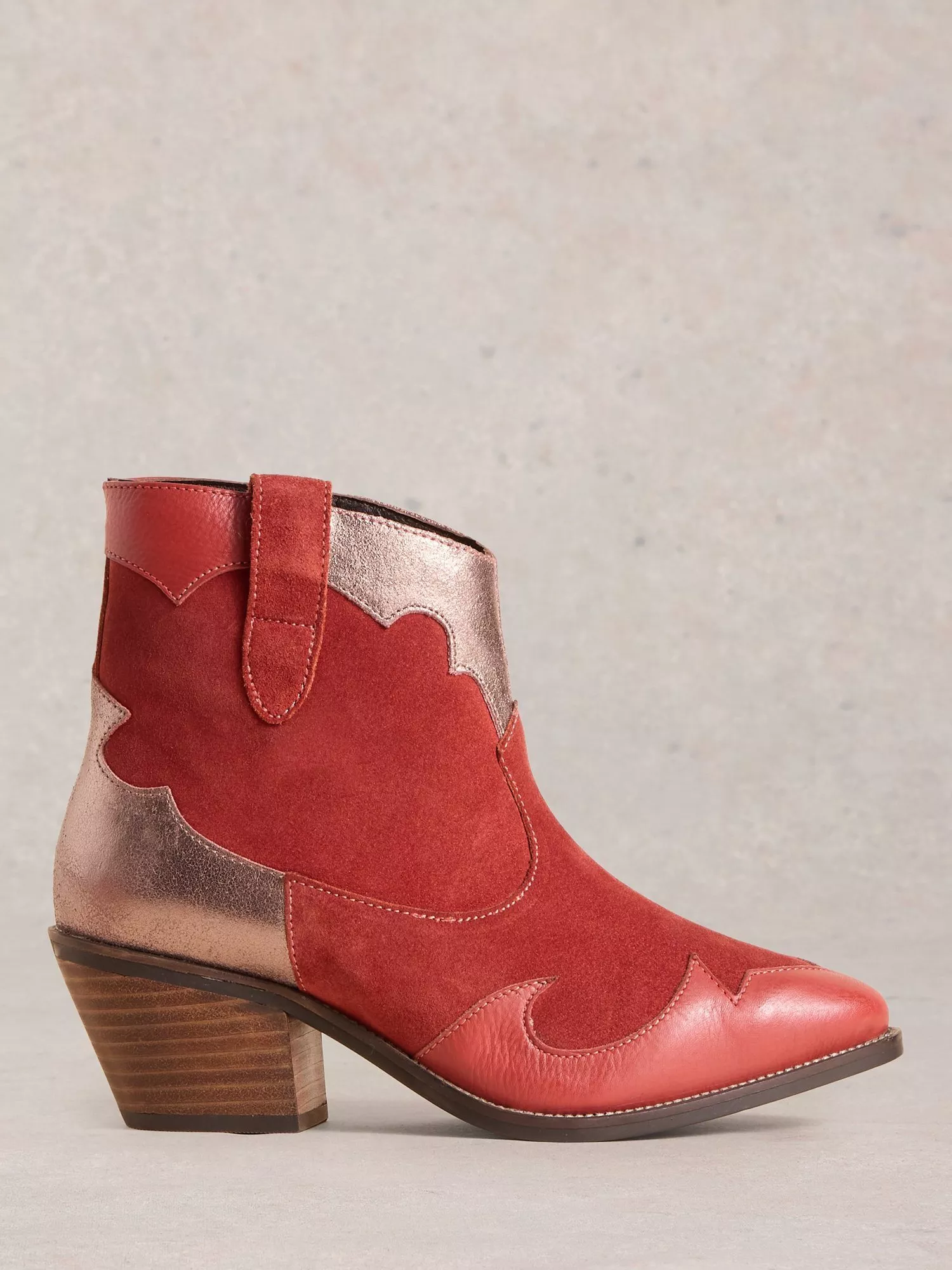 A pair of ankle western boot with pull on tab and metallic accents. Comfortable insoles.