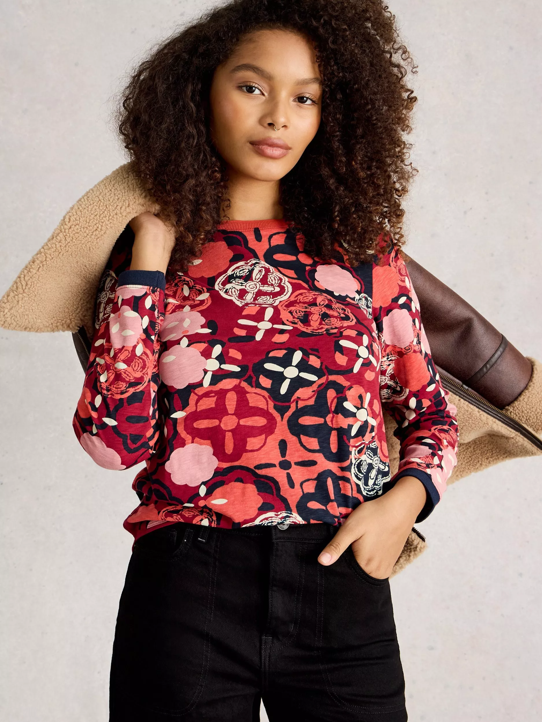 A long sleeve, crew neck tee in a fun and vivid pattern.