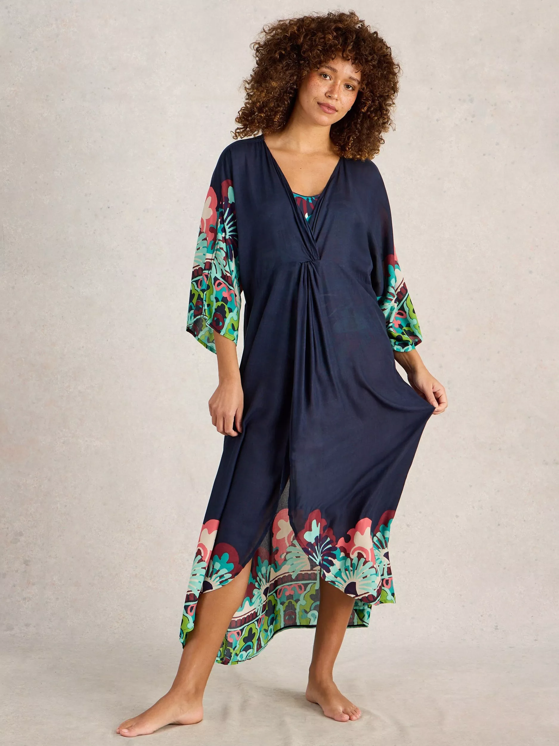 A colourful print kimono in a lightweight, breezy fabric.