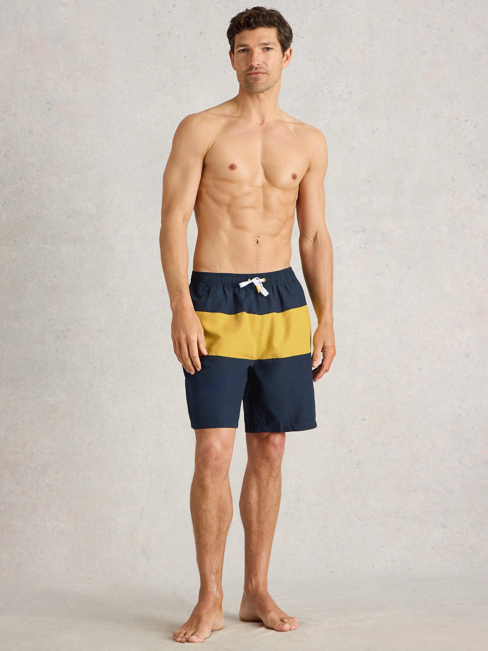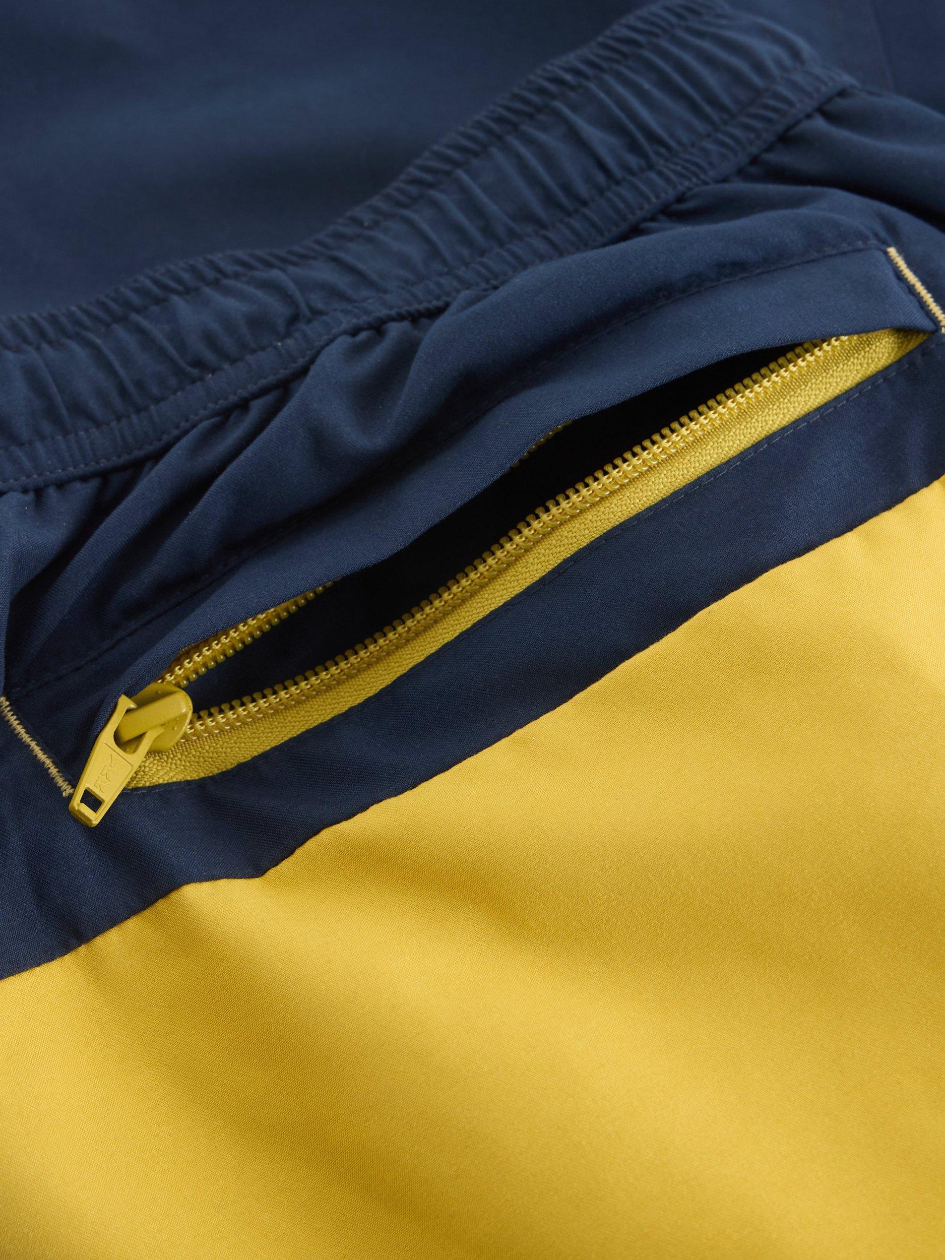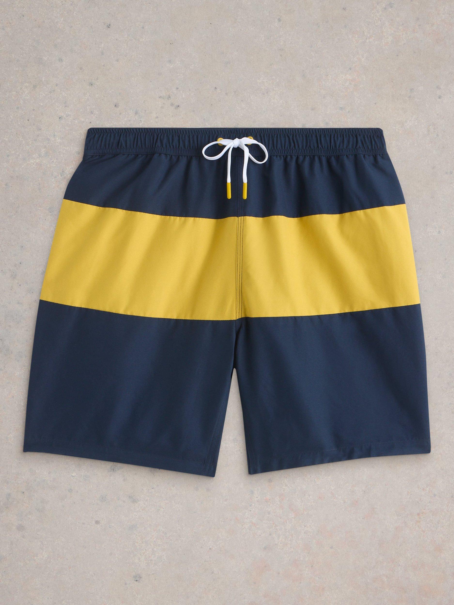 These swim shorts are constructed from lightweight fabric with water-repellent and fast-drying qualities. They feature a drawstring waist, a zip pocket on the back and a fun colour block print.