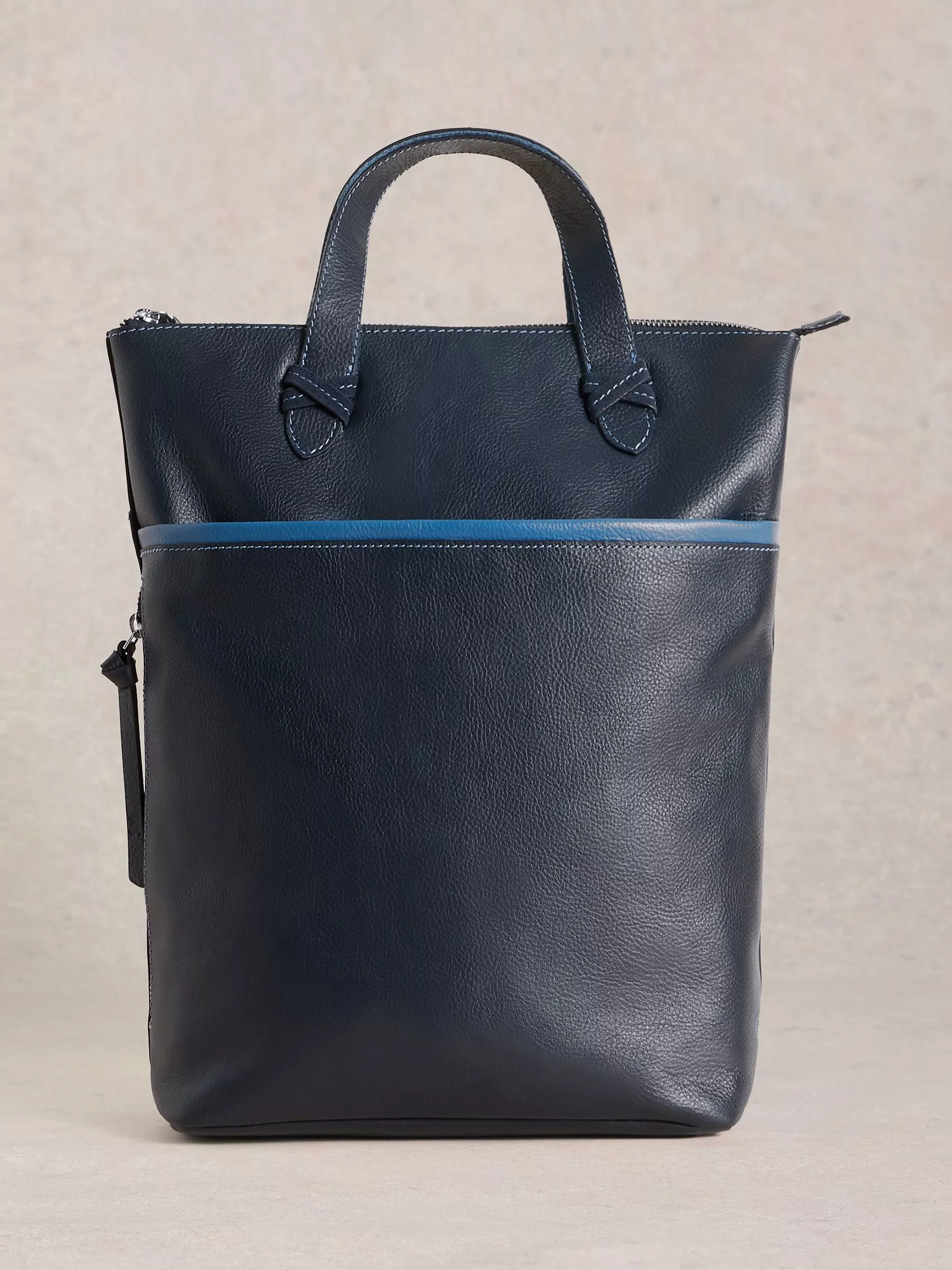 A leather bag that can be worn as a rucksack or shoulder bag.