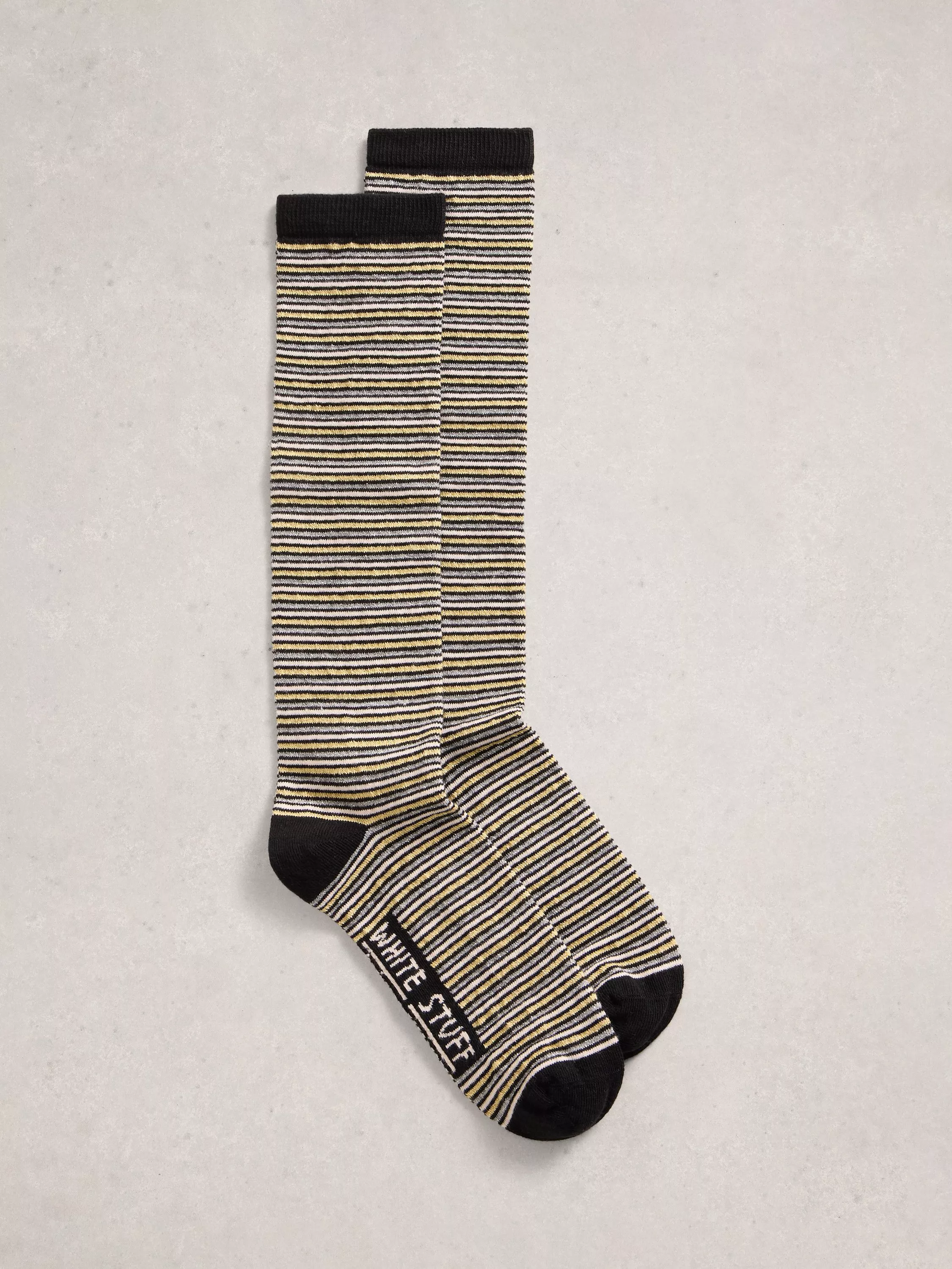 Metallic stripe knee high socks in a cotton blend.