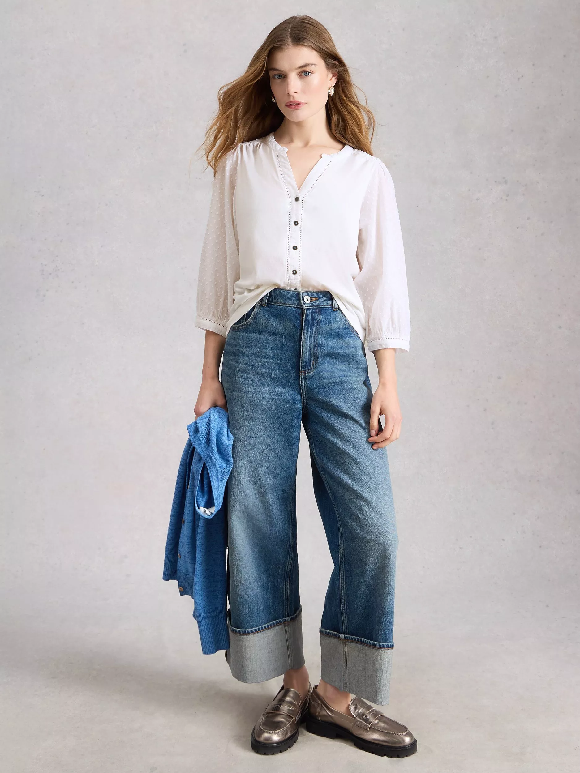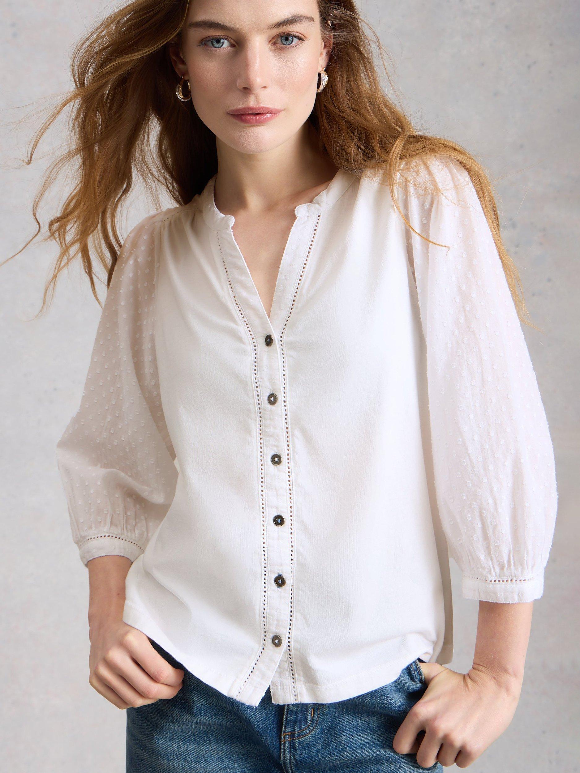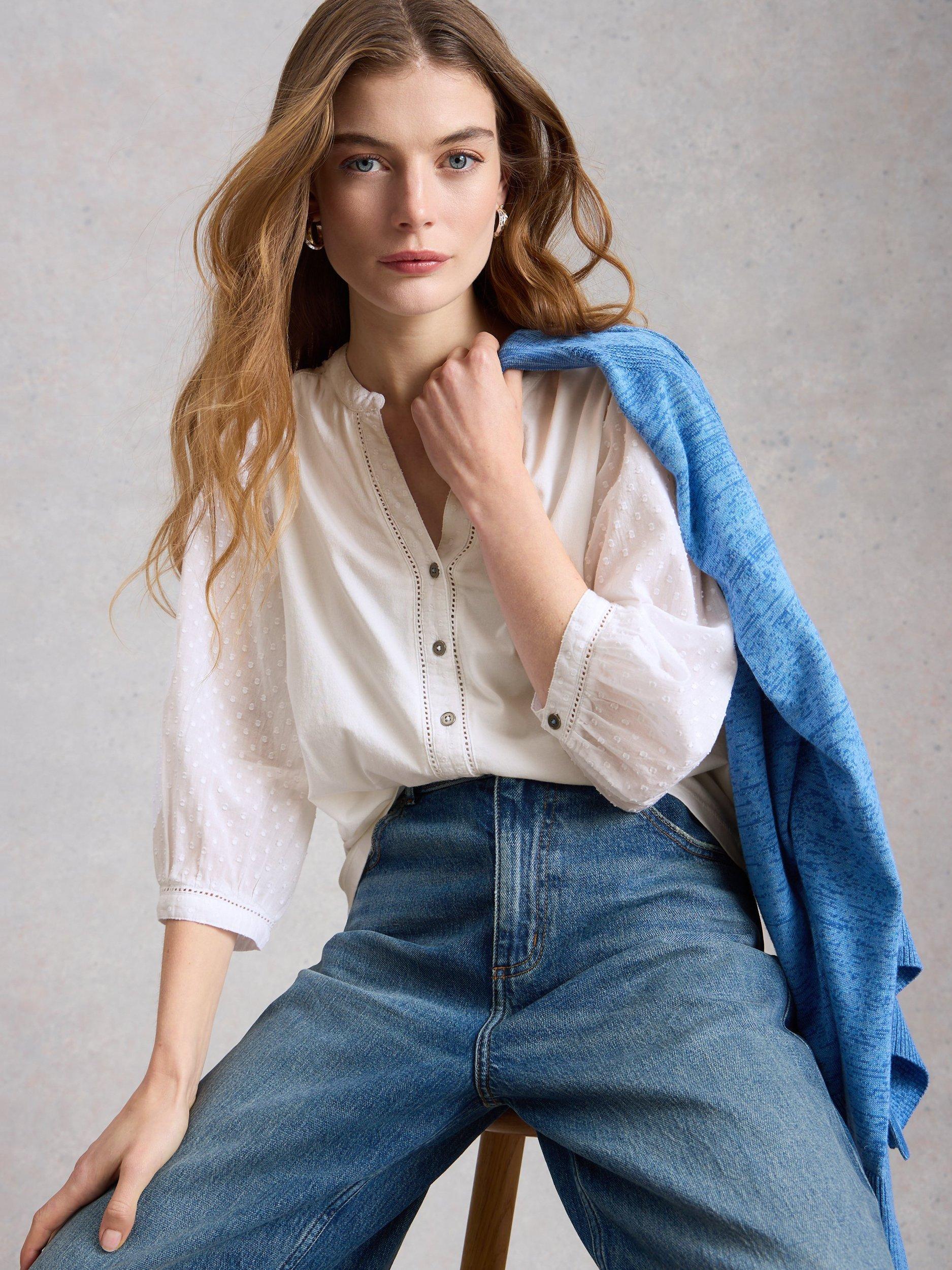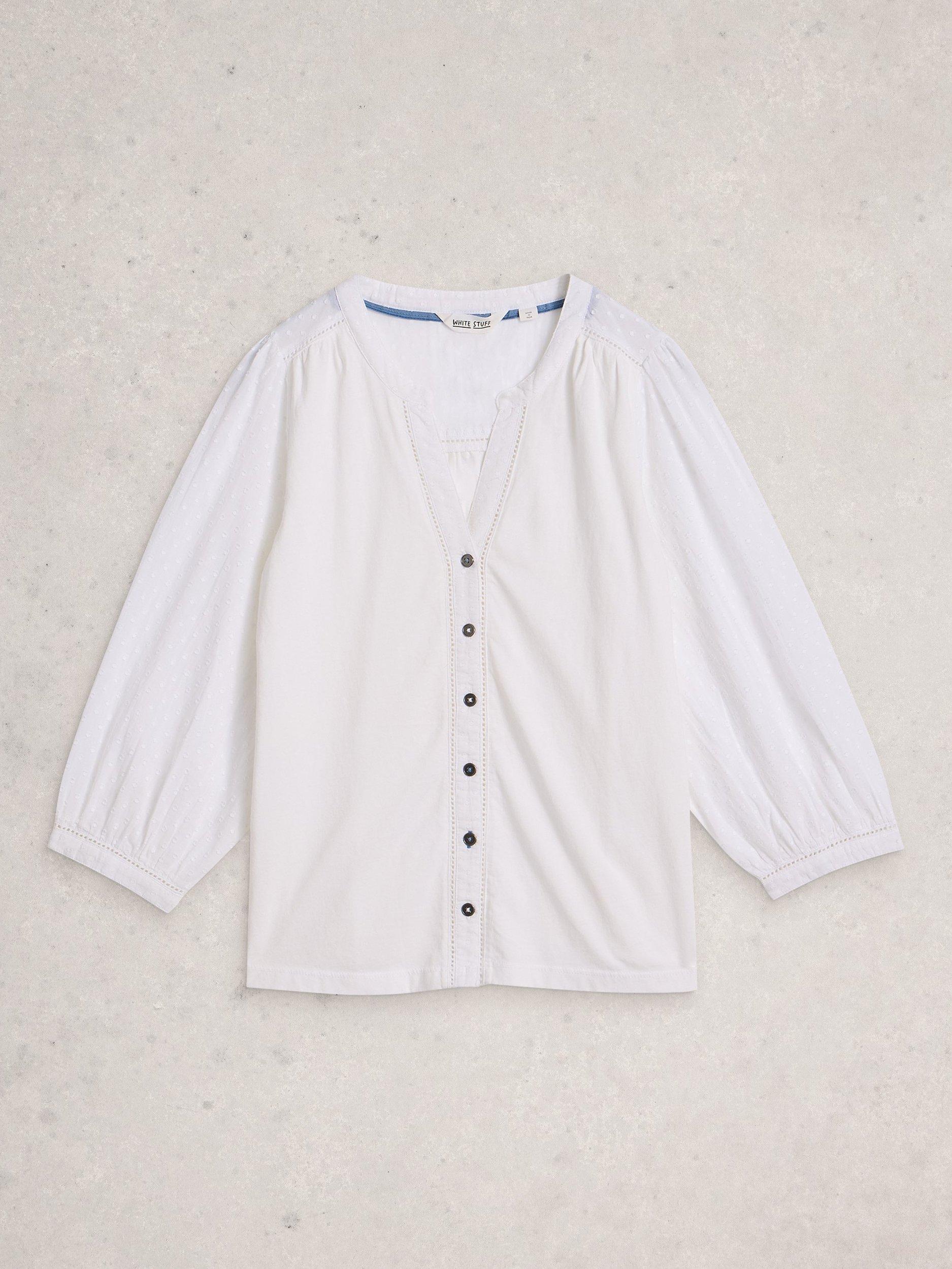 A blouse by White Stuff, made from pure cotton. Featuring a V-neck and three-quarter length sleeves, it comes in a mix-and-match ready plain colour. Effortless style for daily dressing.