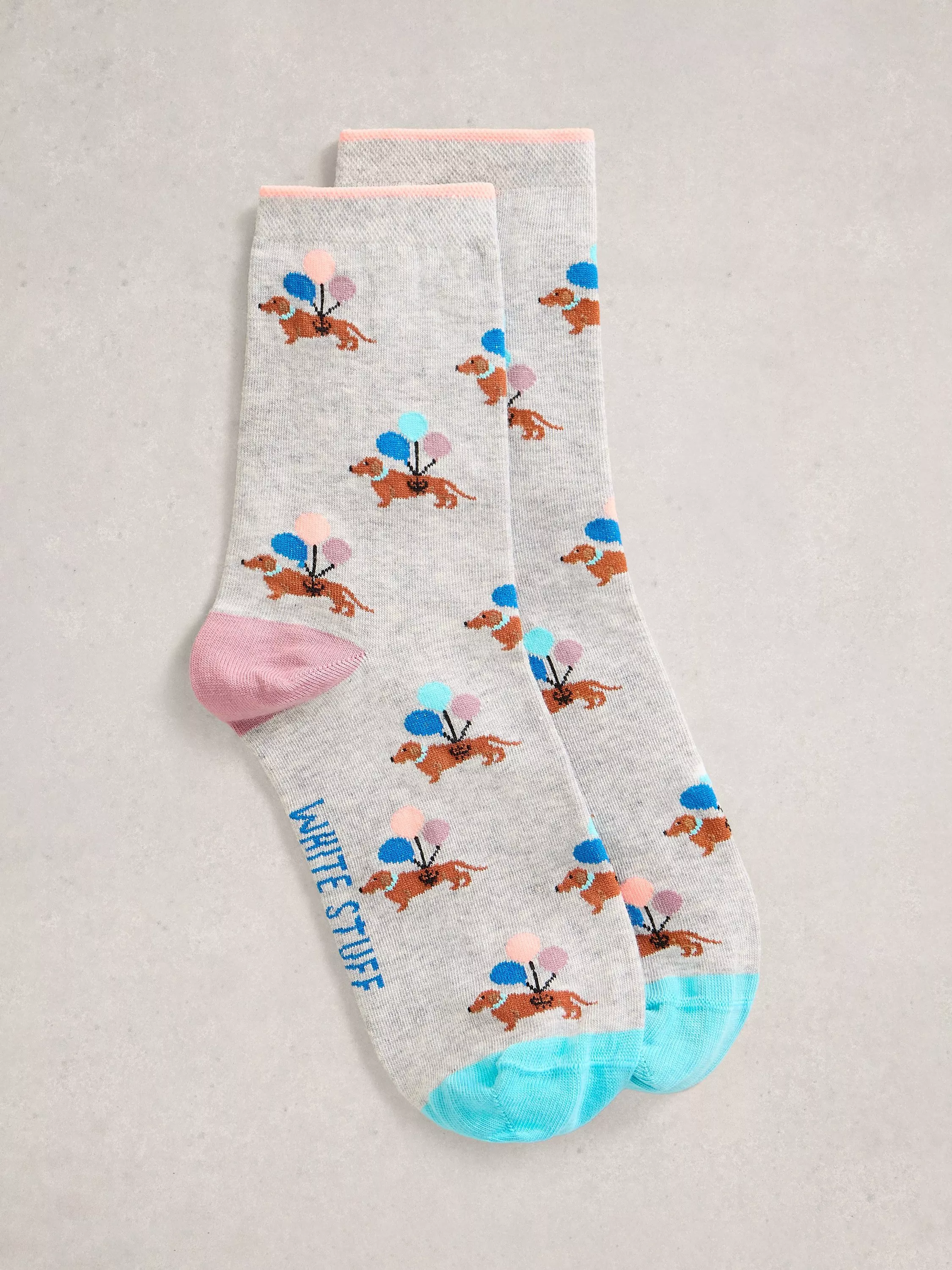 Crafted from a soft cotton blend, this pair of dachshund ankle socks fit comfortably and add a cheerful lift to any outfit.