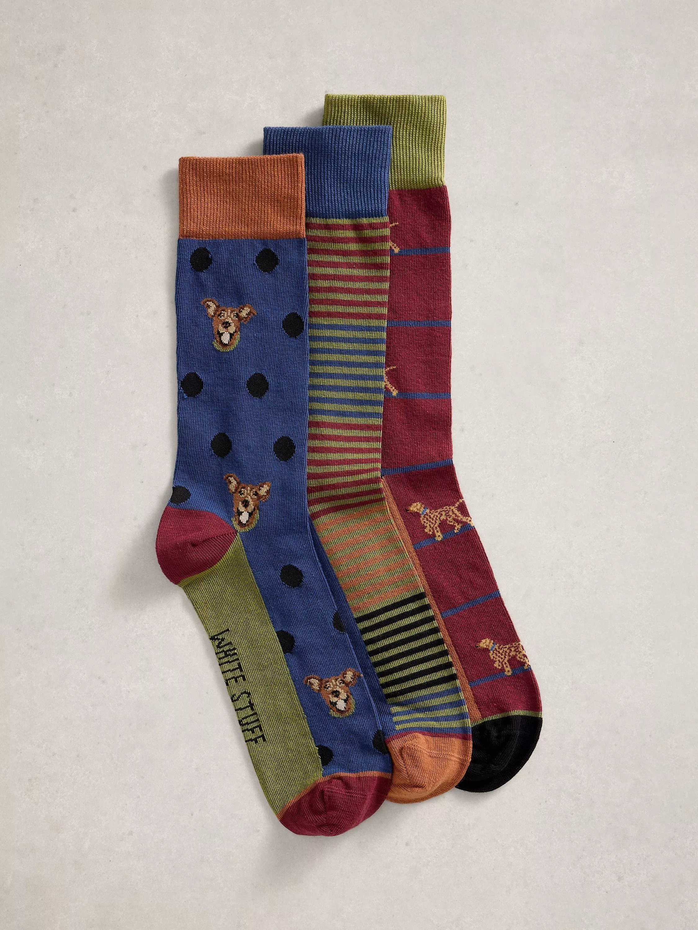 White StuffDog & Stripe Socks, Pack of 3, Brown/Multi