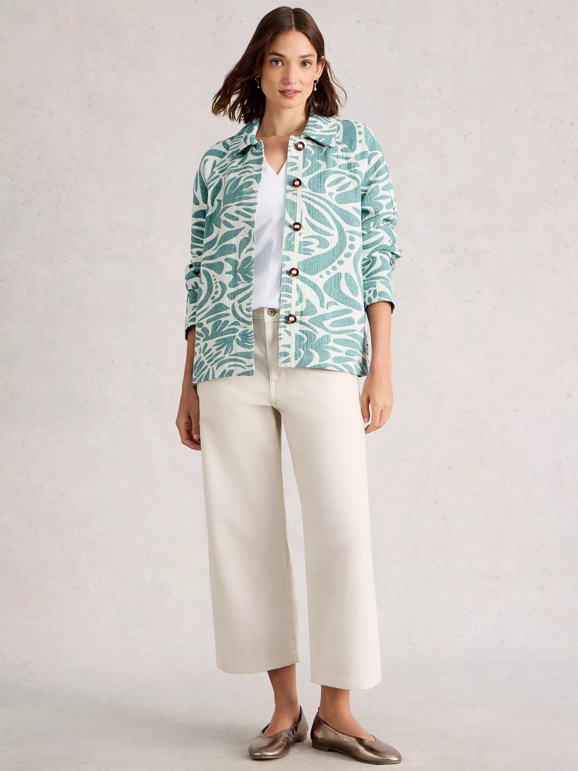 An abstract print shacket, crafted from soft organic cotton with a hint of stretch. Its clever design suits busy days - layer, button up, or throw on for relaxed comfort.