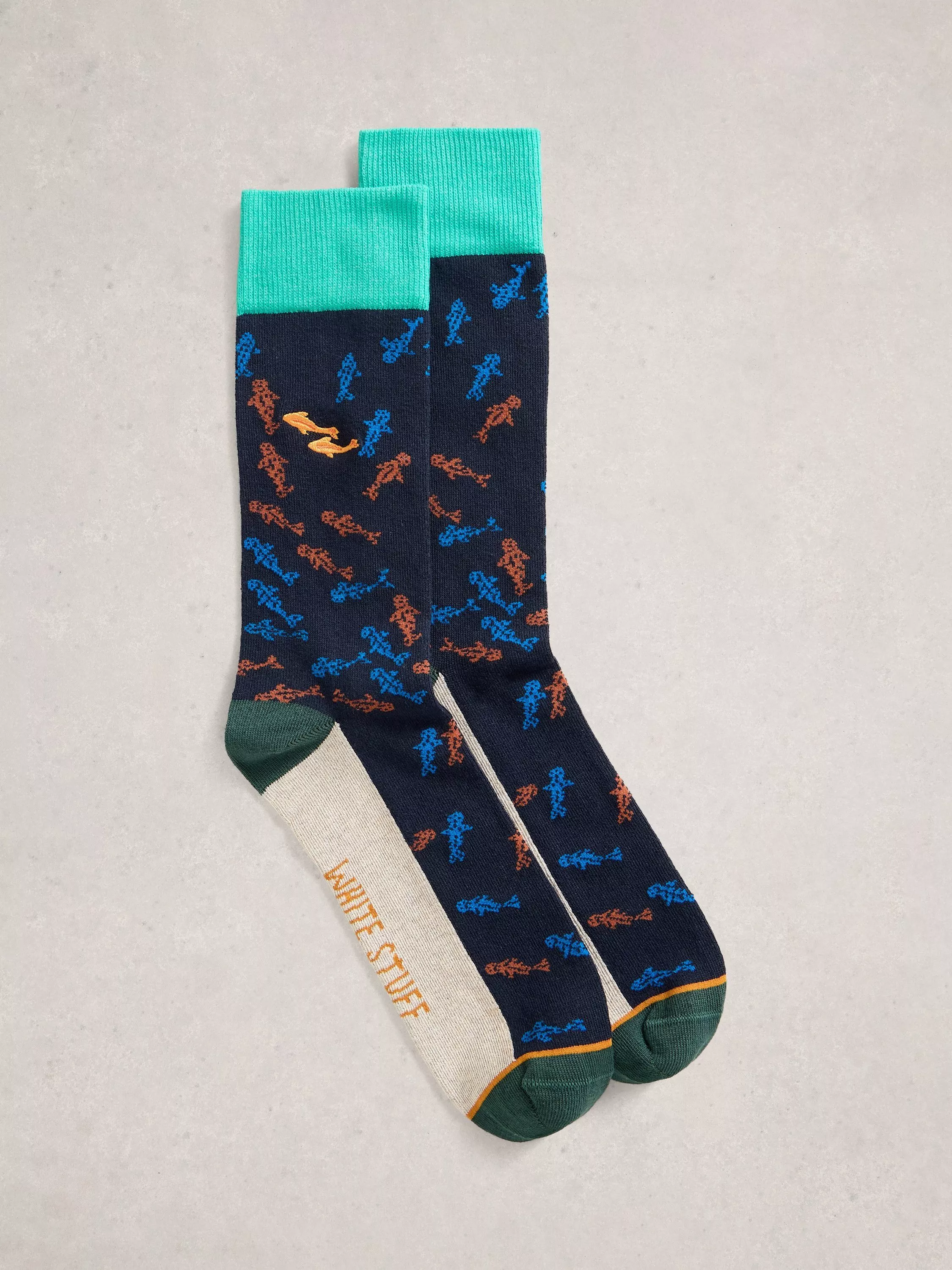 White StuffEmbroidered Fish Ankle Socks, Navy/Multi