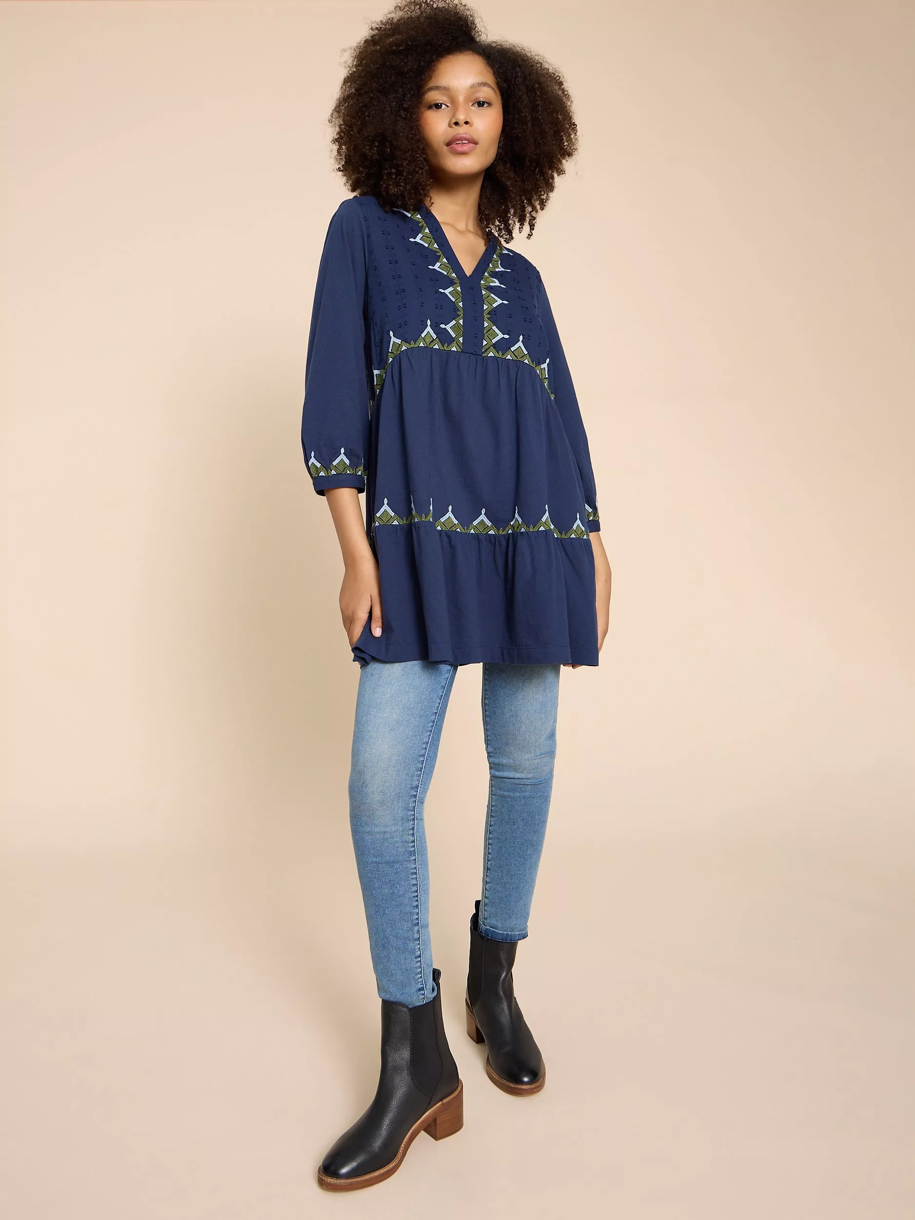 Longer in length for relaxed days ahead, this tunic top by White Stuff has a textured effect thanks to the intricate embroidered detail.