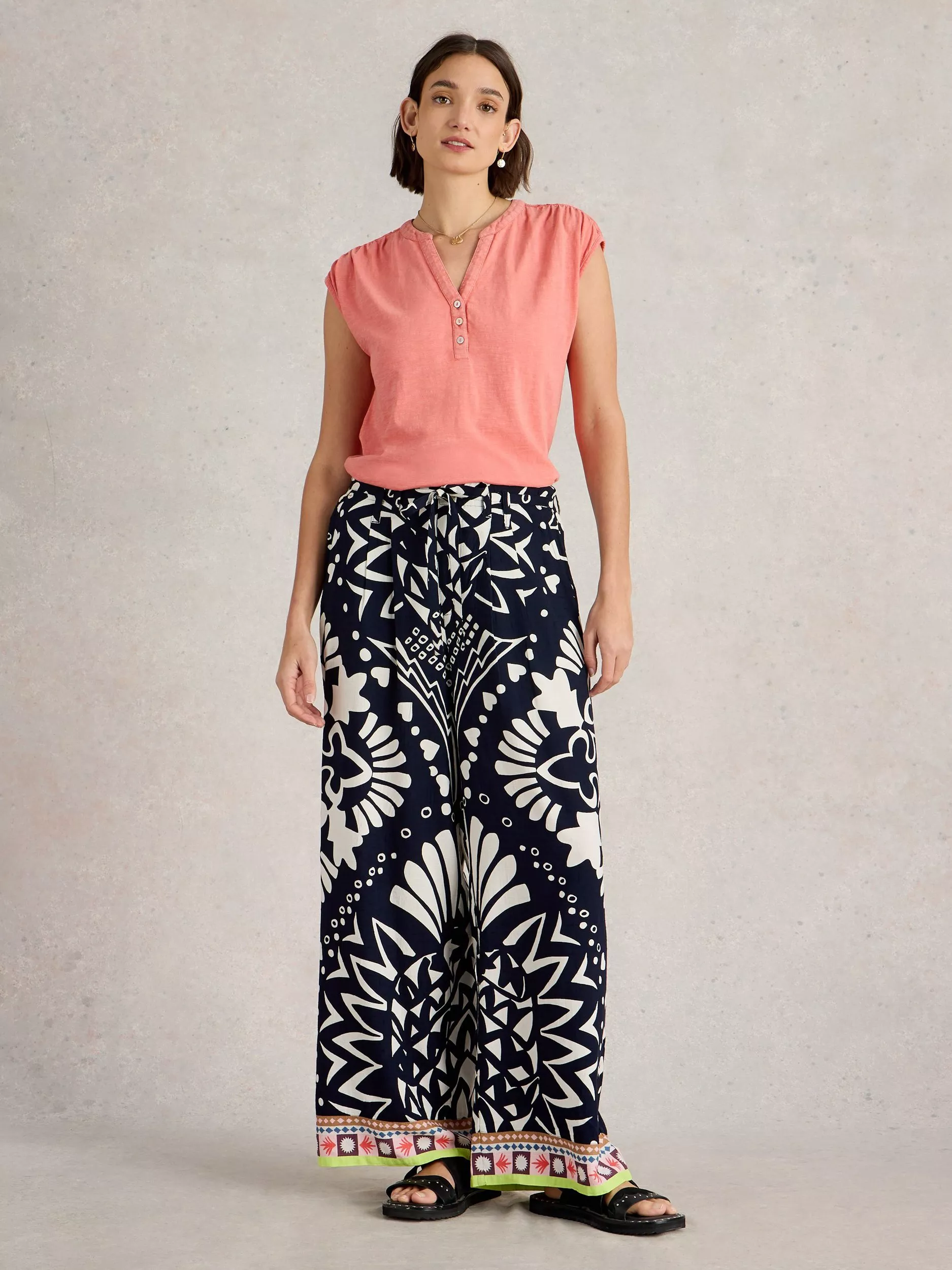 A pair of wide-leg lightweight trousers with tie detailing at the waist and border print at the hem.
