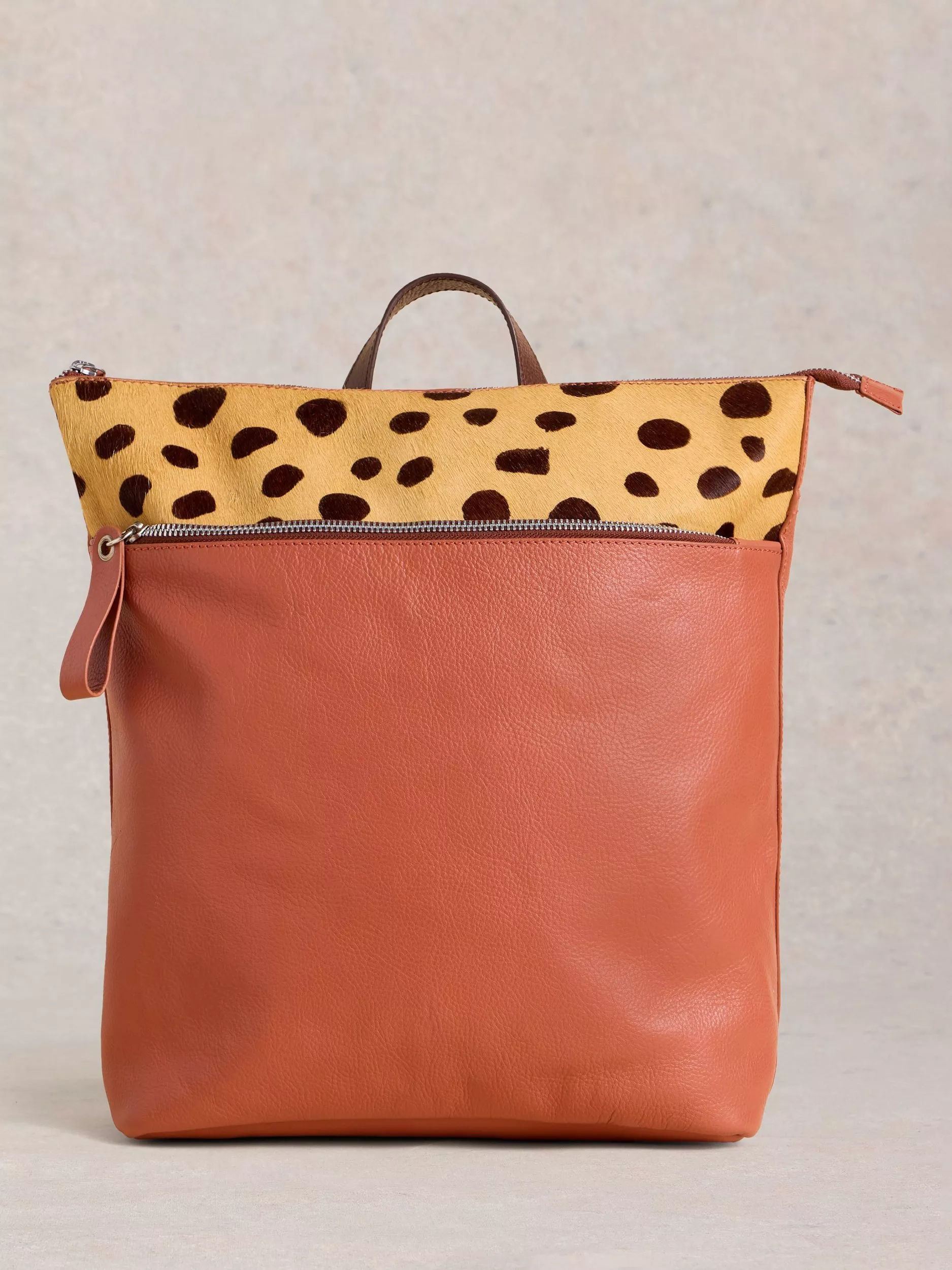 An adjustable backpack with hair on spotted animal print panel to add a statement. Features adjustable straps and large front pocket with a padded laptop pocket inside.