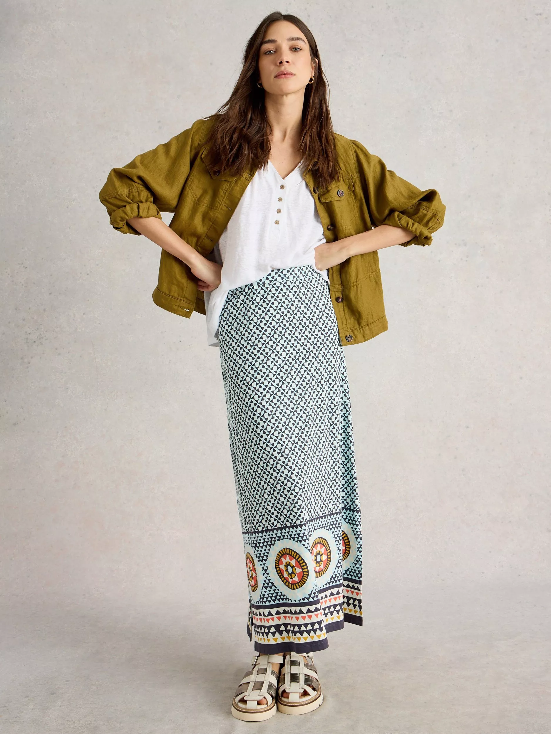 White Stuff boasts their Faye maxi jersey column skirt, with elasticated waistband and boho style border placement print. 100% cotton for a long skirt with a cool feel, pair with a tucked in tee and a pair of comfortable walking sandals.