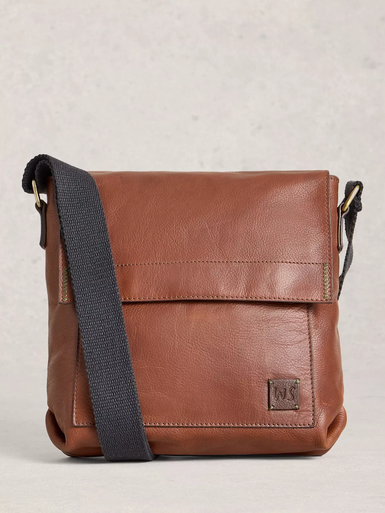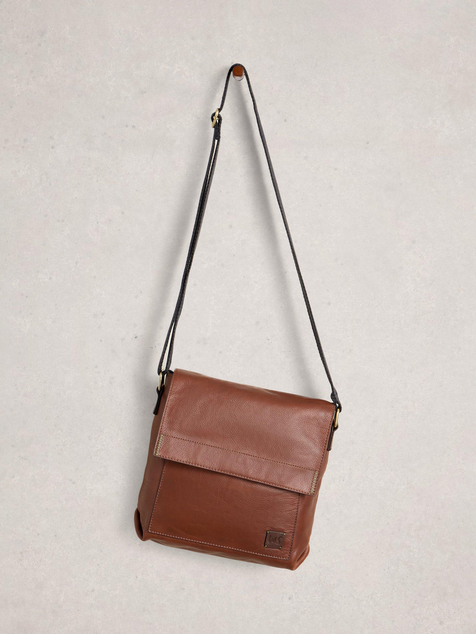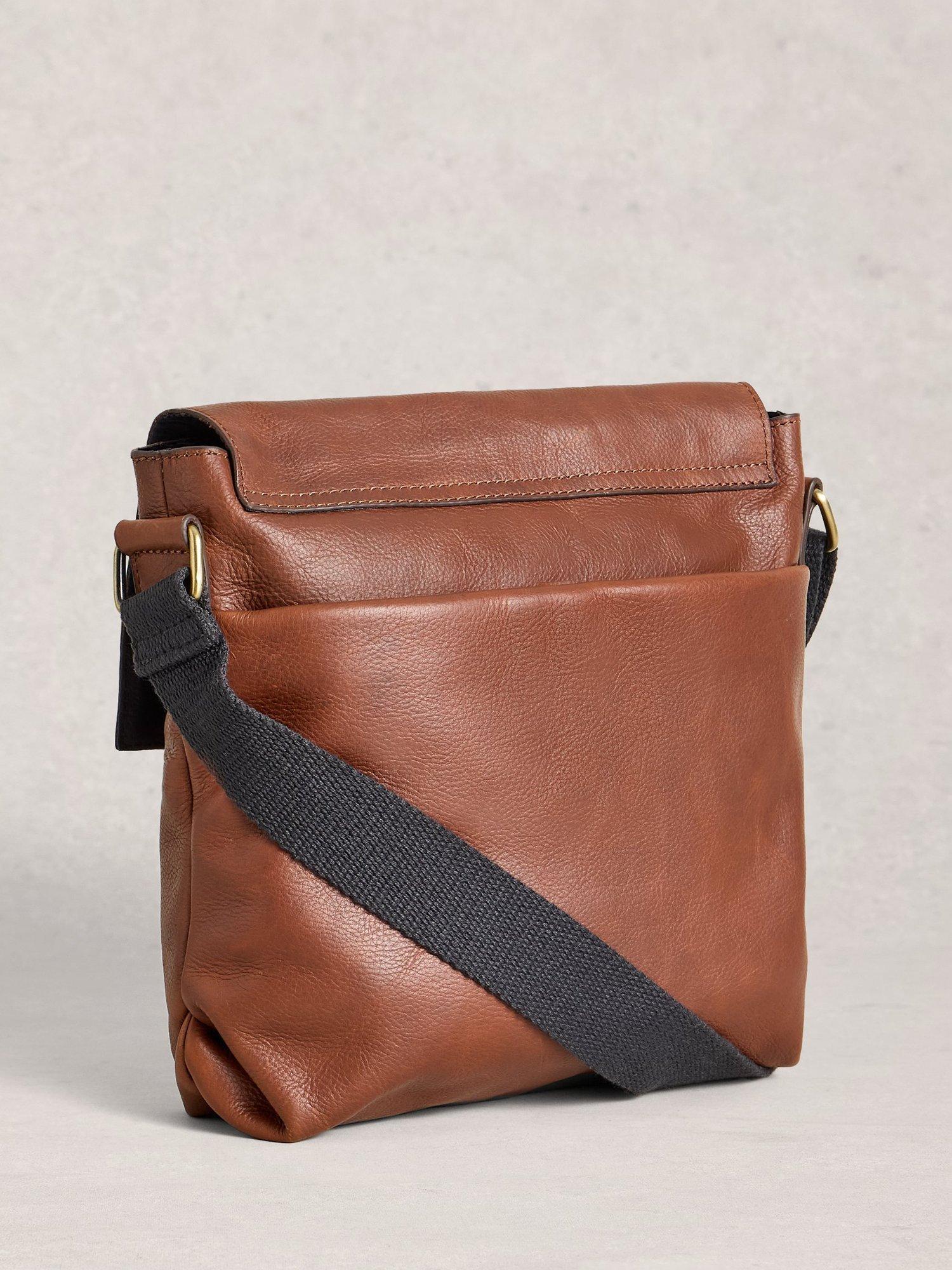 A leather crossbody bag with canvas adjustable straps and magnetic flap closure.