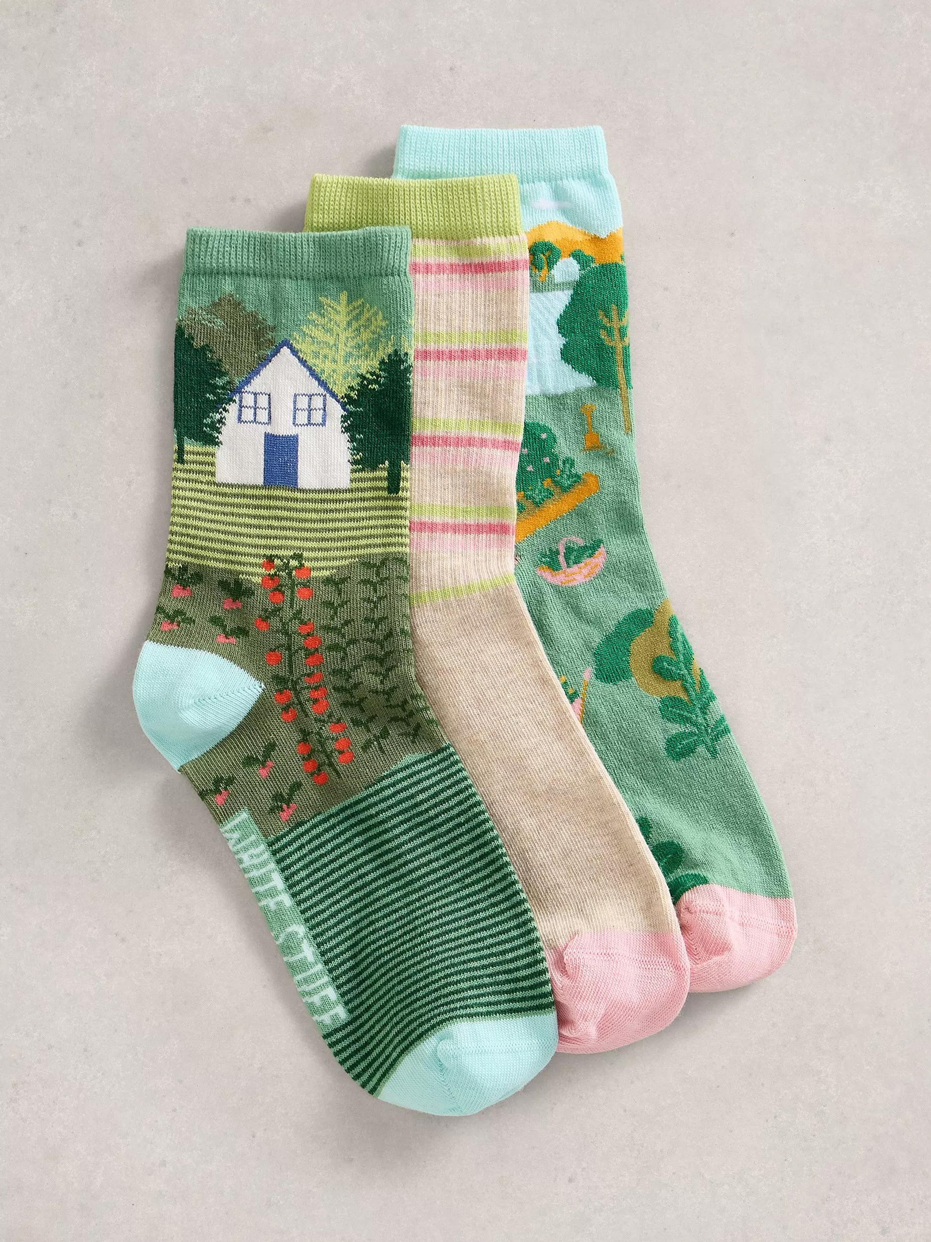 White StuffGarden Scene Ankle Socks, Pack of 3, Green/Multi