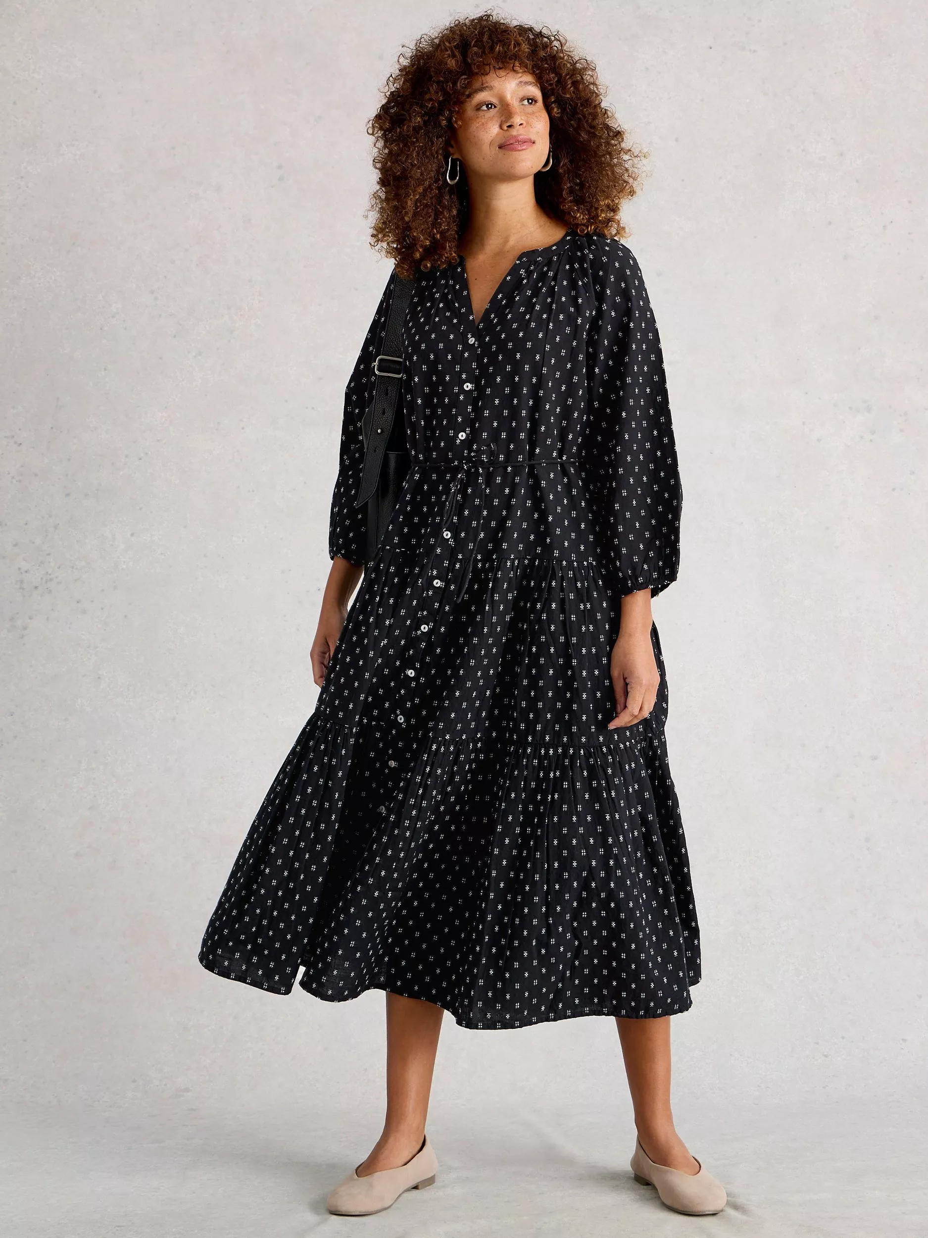 White Stuff's tiered midi dress in organic cotton brings effortless style to your everyday. The geometric pattern and playful shape create a striking look, while the V-neck and three-quarter sleeves keep it comfortable - perfectly designed for days that call for both ease and flair.