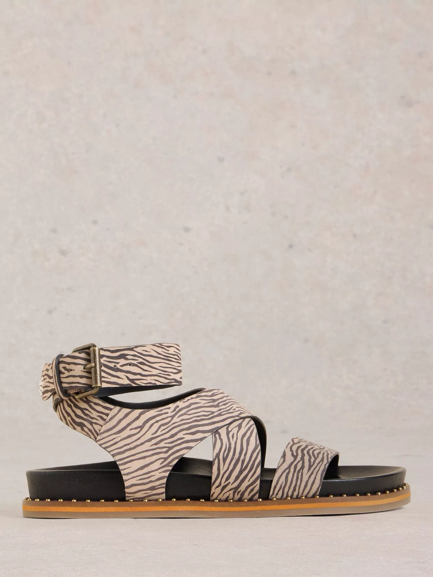 From White Stuff, these animal print gladiator sandals are made from suede with a moulded footbed and a buckled ankle strap.
