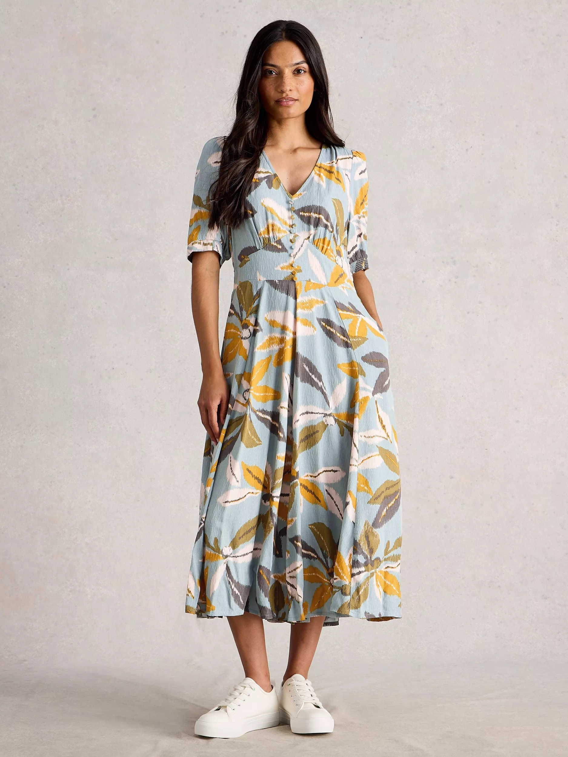 This midi fit and flare dress combines a playful floral pattern with short sleeves and a flattering V-neck, making it ideal for your daytime plans. The lightweight viscose fabric helps you stay comfortable wherever you go.