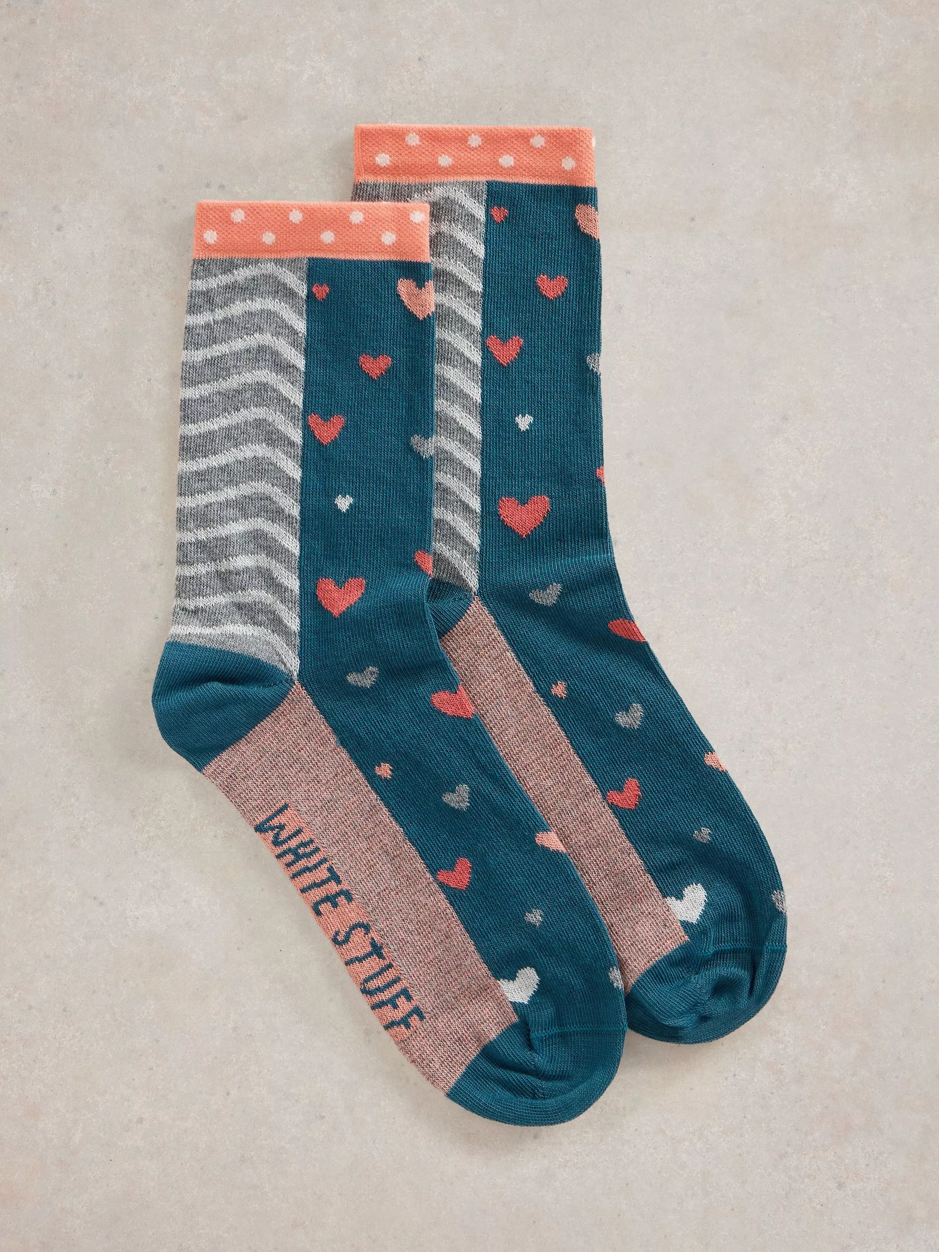 A pair of heart hotch-potch ankle socks, perfect for adding a little character to casual edits.