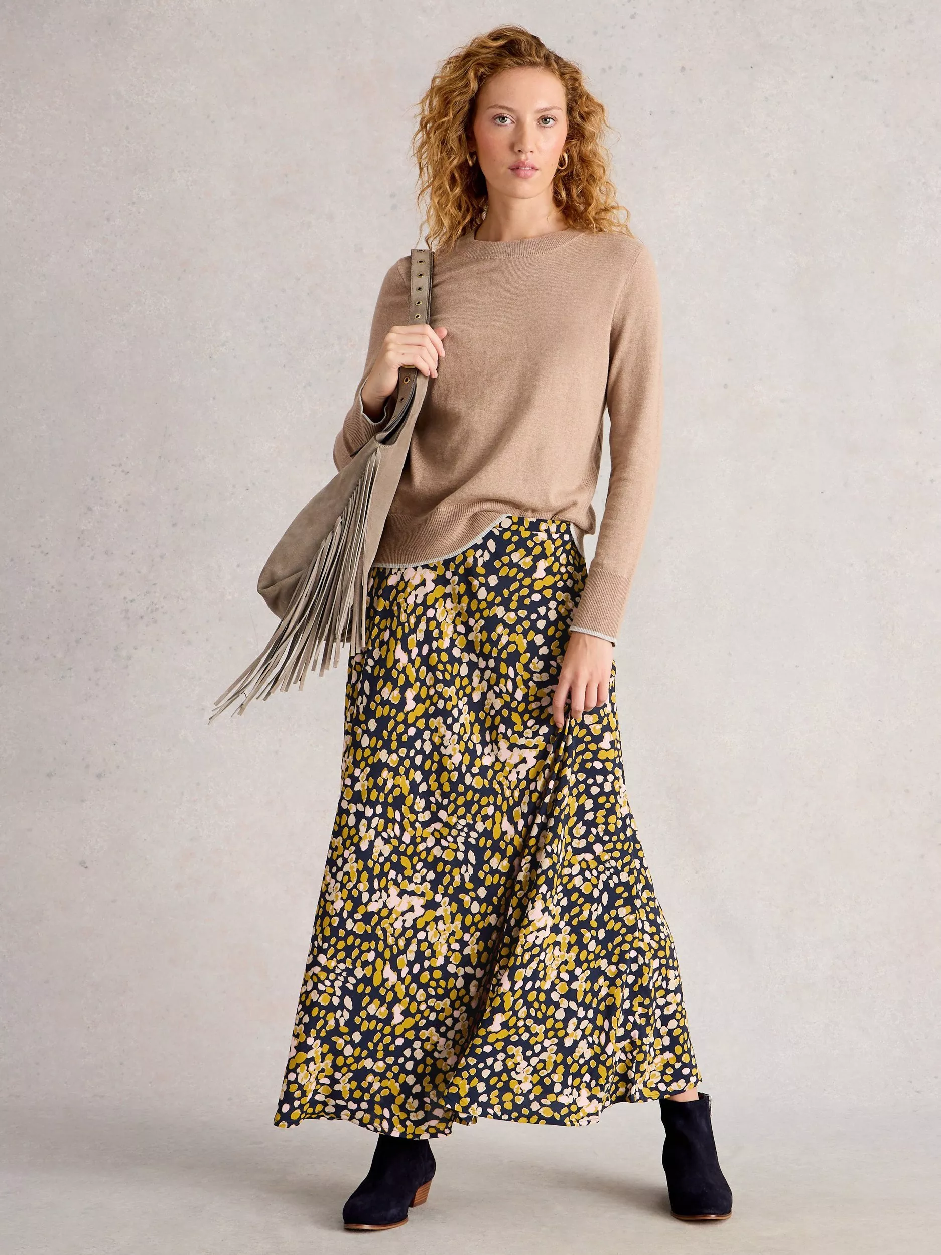 A statement maxi-length skirt from White Stuff. Cut with a flowing asymmetric line, it's formed from viscose with a mid rise and spotty print. Fastens smoothly with a zip.
