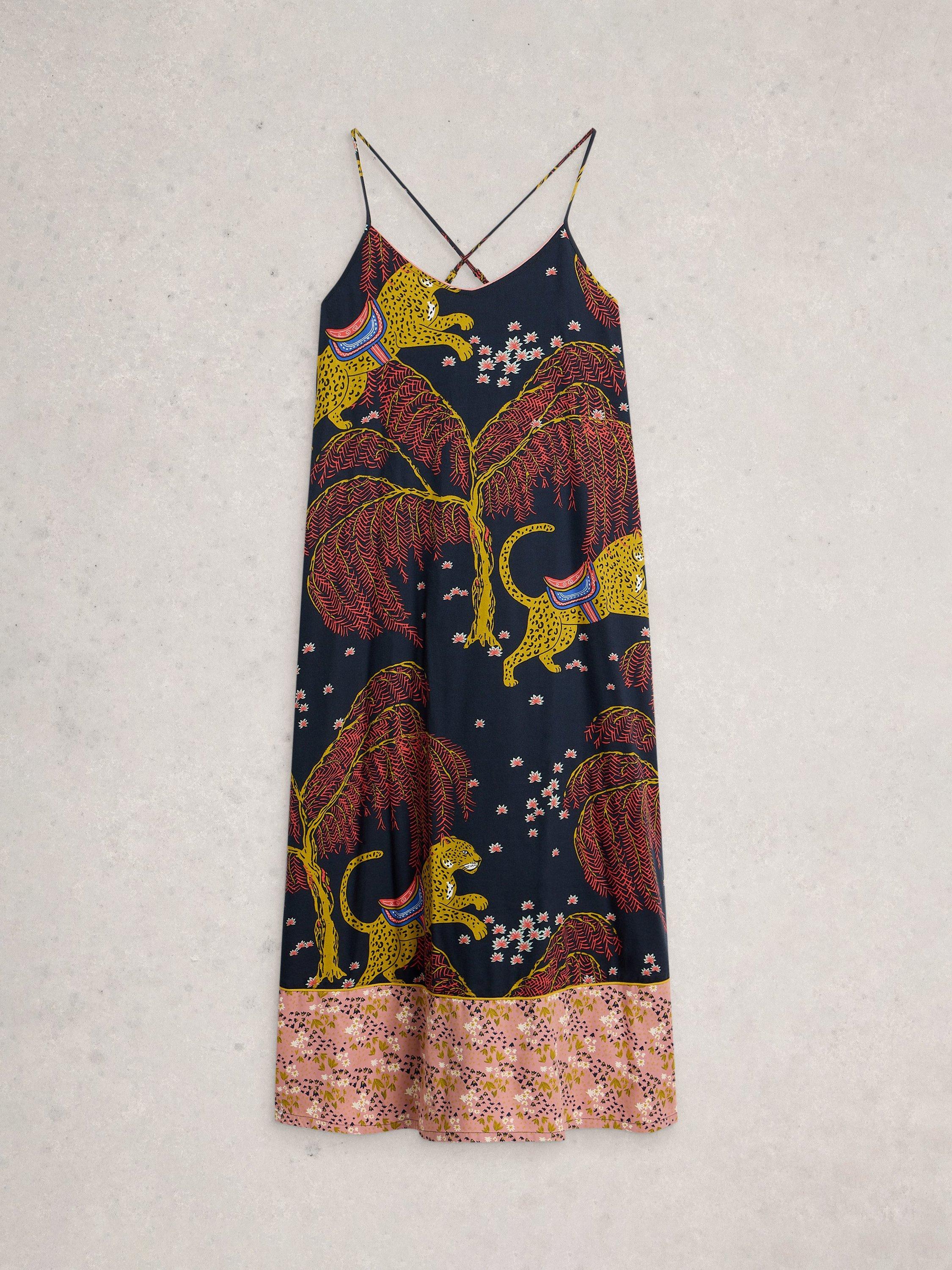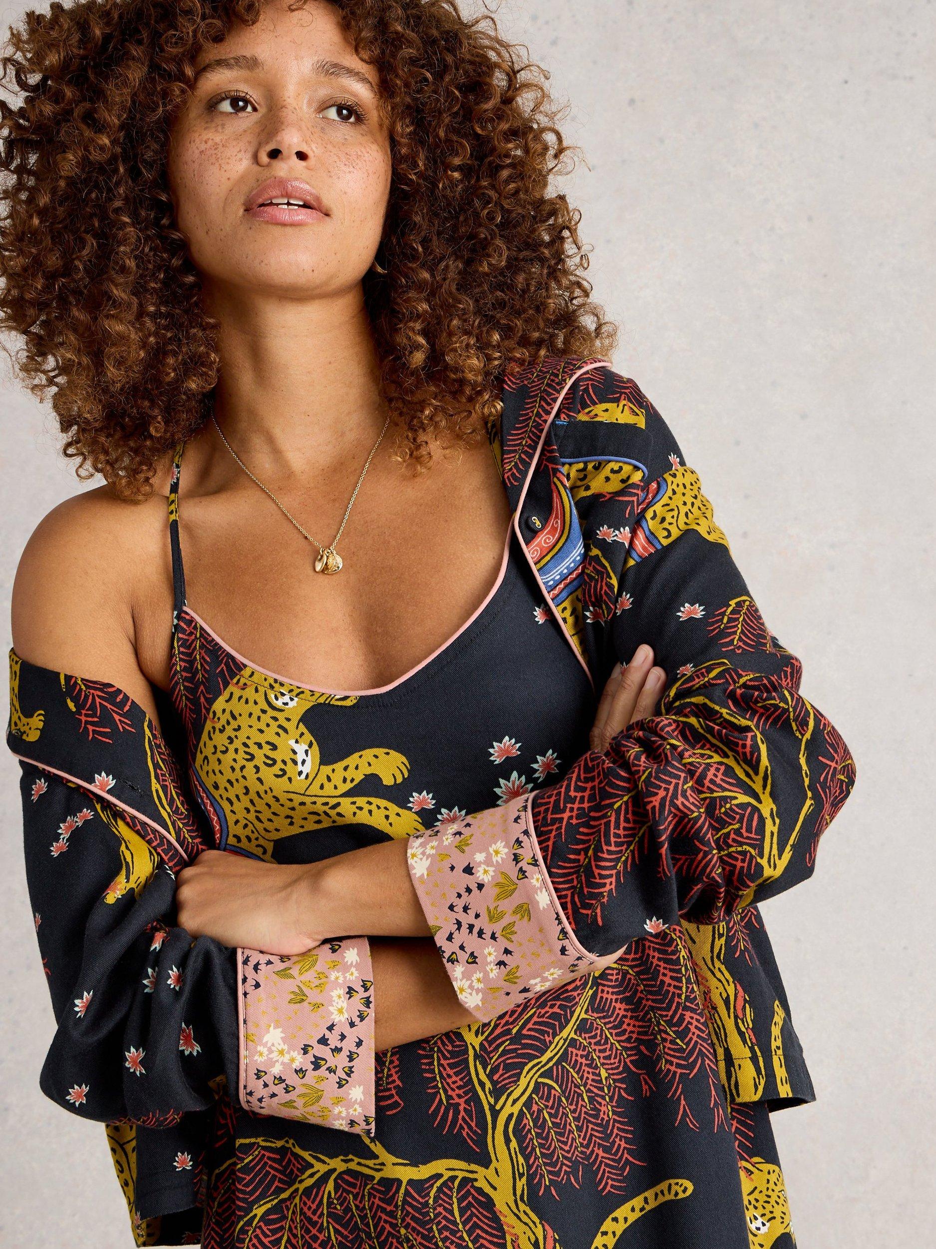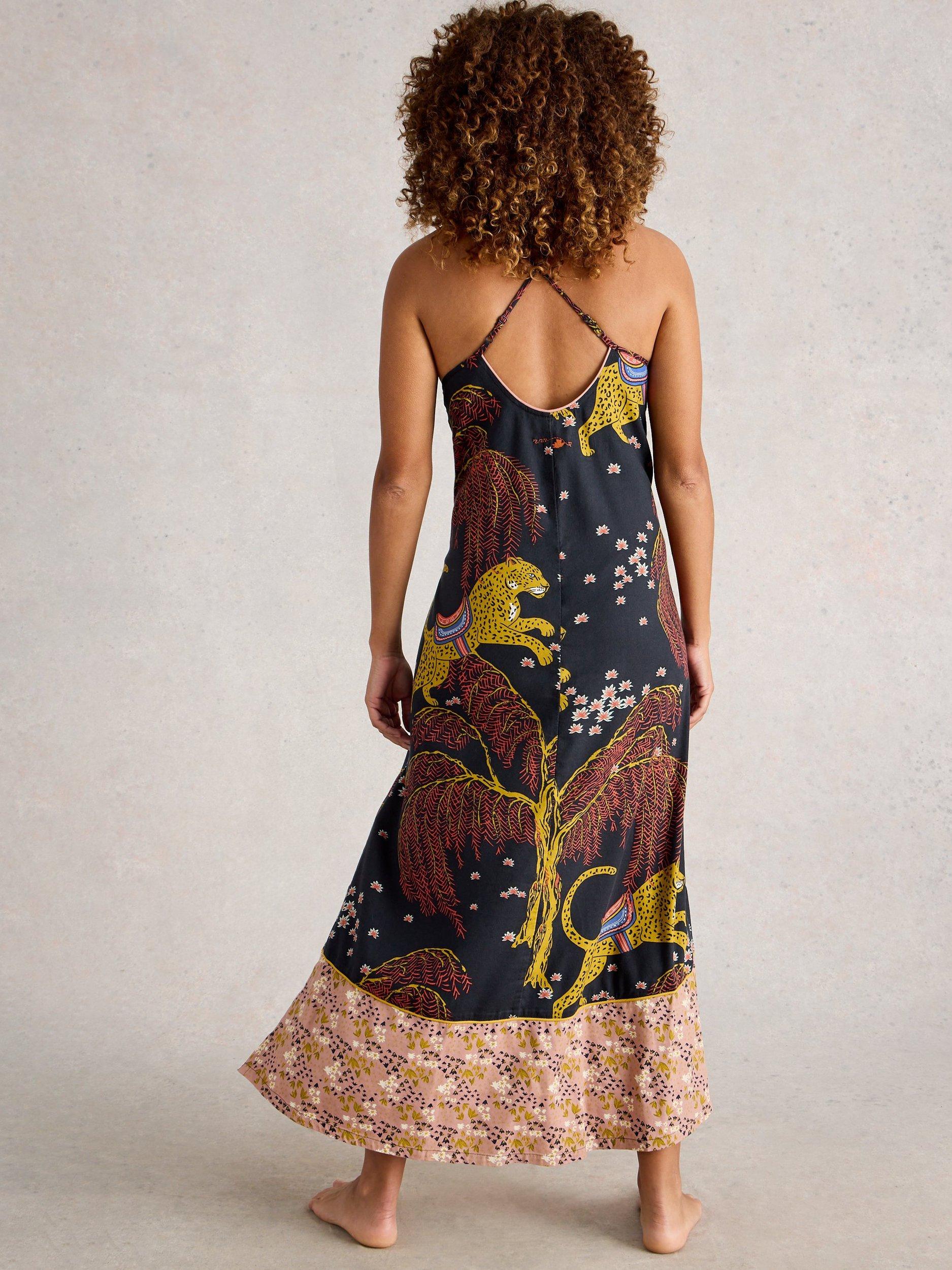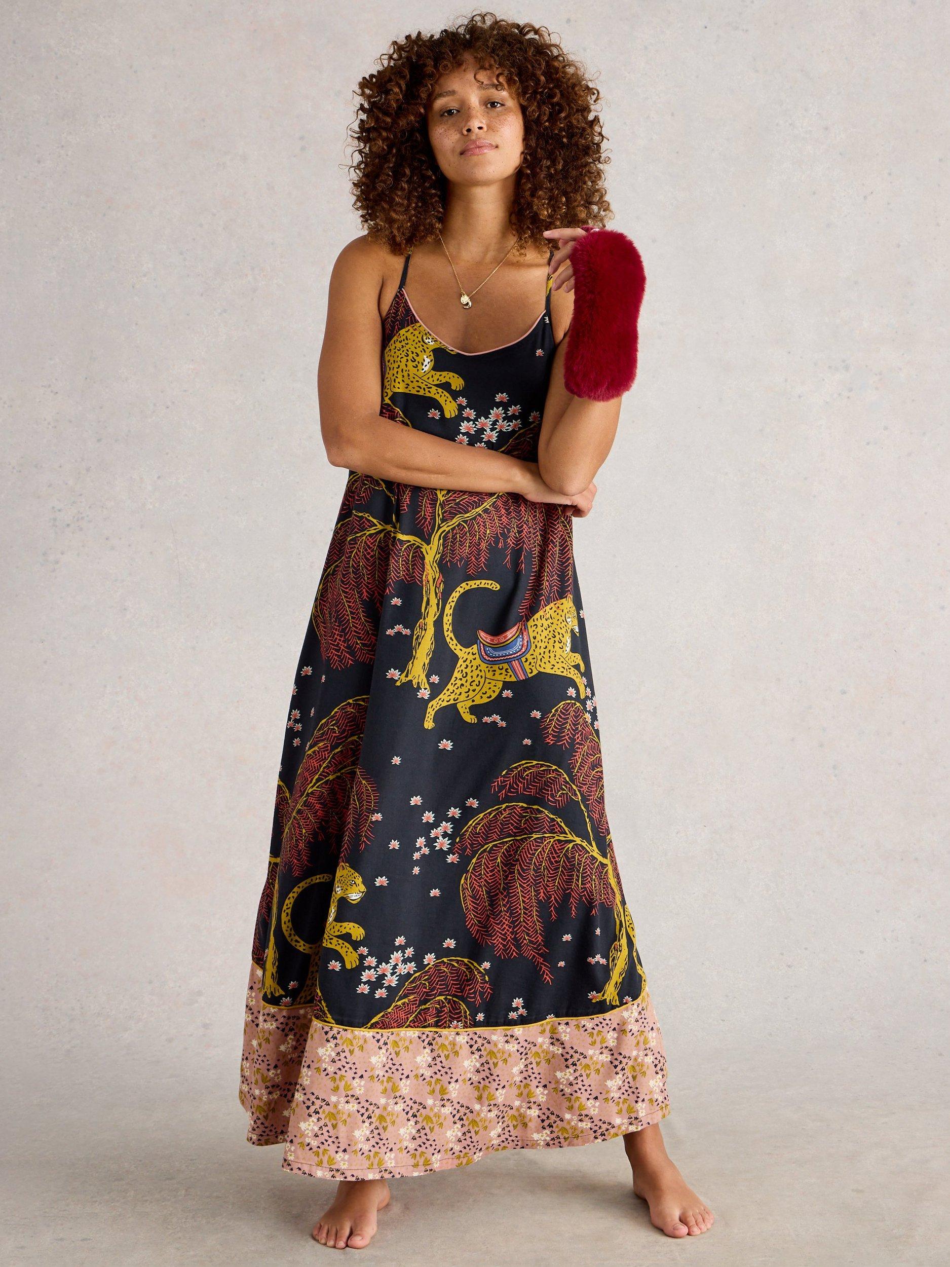 This maxi nightdress features a tiered shape, playful leaf and animal patterns, and a comfortable cotton blend. With spaghetti straps and a square neck, it offers an easy fit for relaxed evenings and a touch of fun to your night routine.