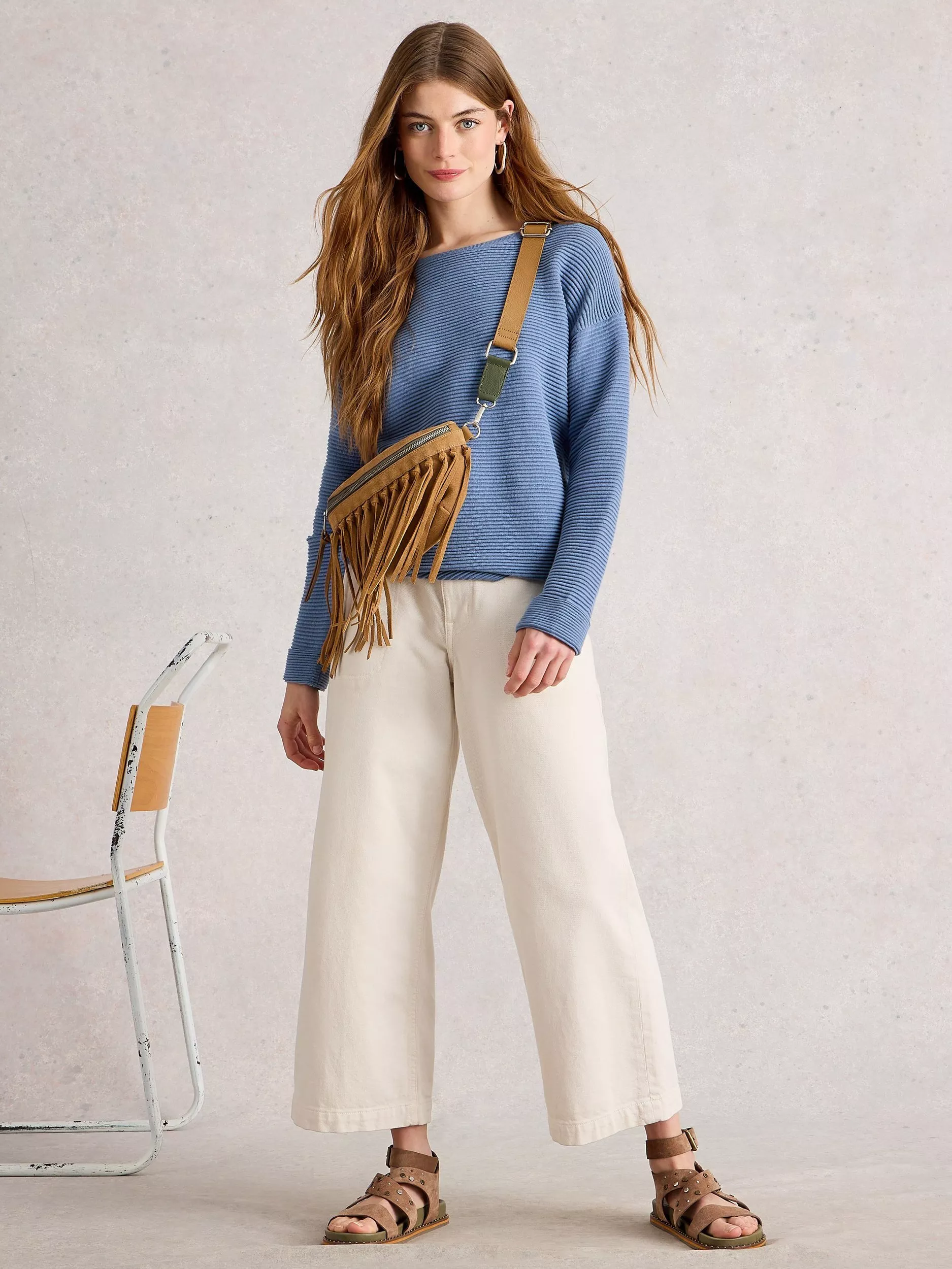 A slash neck, long sleeve jumper with a turned back cuff and a horizontal rib detail.