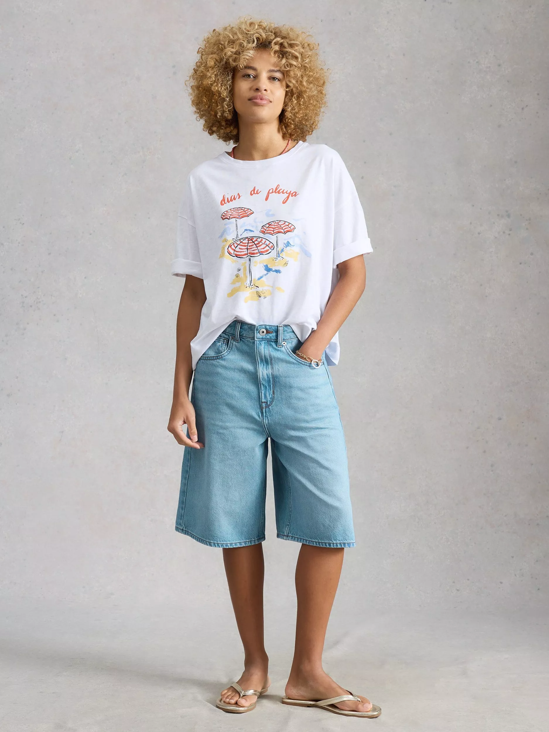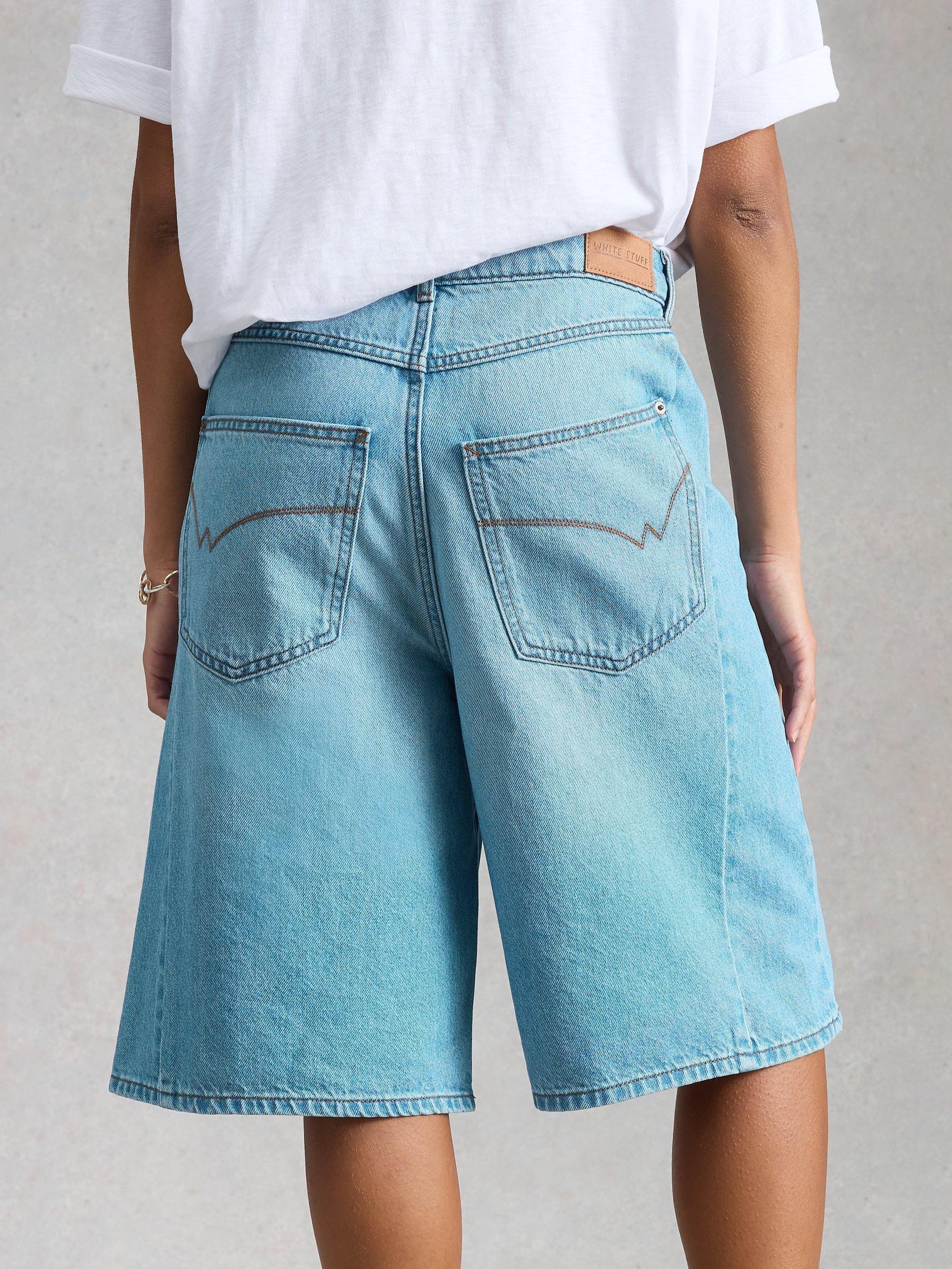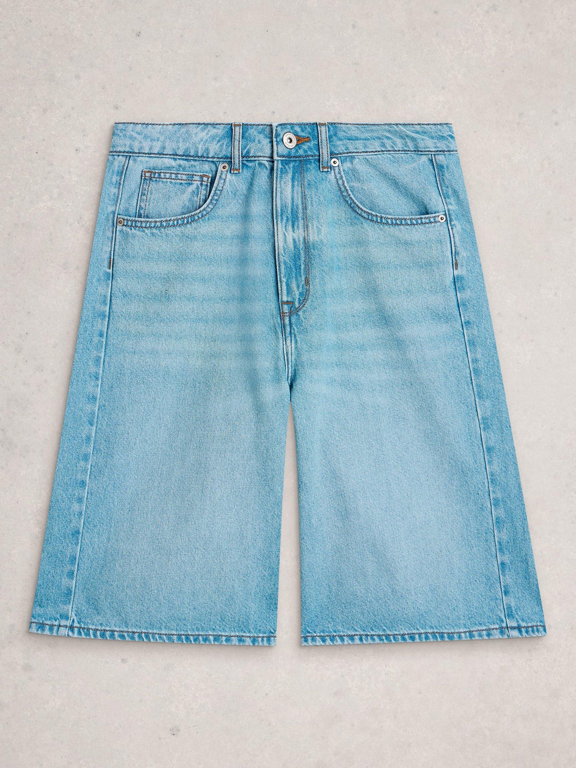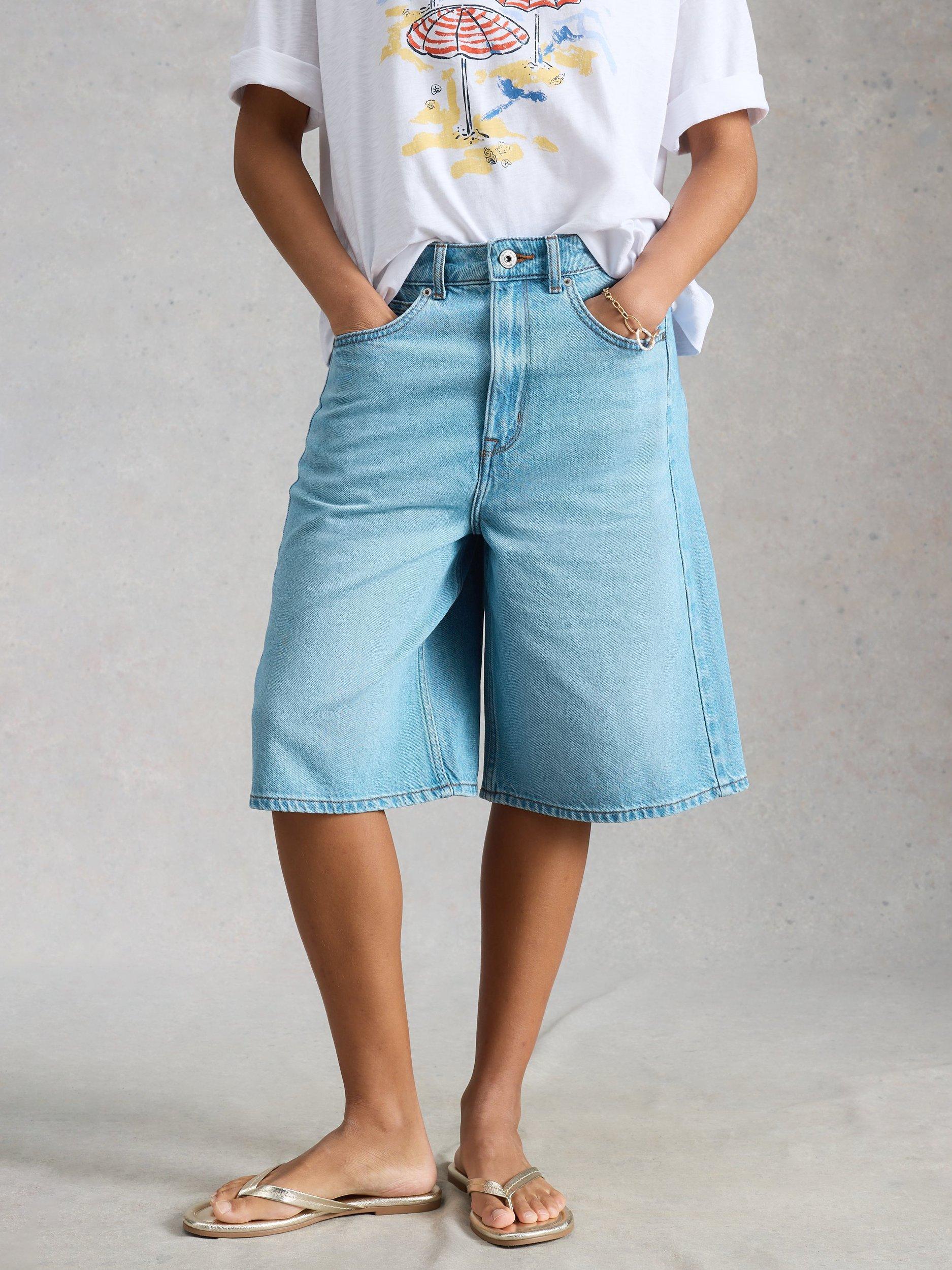 Denim shorts cut with a high rise for all-day ease, made from a soft cotton blend that stands up to warm, sunny days. A simple button and zip keeps things straightforward for summer outings.
