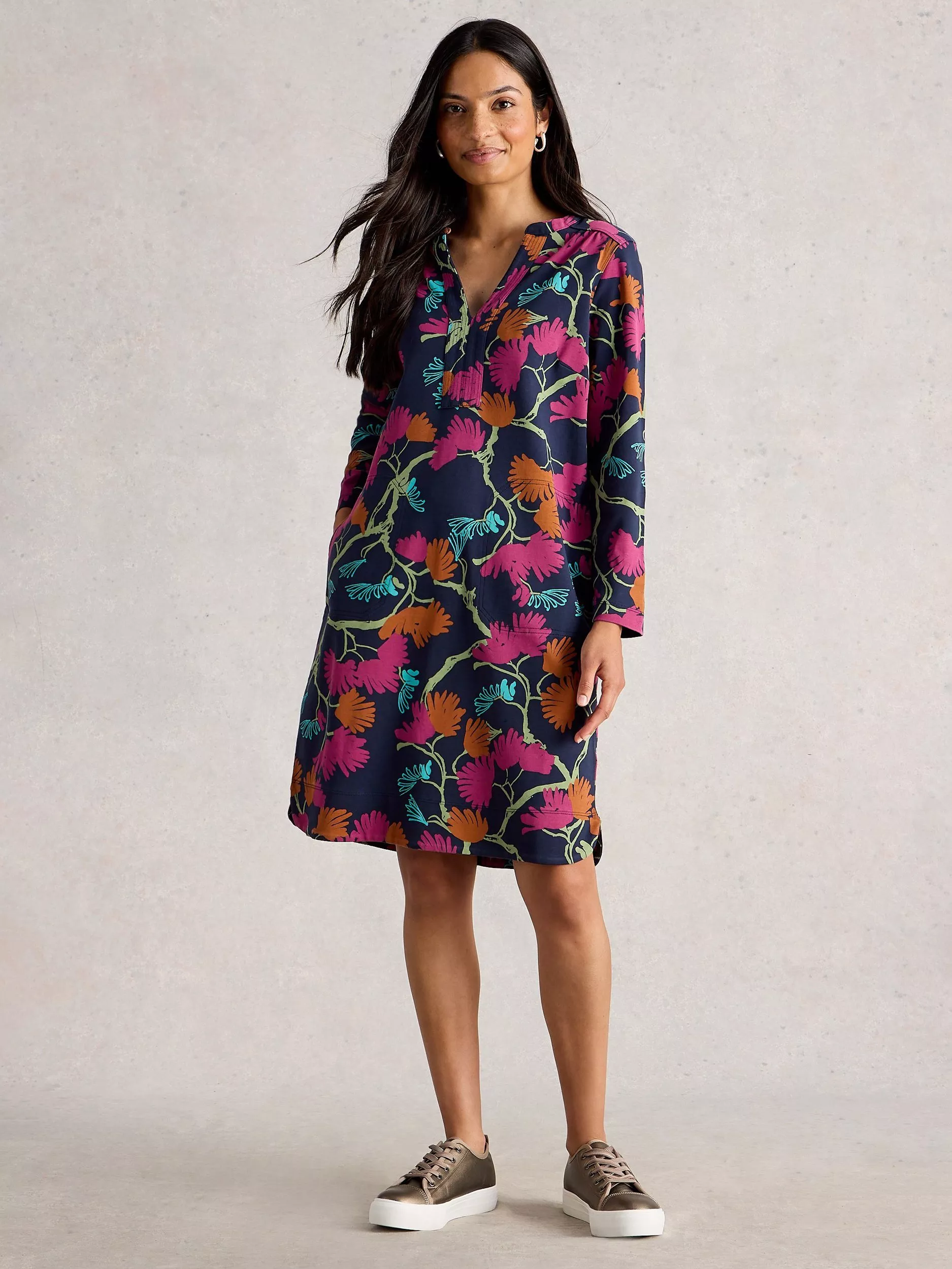 This knee-length straight dress, crafted from 100% cotton, brings comfort to your day. The playful leaves and trees pattern and V-neck offer a sharp look that feels right for work or weekend plans. Long sleeves for added ease.
