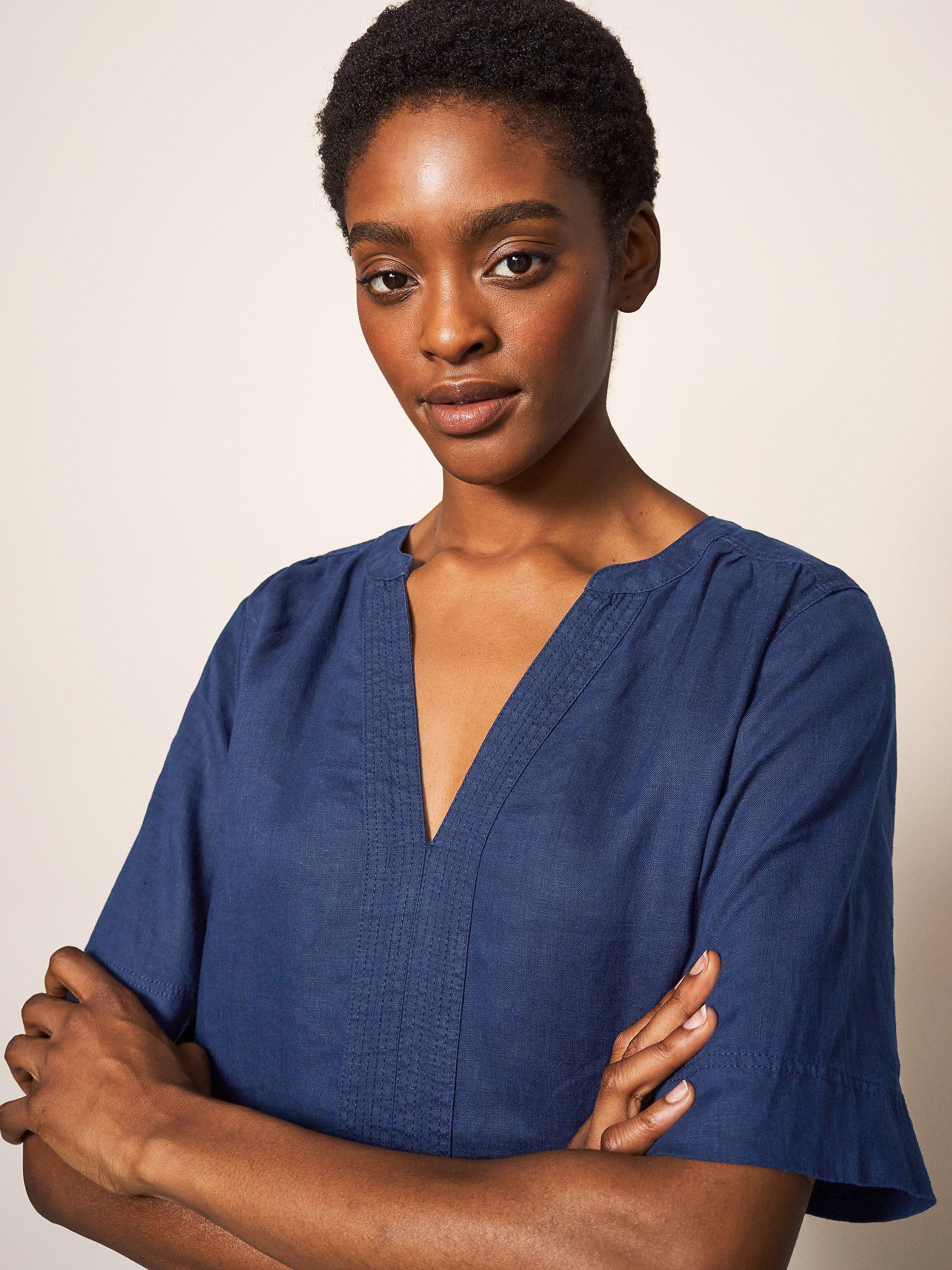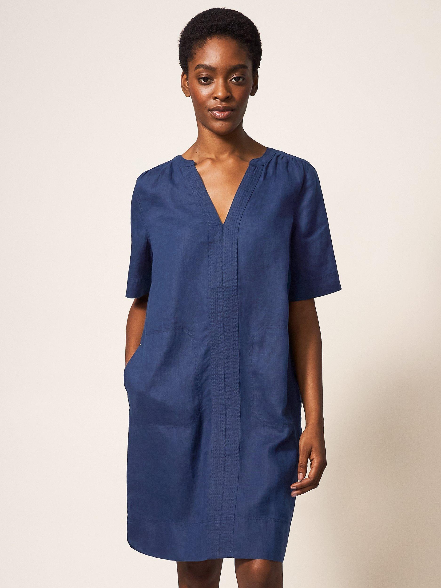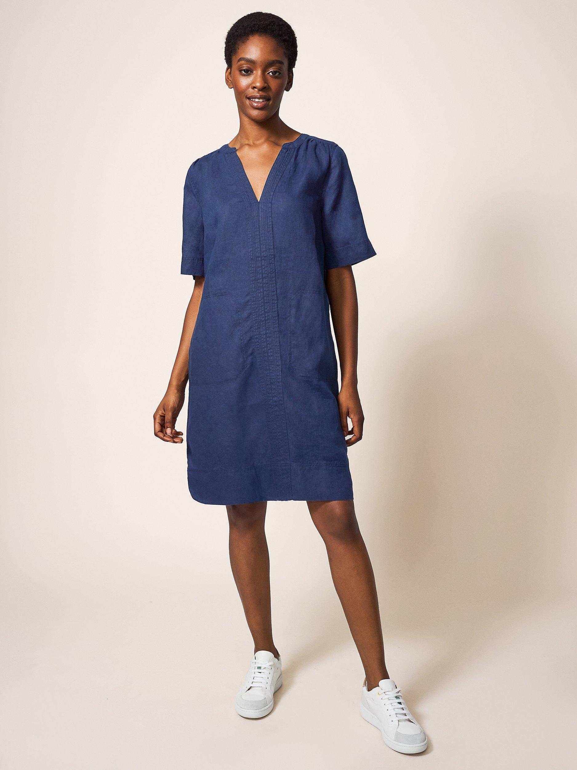 With a flattering v-neckline and elbow length sleeves, it has a lovely natural feel in pure linen and is a care-free option for daytime dressing.