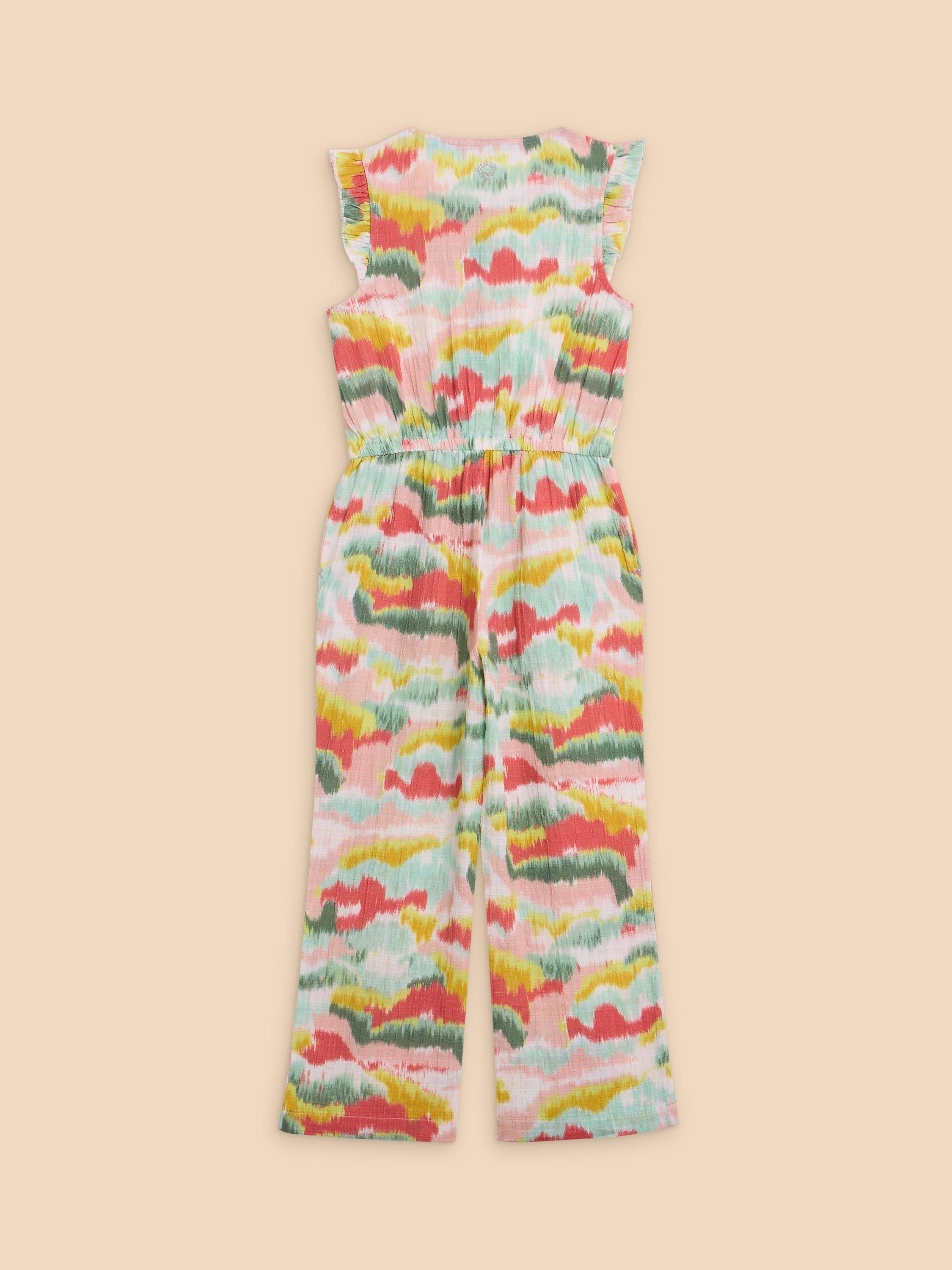 Made from 100% cotton for soft comfort, this tie-dye print jumpsuit is ideal for play. Sleeveless with frilled shoulders, it buttons up at the top and is secured with a draw-cord at the waist.