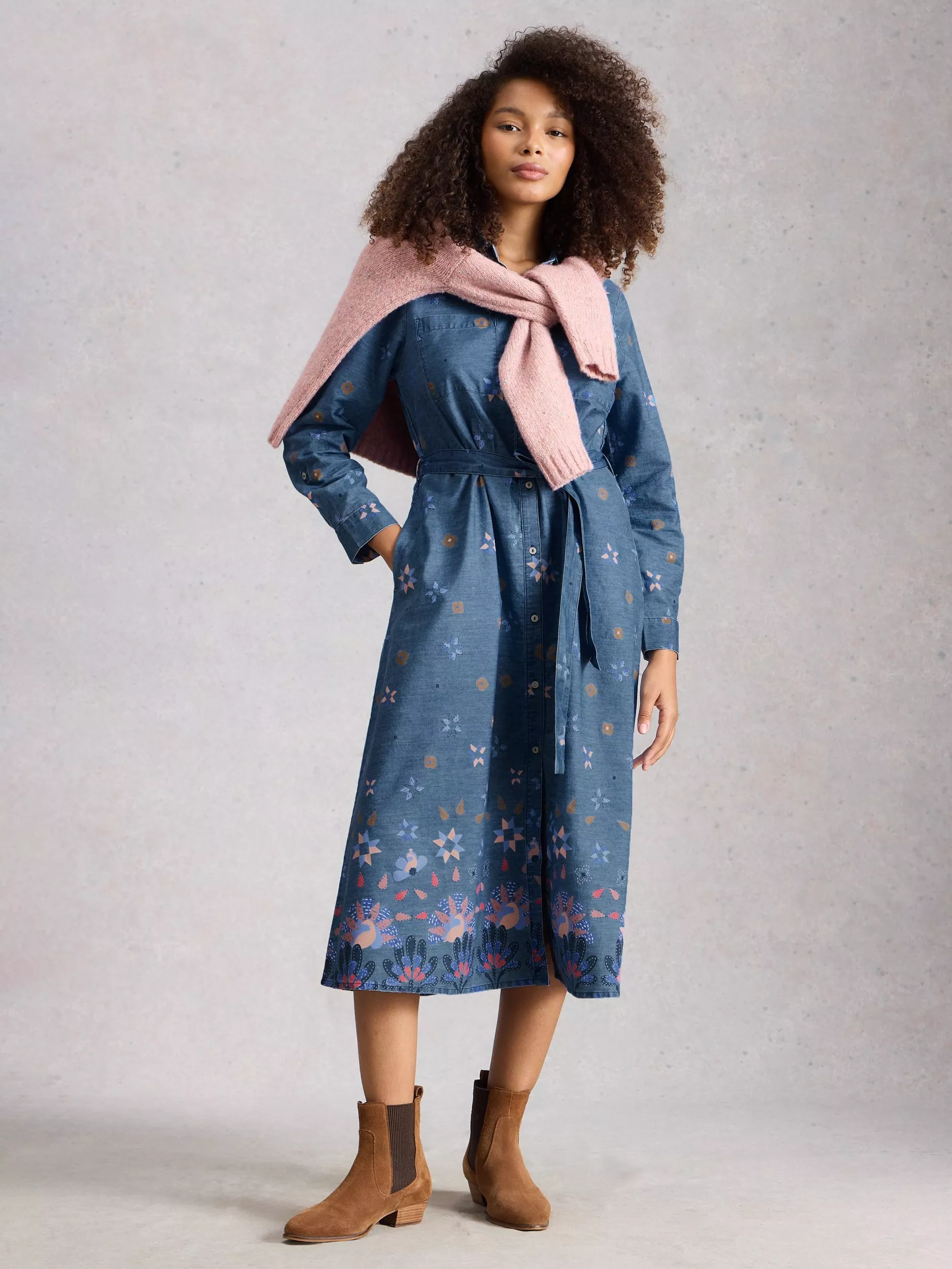 Button-down denim dress, collared neckline, long sleeves with cuffs, and chest pockets.