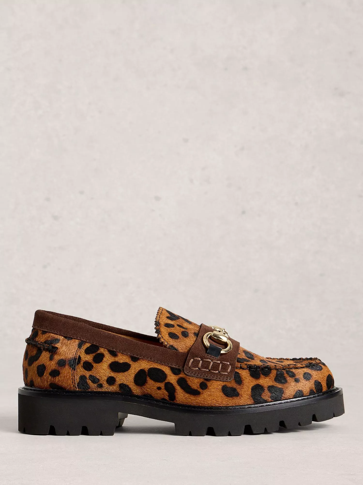 Leather loafers with a subtle animal pattern and easy slip-on design. The round, closed toe and low block heel make them perfect for everyday comfort, adding a sharp touch to your casual looks.