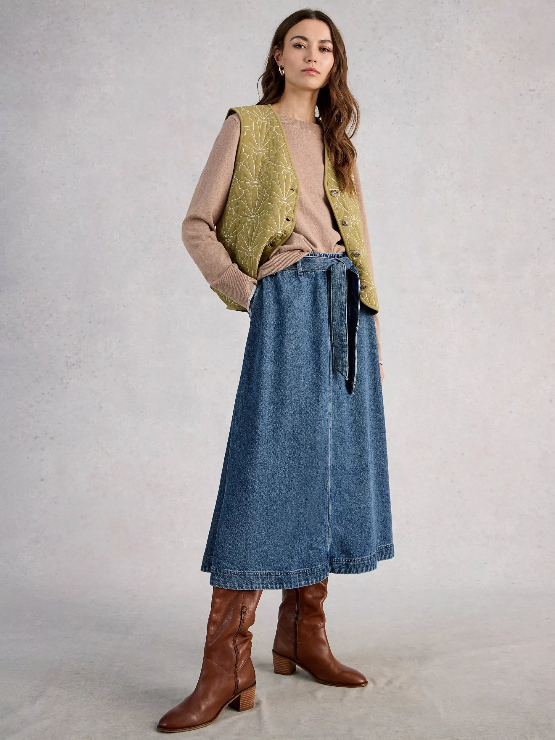 A midi skirt by White Stuff. Carved to a comfortable A-line, it's cut from denim and finished with a tie waist detail.