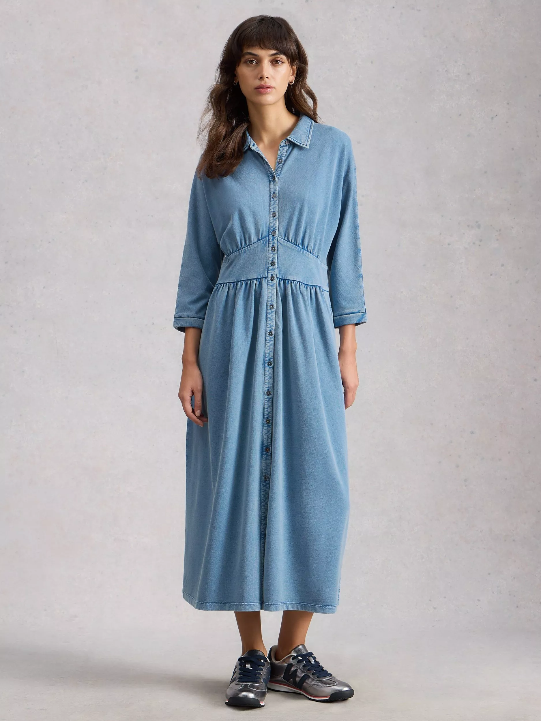 You can never go wrong with a shirt dress. This long sleeved pure cotton midi dress from White Stuff is framed with a collar whilst the plain design means it goes with everything.