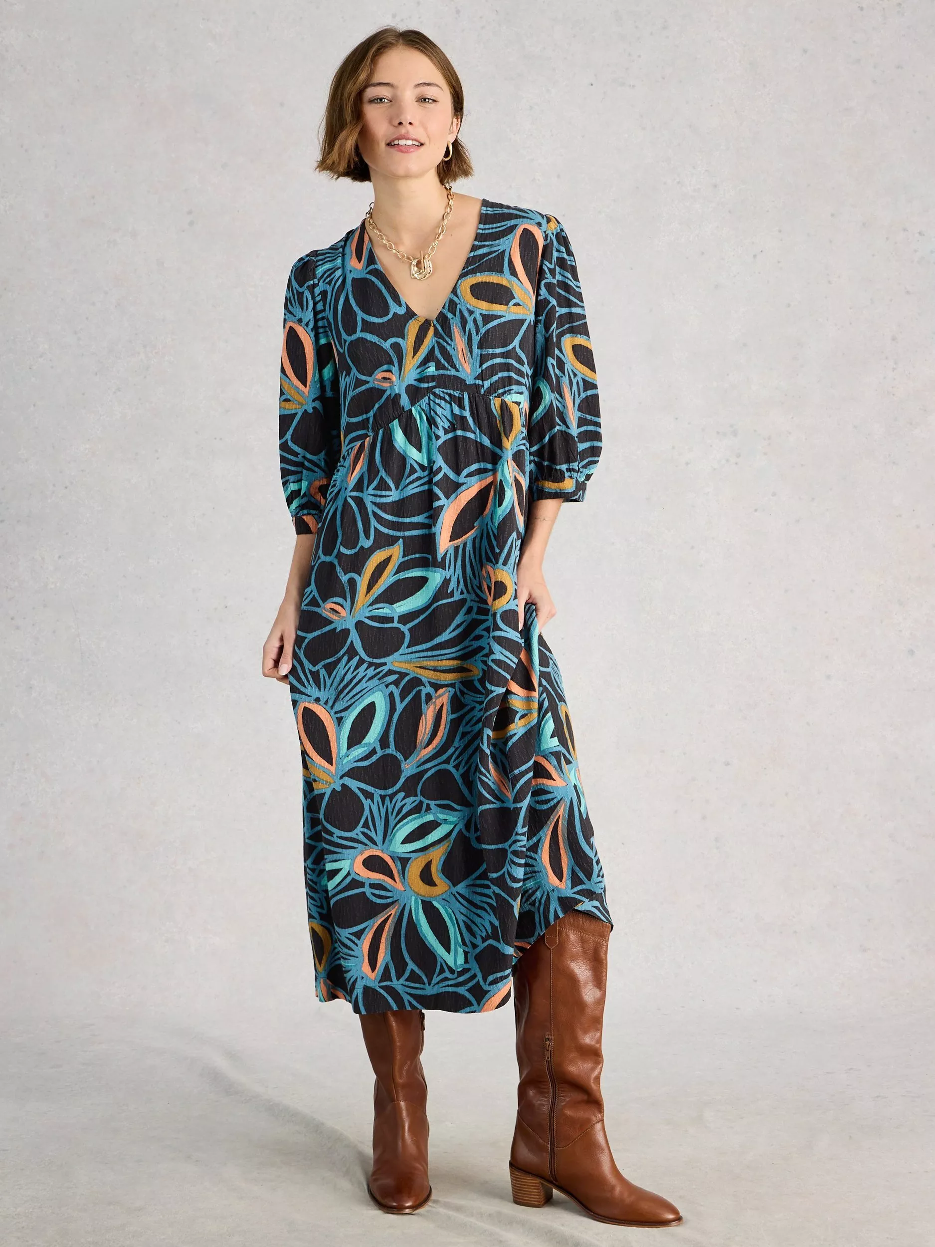 White StuffLucy Abstract Midi Dress containing LENZING™ ECOVERO™ Viscose, Black/Multi