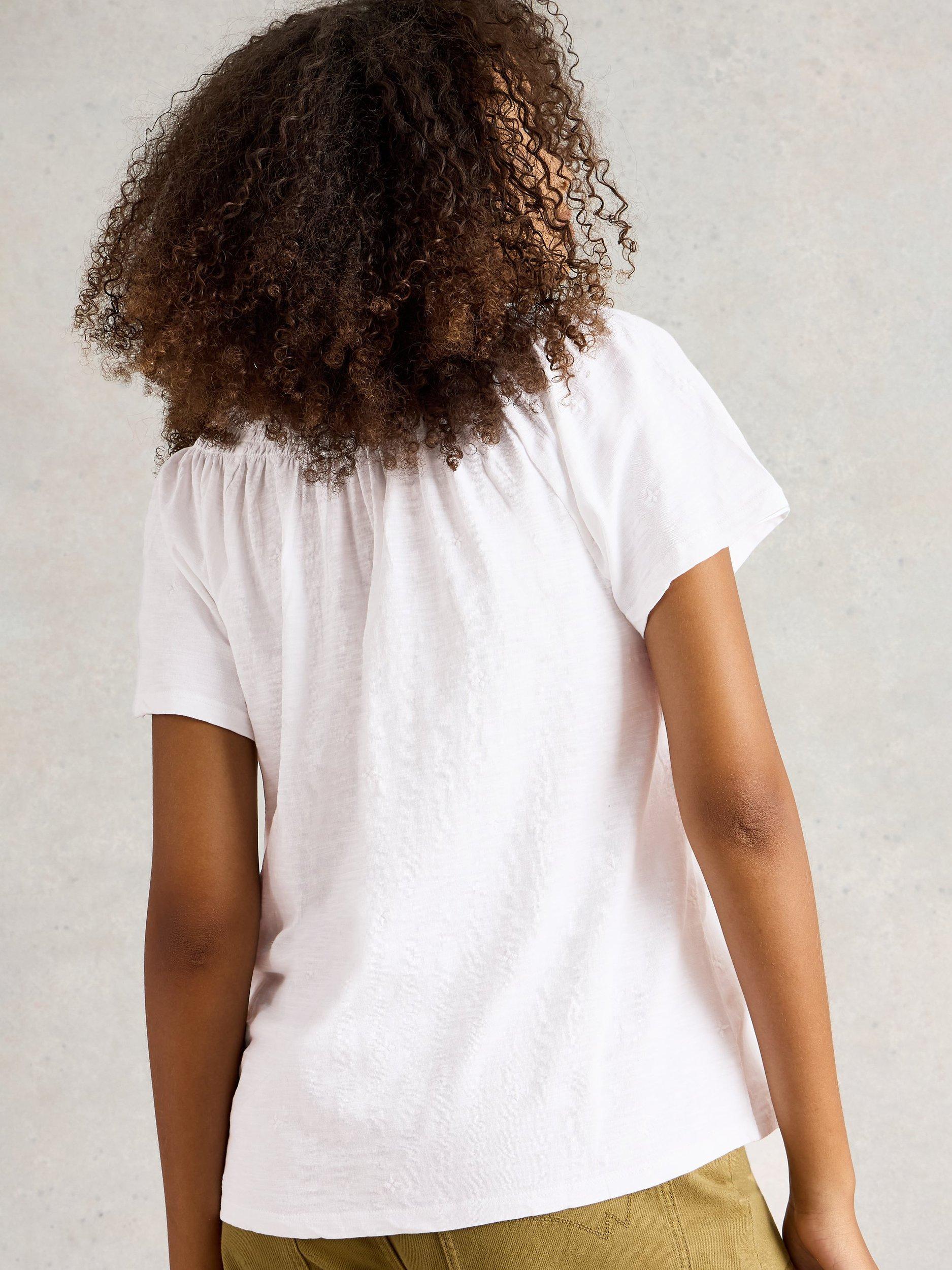 A short sleeve embroidered blouse with a gauze fabric on the centre front and a notch neckline.