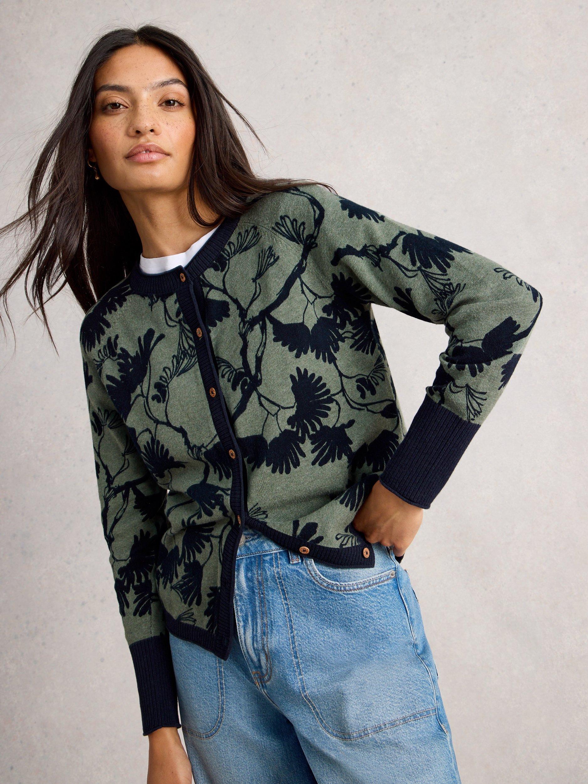 This fine knit cardigan combines playful leaf motifs with clever detailing, offering warmth and comfort that suits every moment. Its practical buttons and round neck make layering easy.