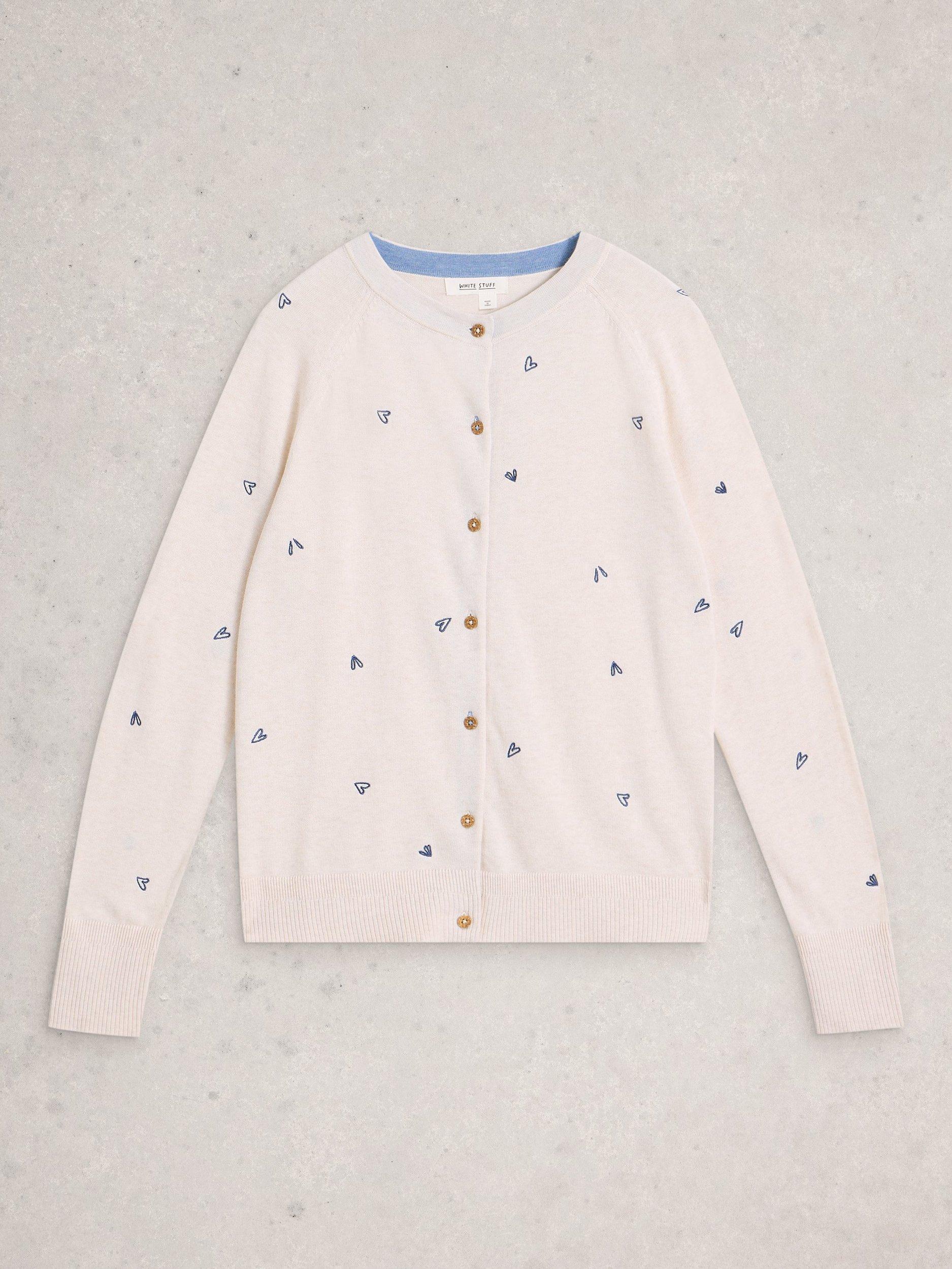 Throw this colourful cardi on when the sun goes in. (Or when it refuses to come out.) Covered in a heart print and made from a warm wool blend.